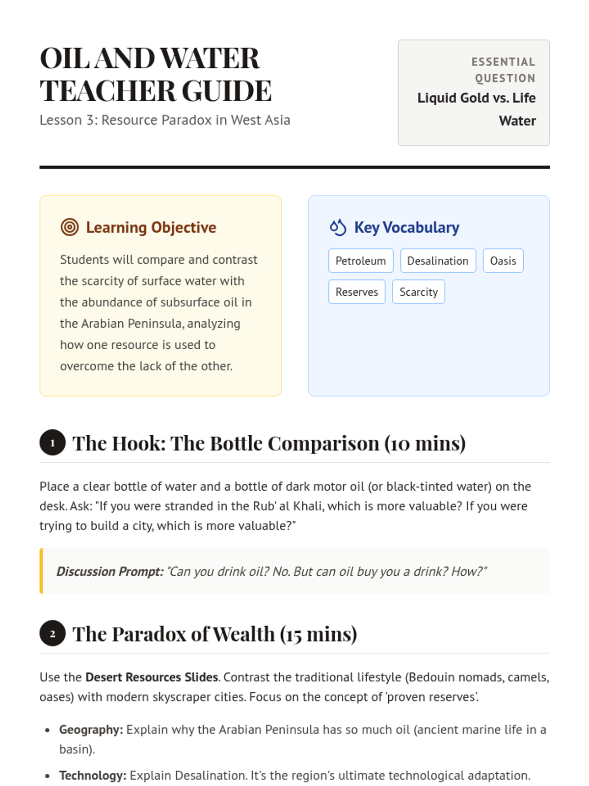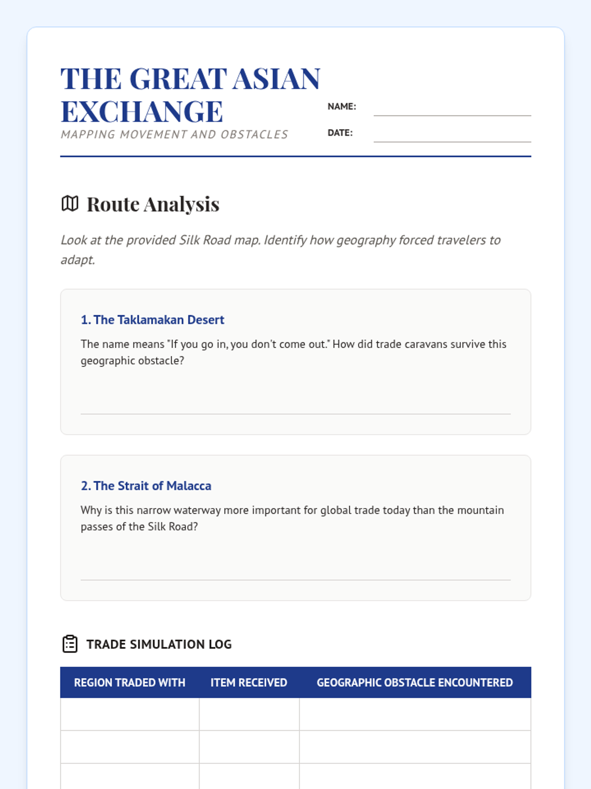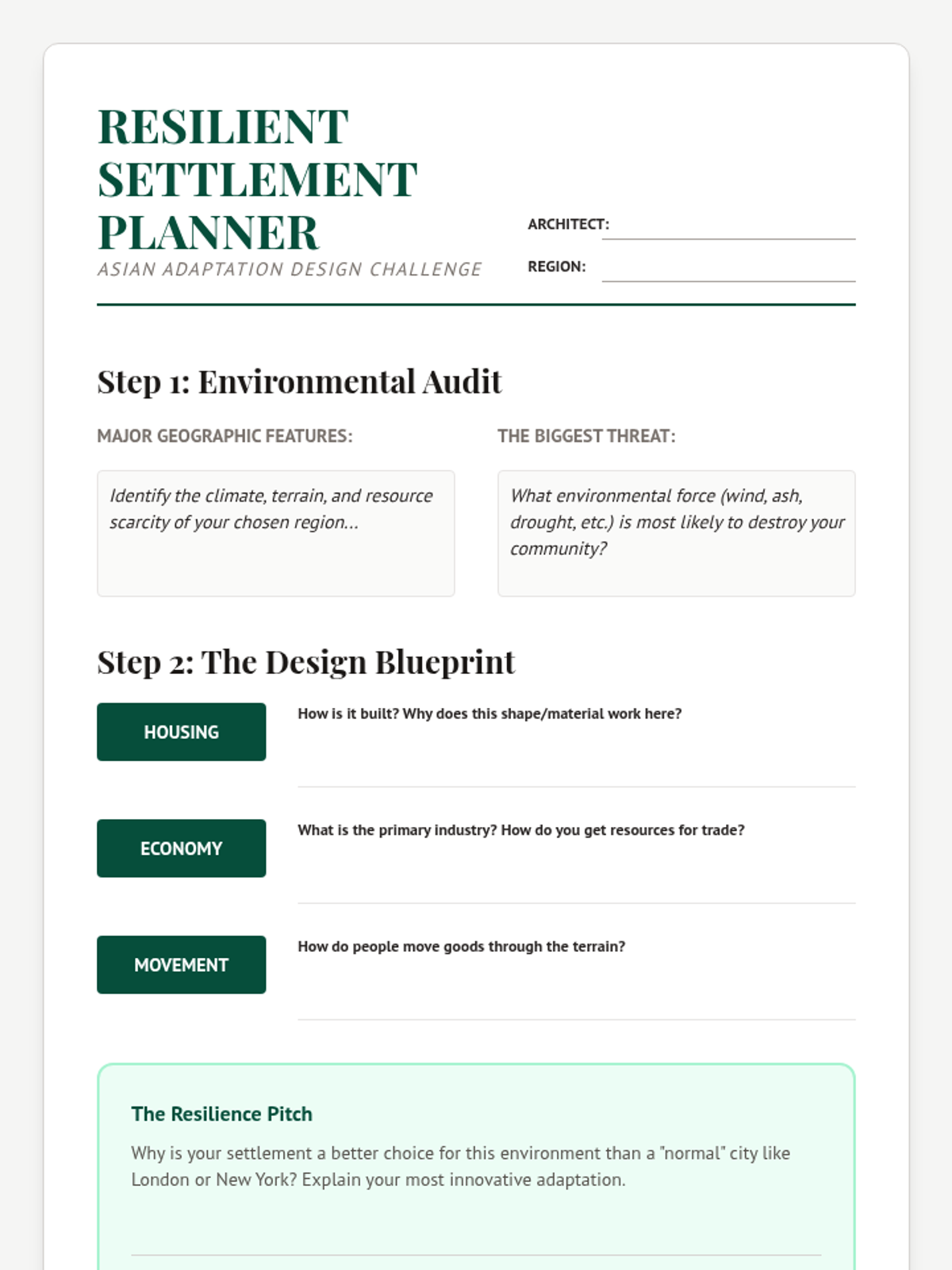 A 5-lesson sequence for 6th Grade Social Studies exploring human-environment interaction across Asia. Students analyze how communities adapt their lifestyles and economies to diverse geographic features like steppes, archipelagos, and deserts.