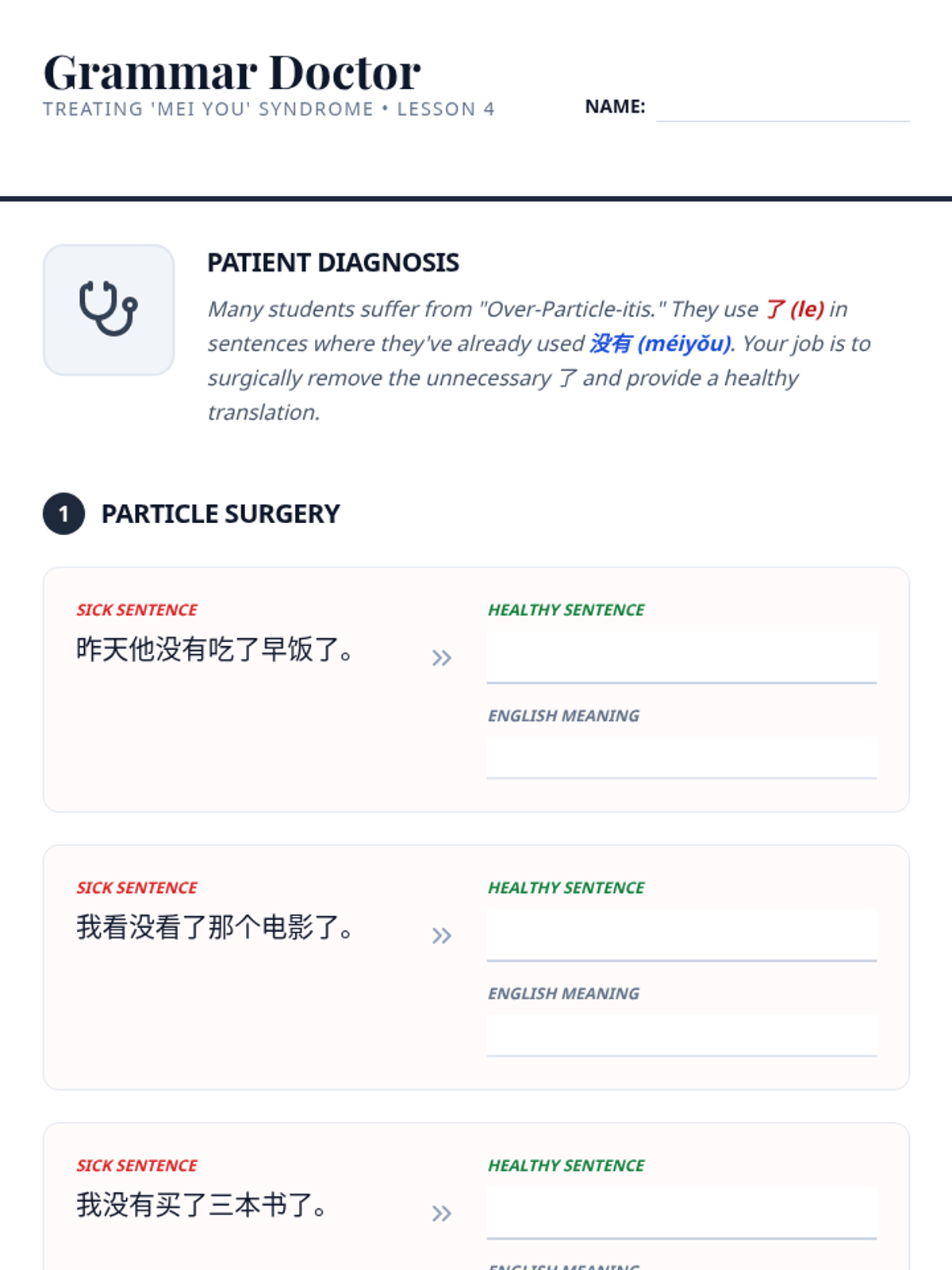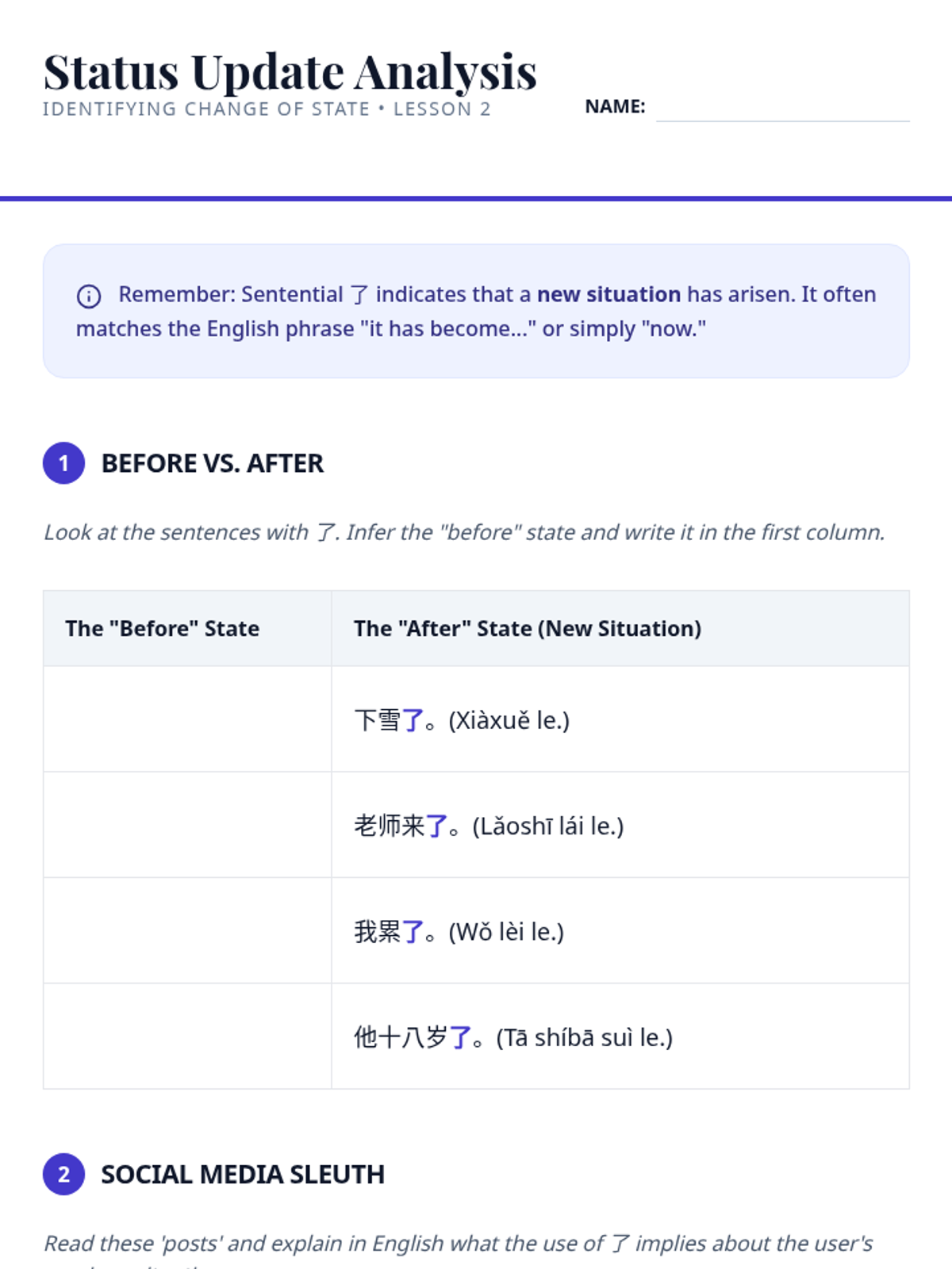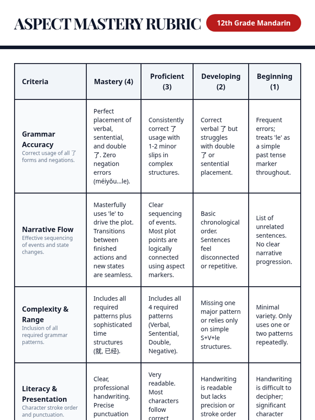 A comprehensive sequence for 12th-grade Mandarin students focusing on the versatile particle 'le'. Students will master its use for marking completed actions, changes of state, and duration while developing narrative skills through aspect-based storytelling.