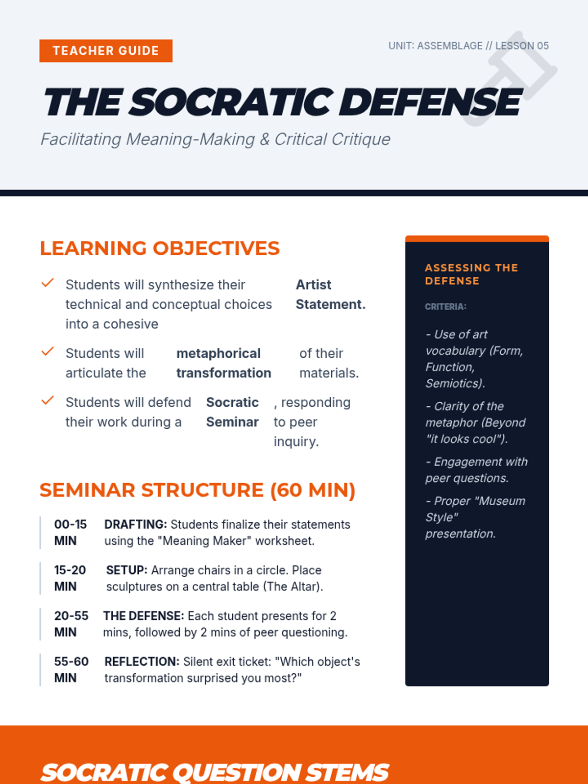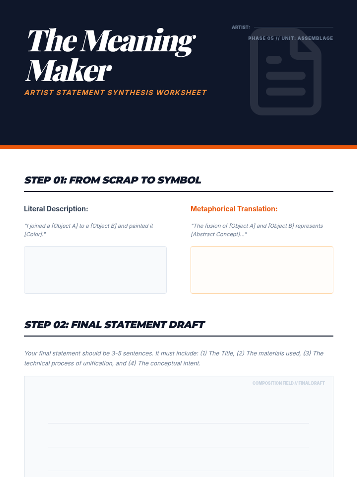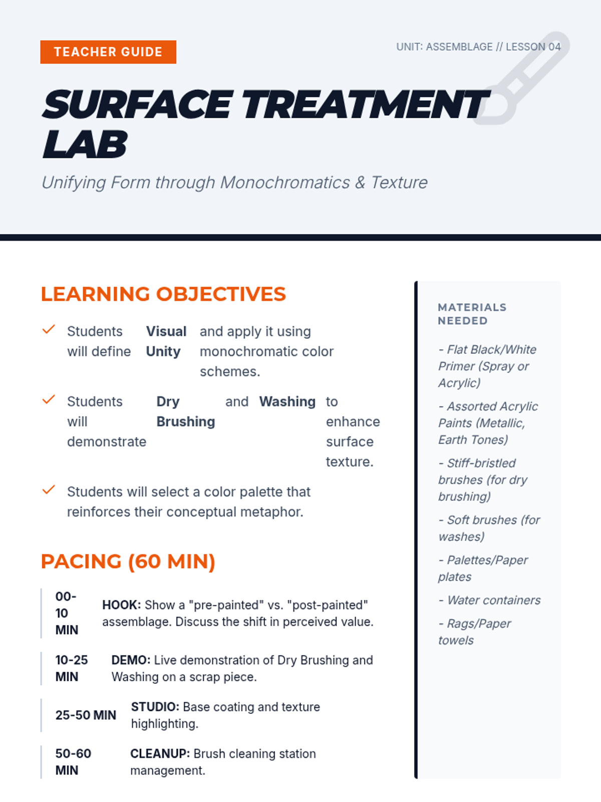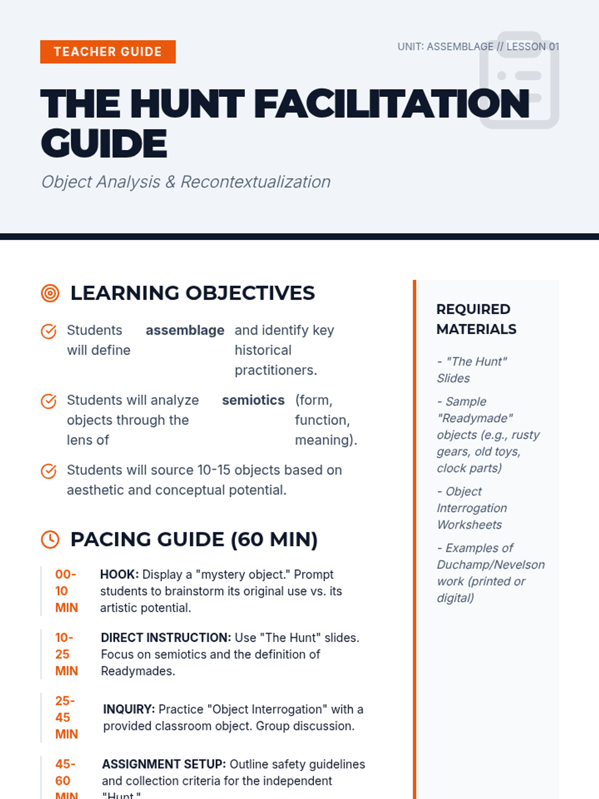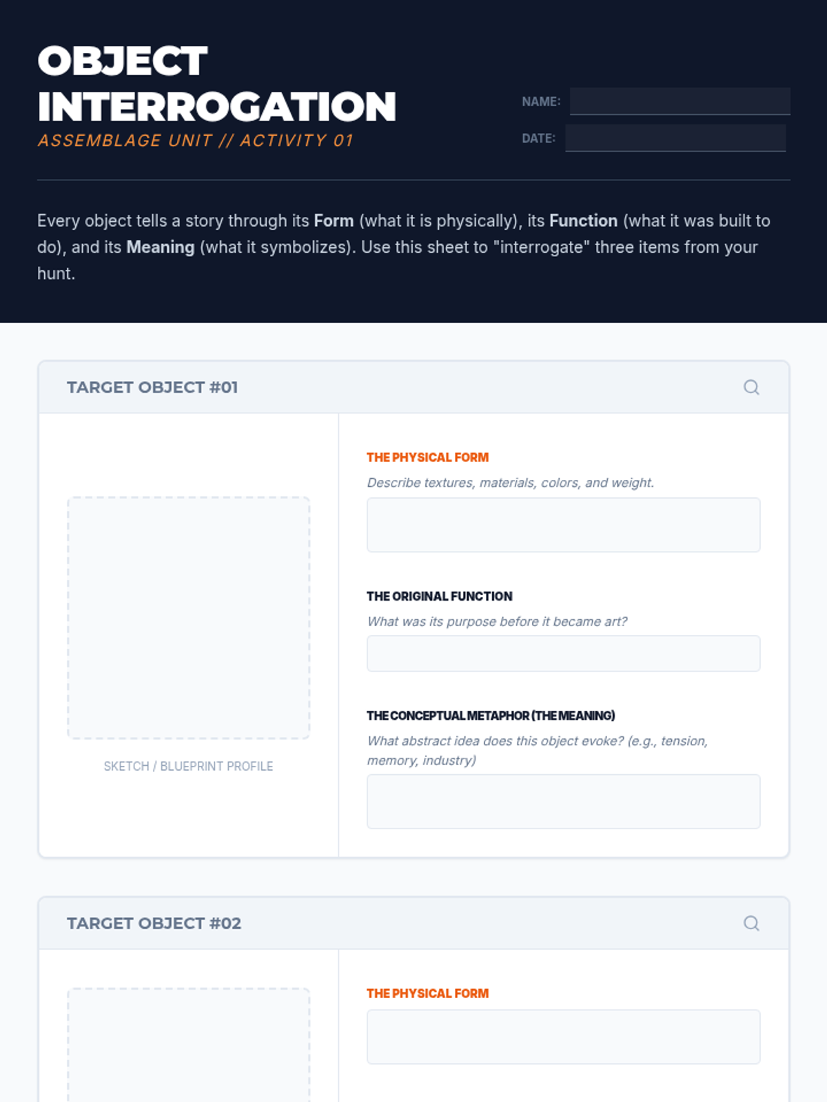 A comprehensive 10th-grade sculpture unit exploring the conceptual and technical aspects of assemblage art, focusing on recontextualizing found objects to create new meaning.