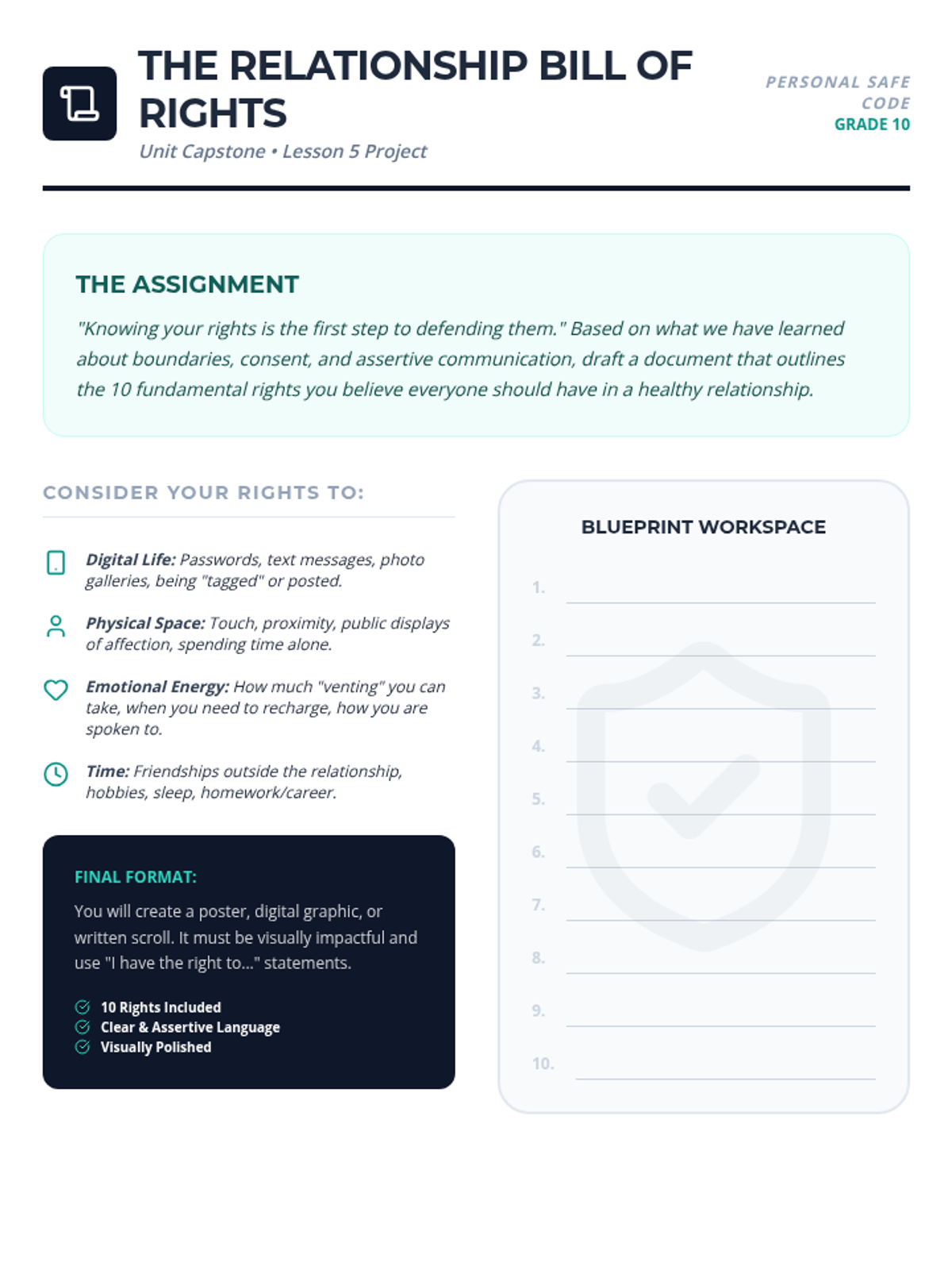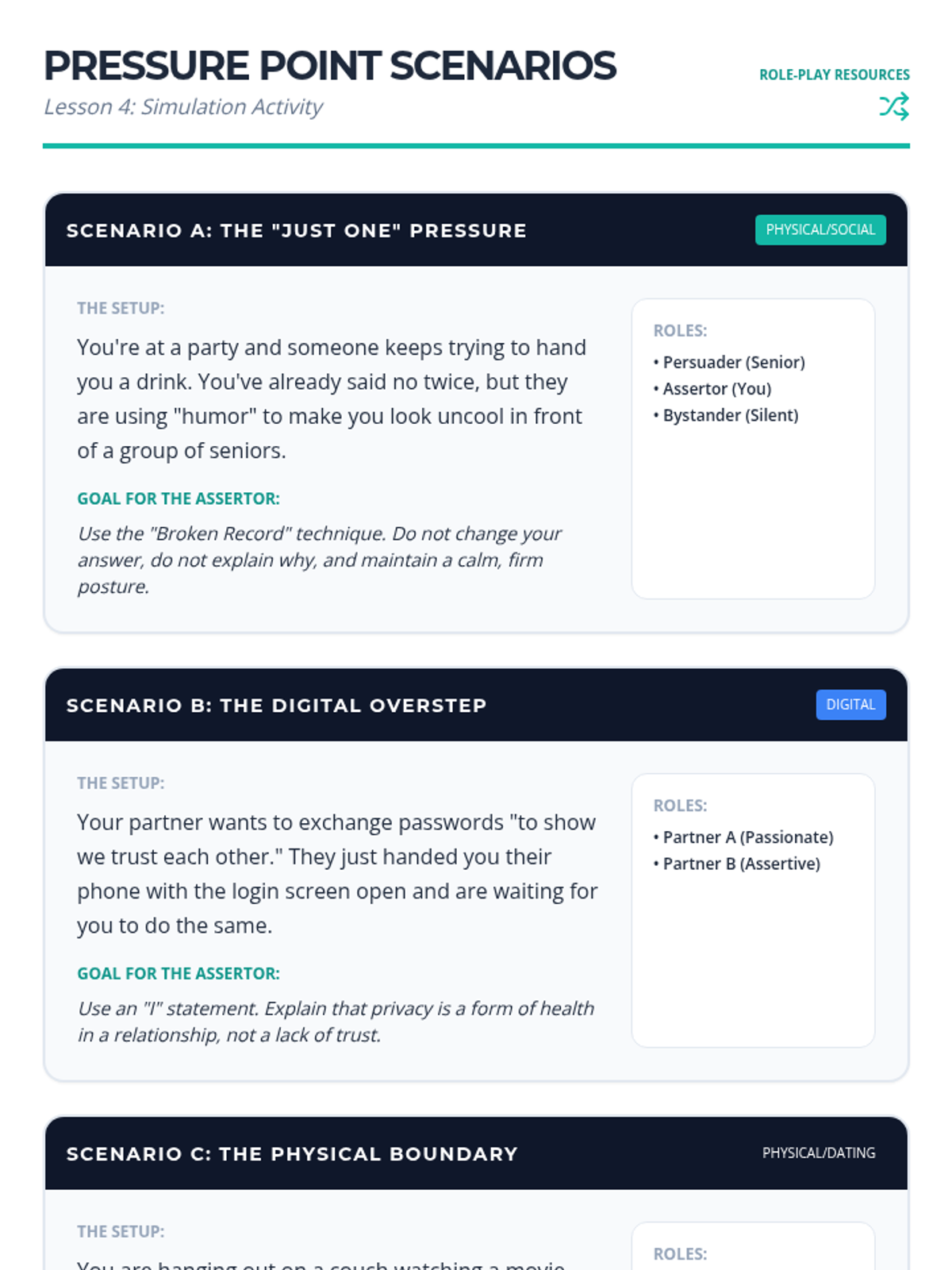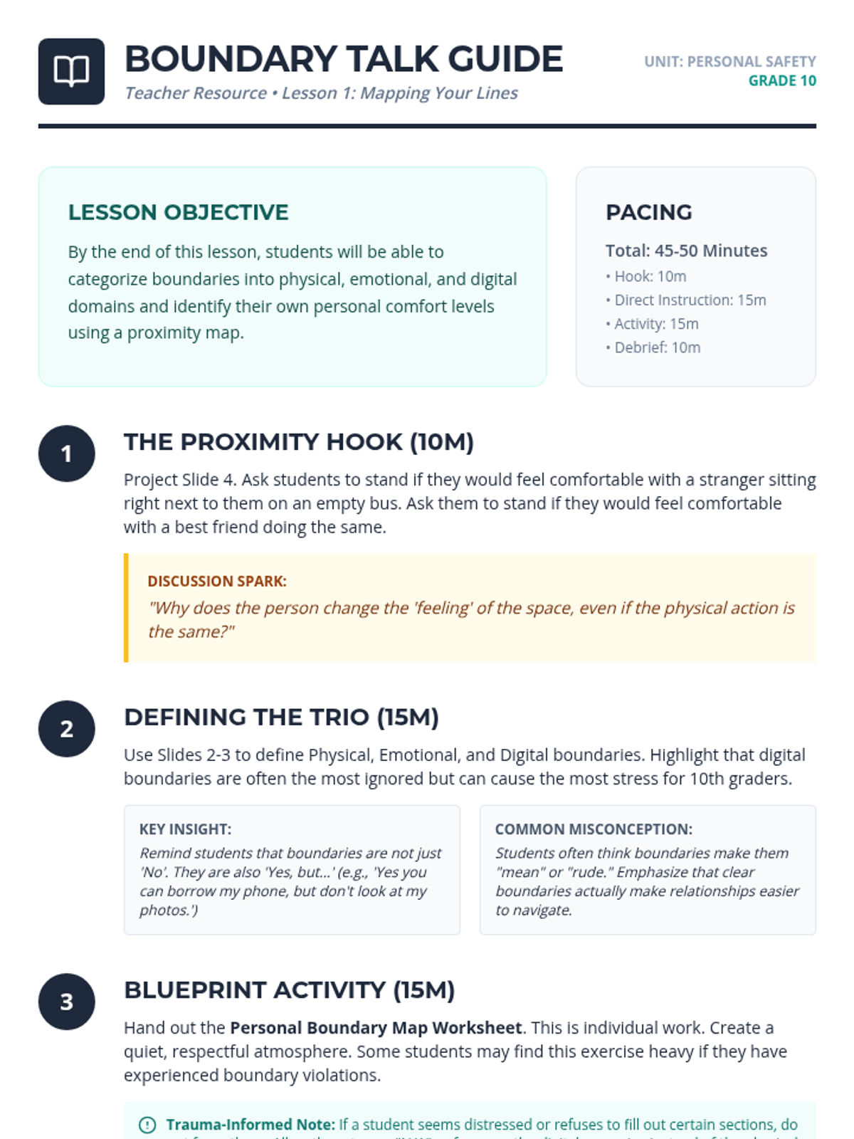 This sequence equips 10th-grade students with the communication tools and self-awareness needed to establish, maintain, and respect personal boundaries. Students move from theoretical definitions to active skill-building, culminating in simulations that practice navigating complex social pressures with assertiveness and empathy.