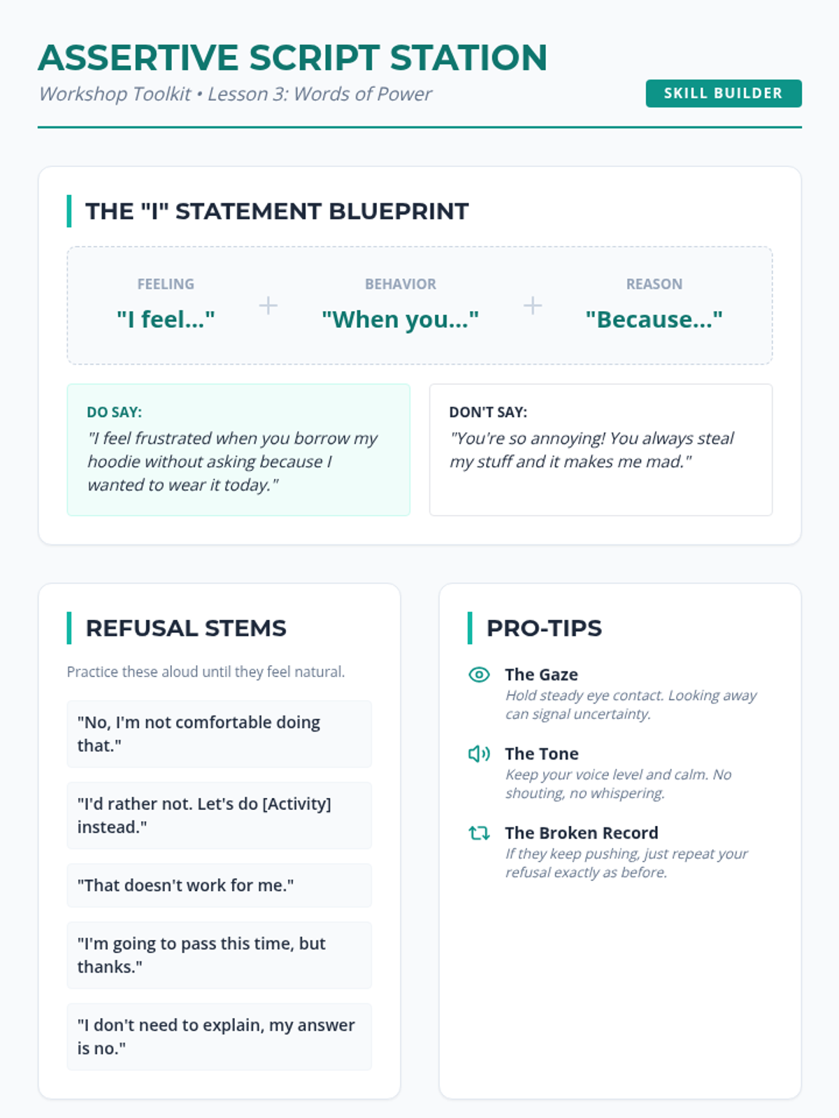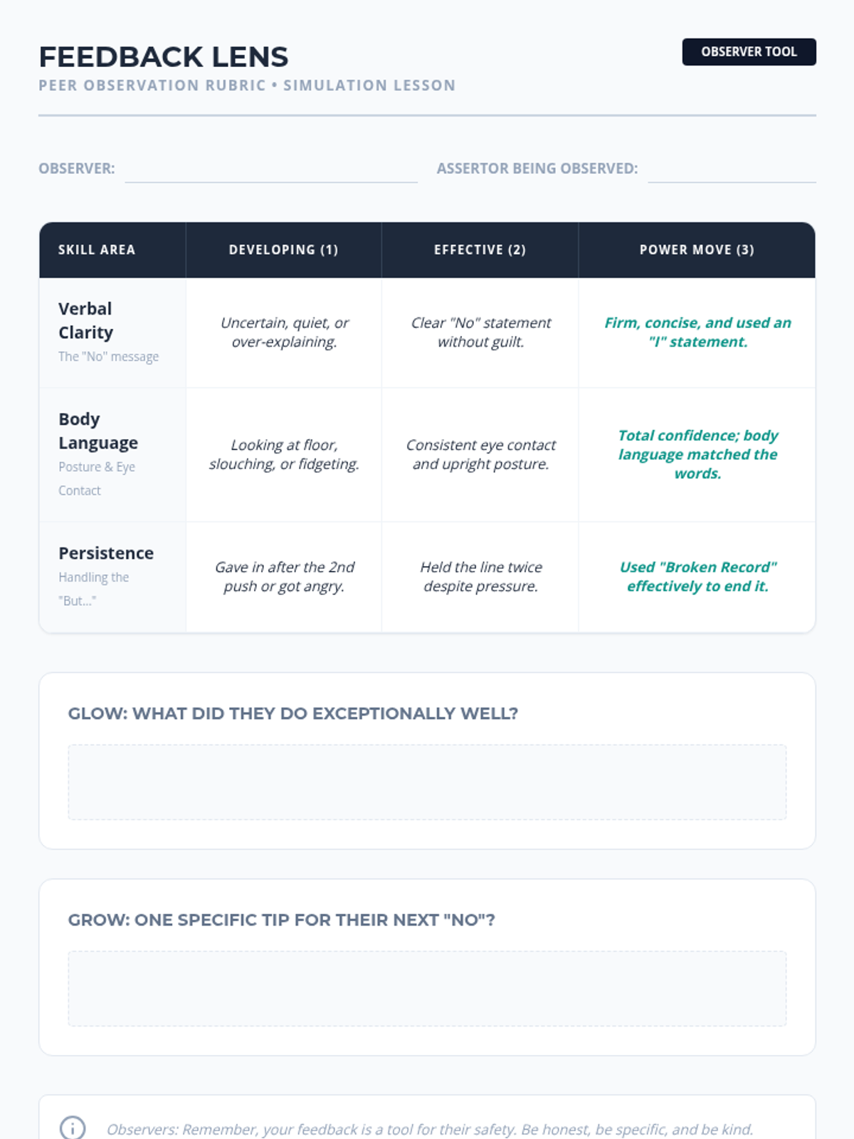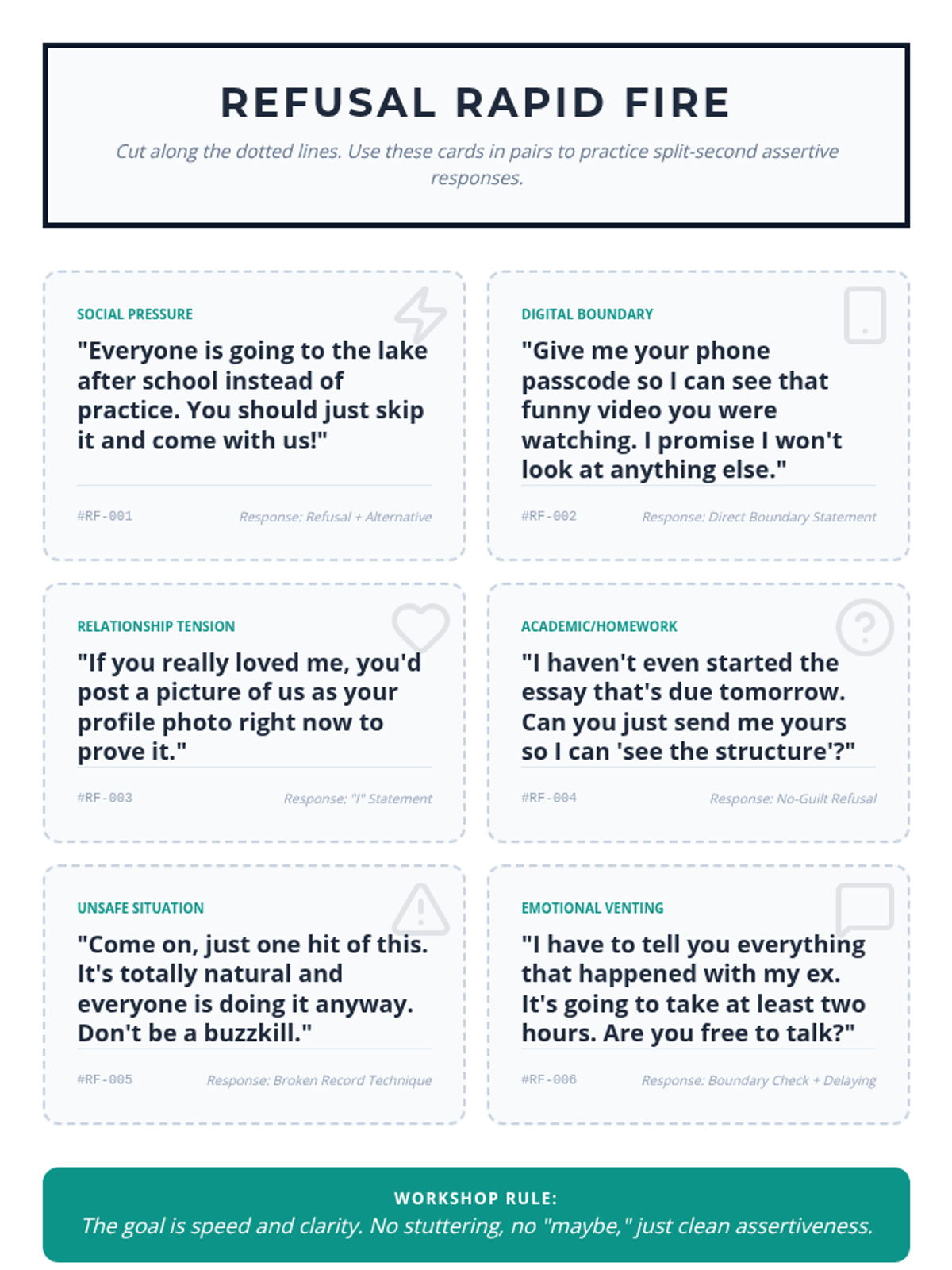 This sequence equips 10th-grade students with the communication tools and self-awareness needed to establish, maintain, and respect personal boundaries. Students move from theoretical definitions to active skill-building, culminating in simulations that practice navigating complex social pressures with assertiveness and empathy.