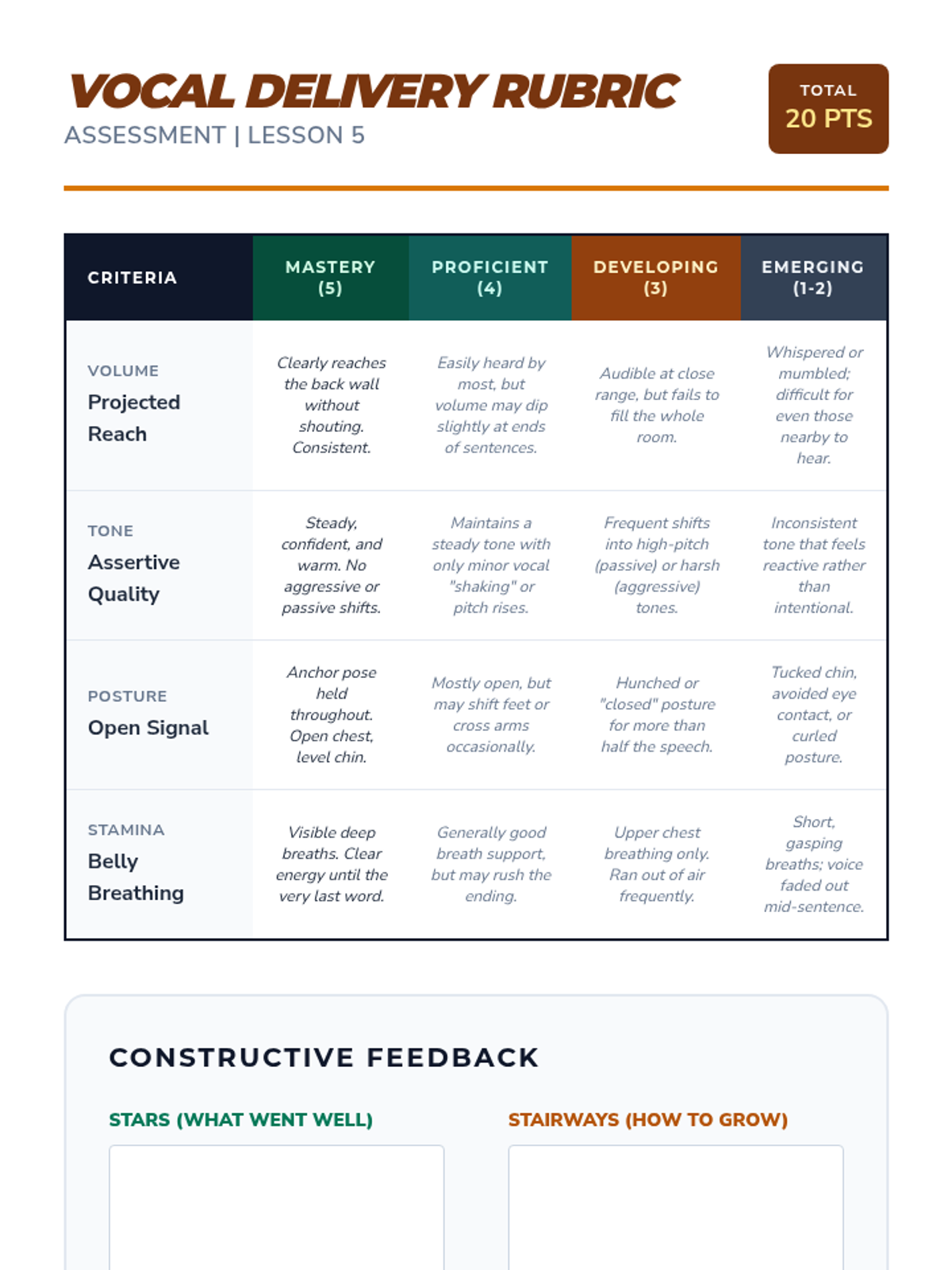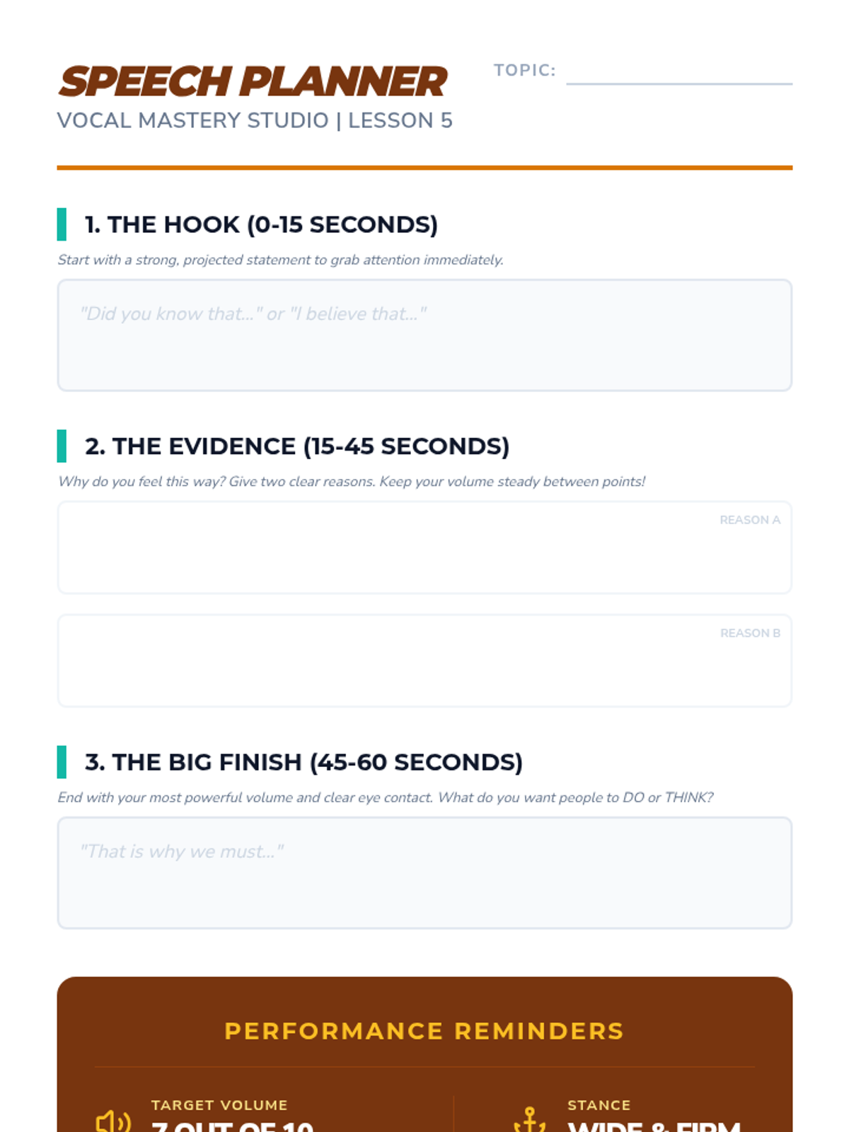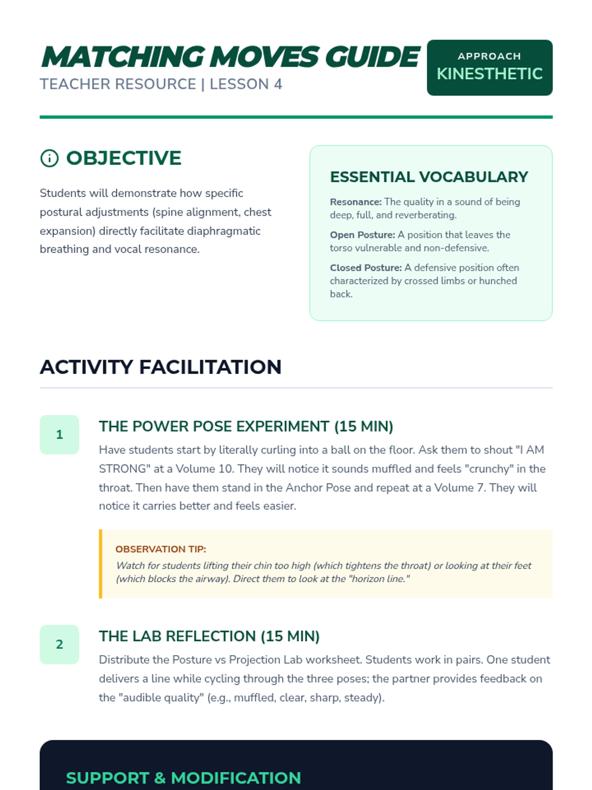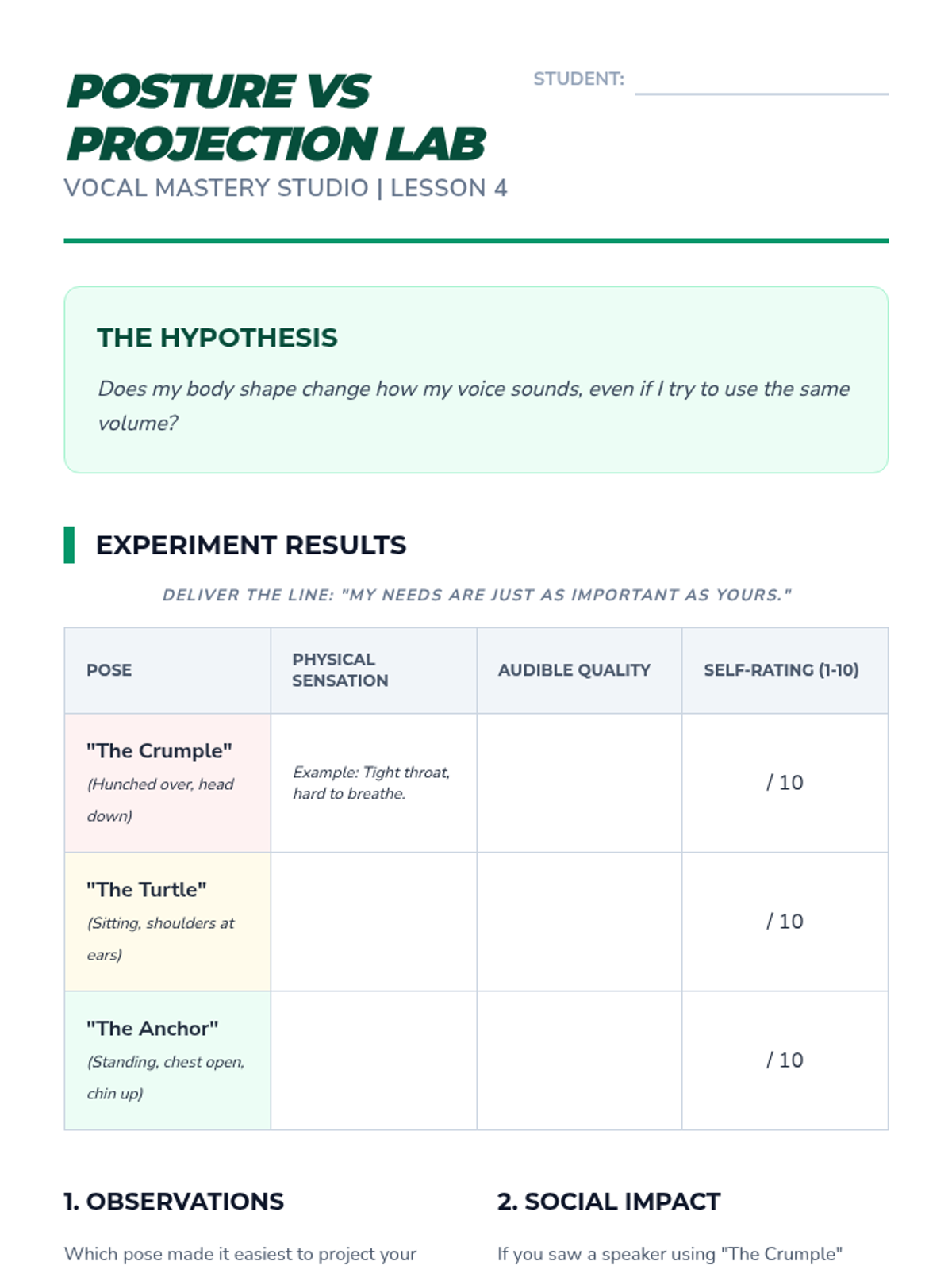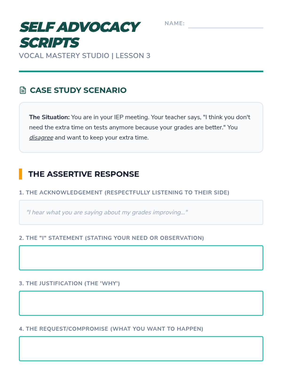This sequence focuses on the distinction between aggressive shouting and assertive projection. Students learn to use their voice effectively for self-advocacy in various settings, from IEP meetings to public speaking, ensuring they are heard and respected.