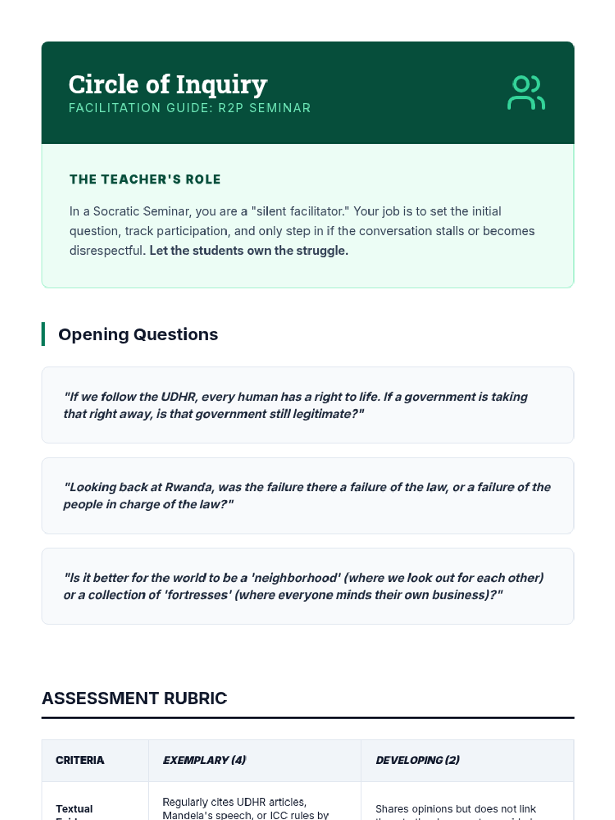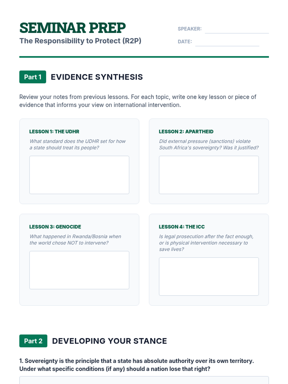 A 9th-grade sequence exploring the development of international human rights standards, historical violations in South Africa, Rwanda, and Bosnia, and the global mechanisms for justice and intervention.
