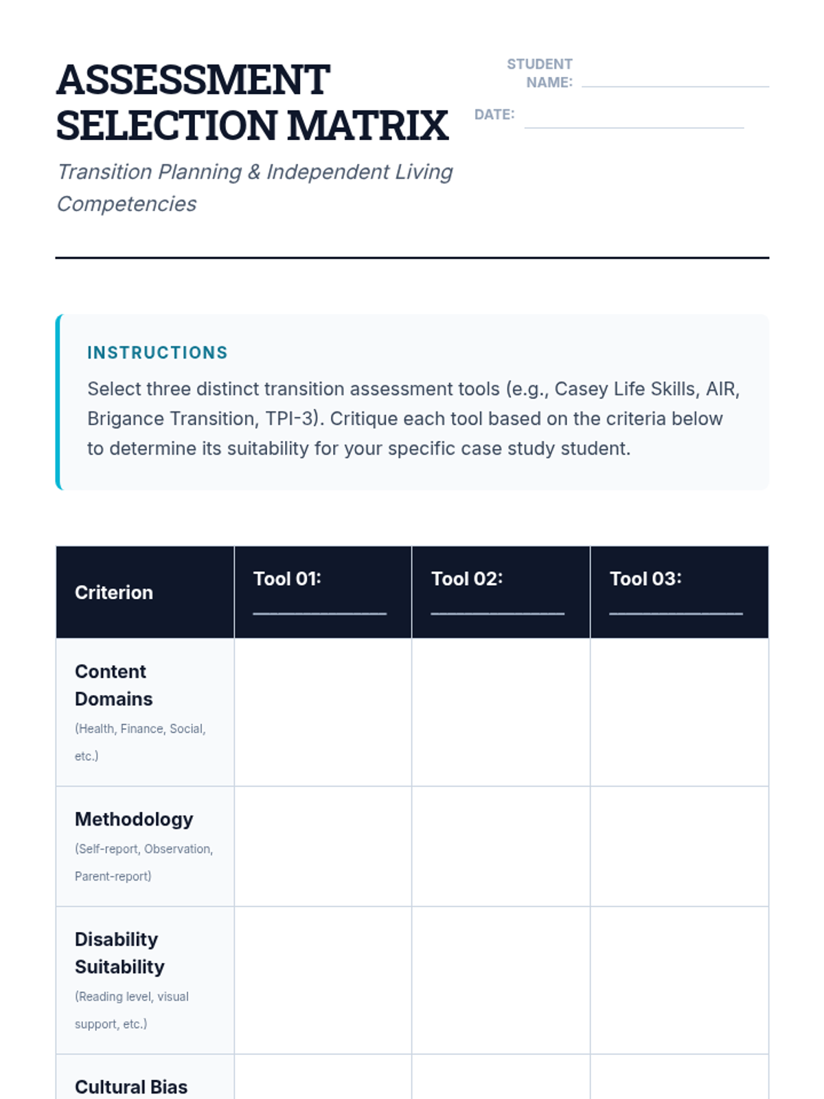 A comprehensive graduate-level sequence on assessing independent living skills for transition-aged youth. Students move from evaluating standardized tools to conducting ecological inventories, facilitating person-centered planning, and synthesizing data into legally compliant PLAAFP statements and progress monitoring systems.