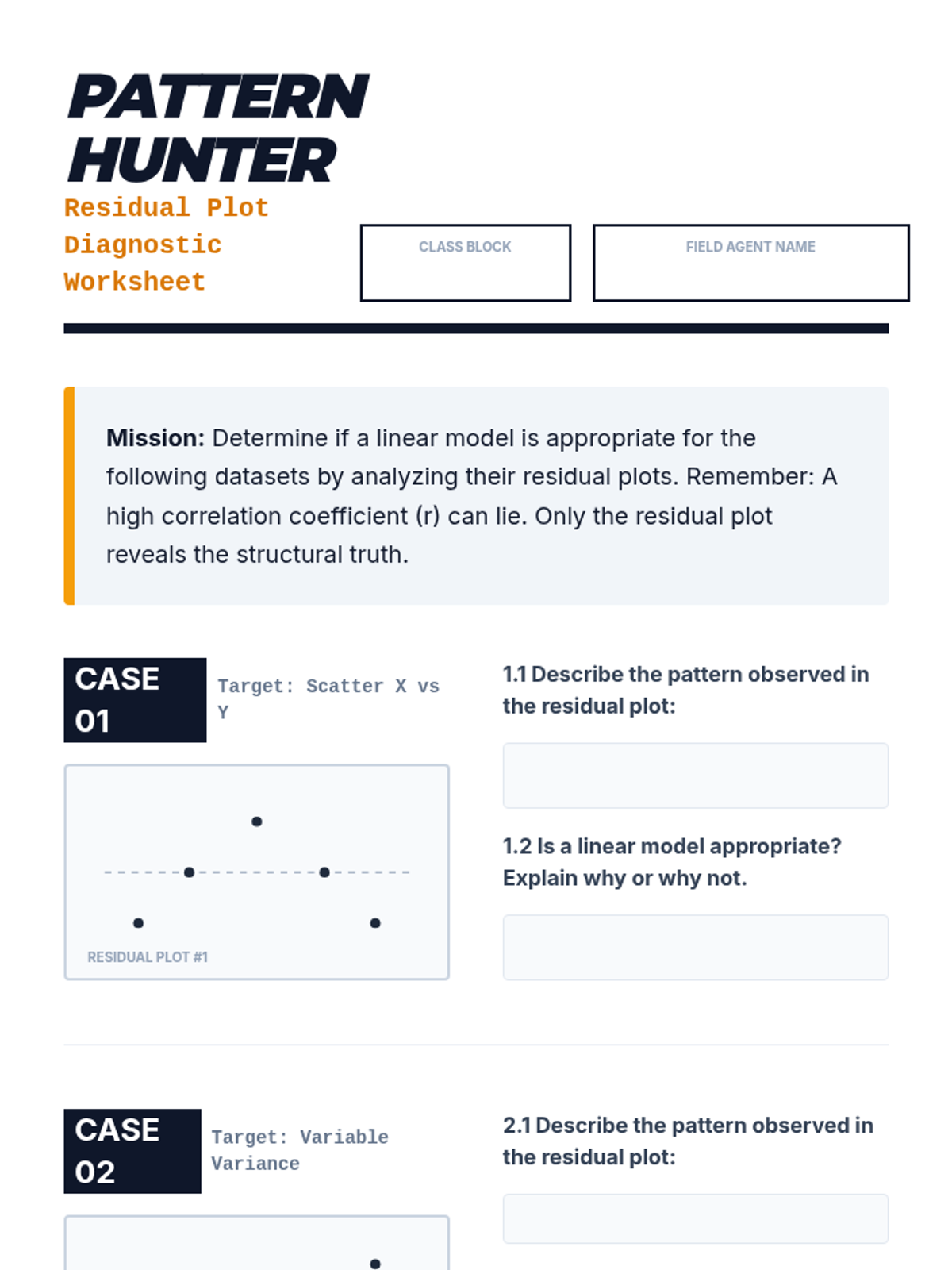 A comprehensive 5-lesson unit on evaluating the validity of linear regression models. Students move from basic residual calculation to sophisticated analysis of residual plots, correlation coefficients, outliers, and the fundamental distinction between correlation and causation.