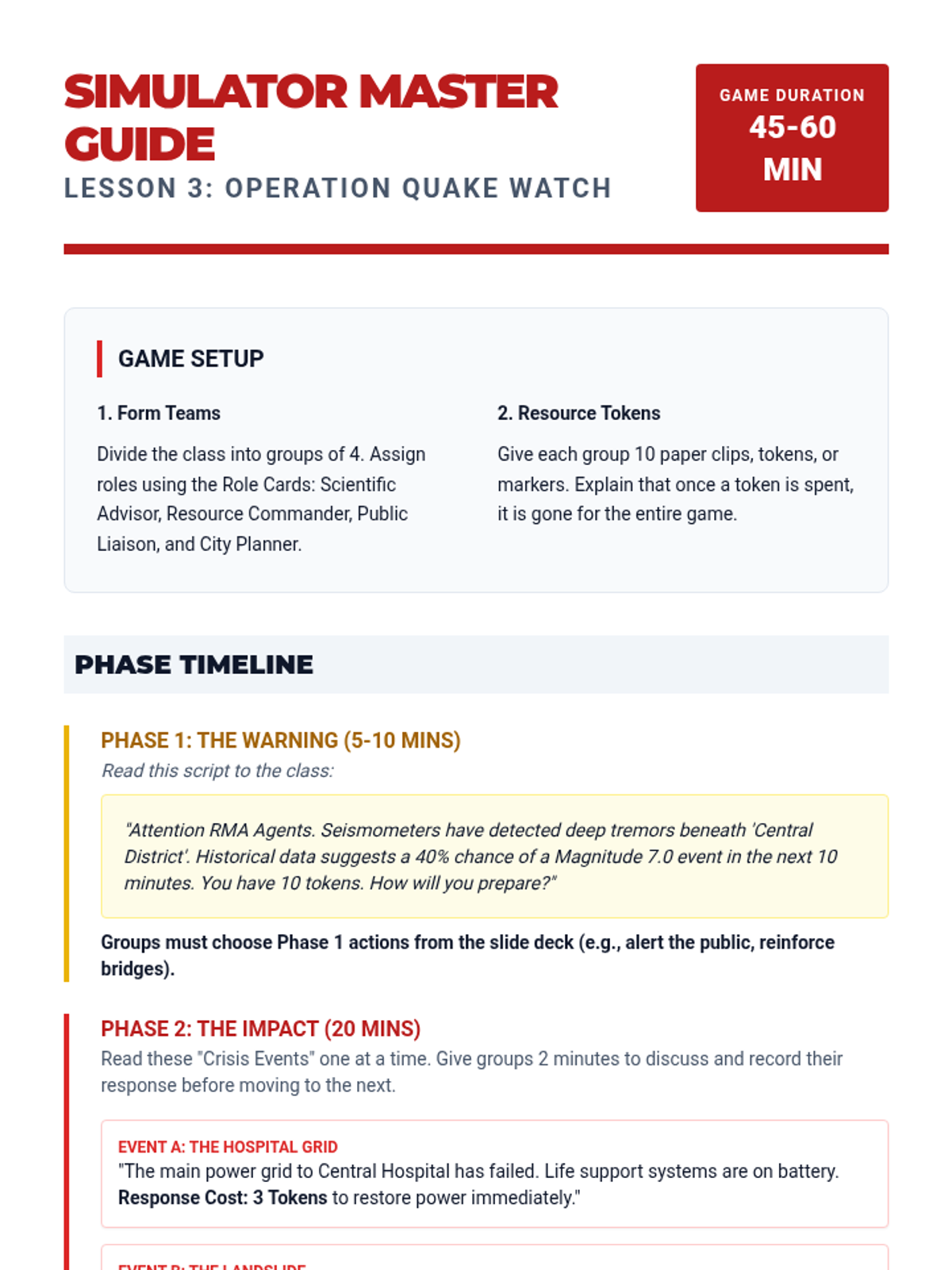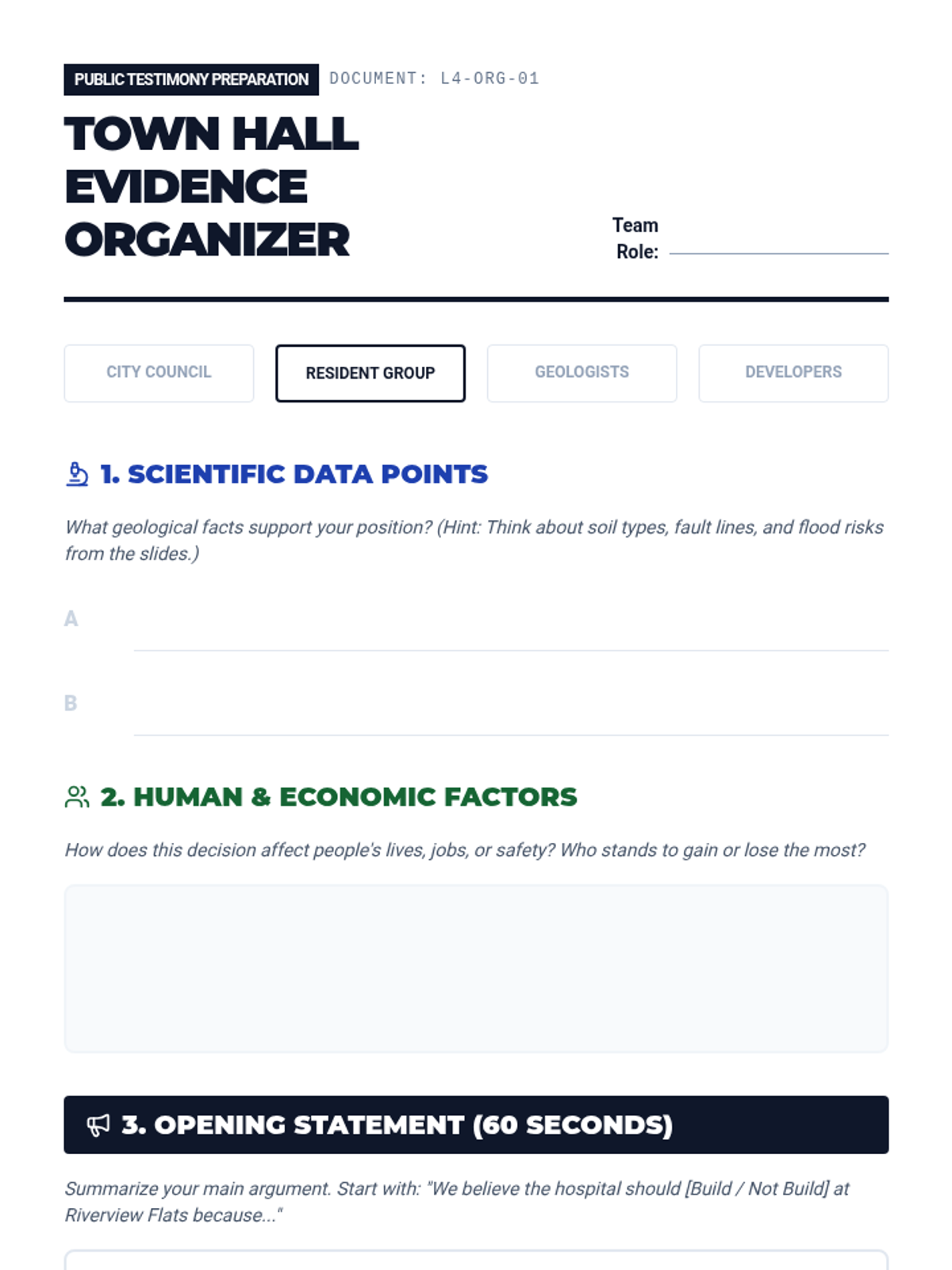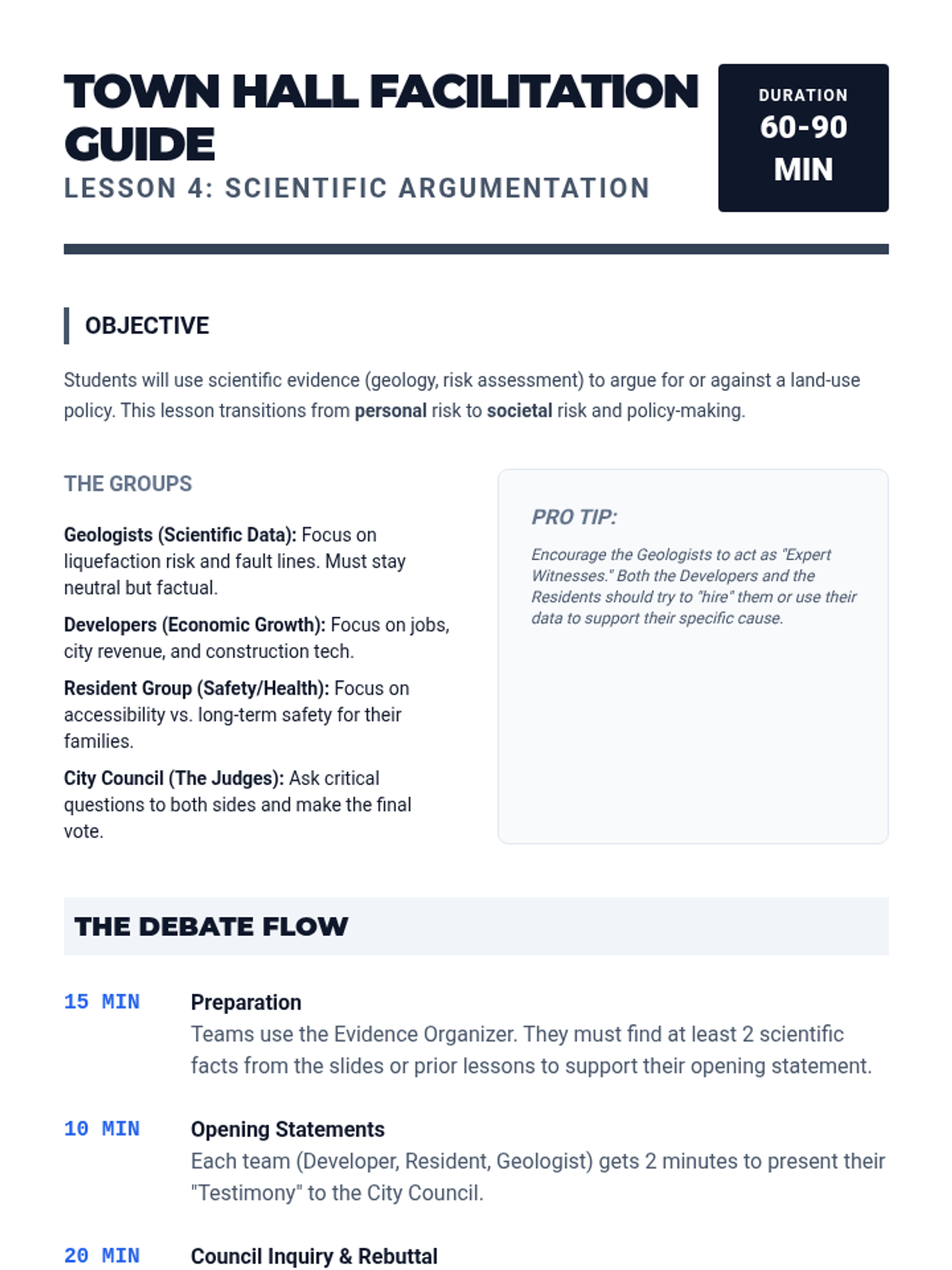 This capstone sequence focuses on assessing natural hazard risks and developing mitigation strategies. Students analyze hazard maps, evaluate early warning technologies, participate in a disaster response simulation, debate land-use zoning, and create personal preparedness plans.