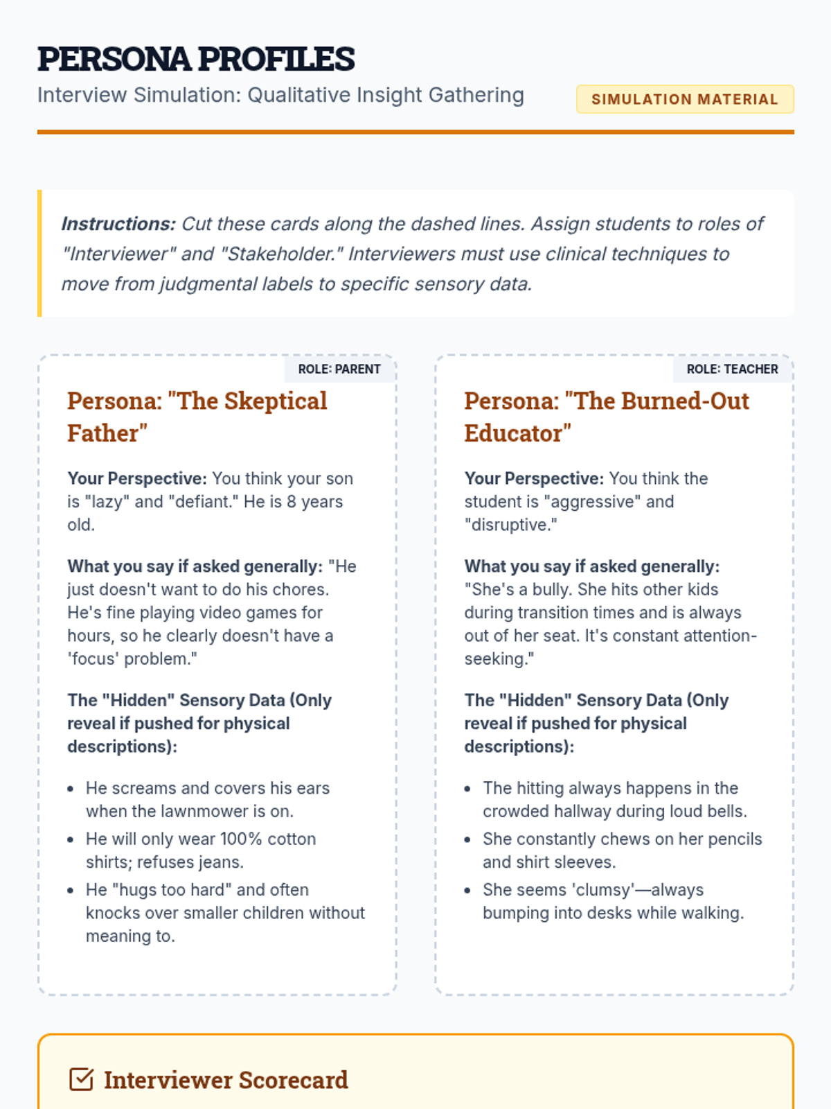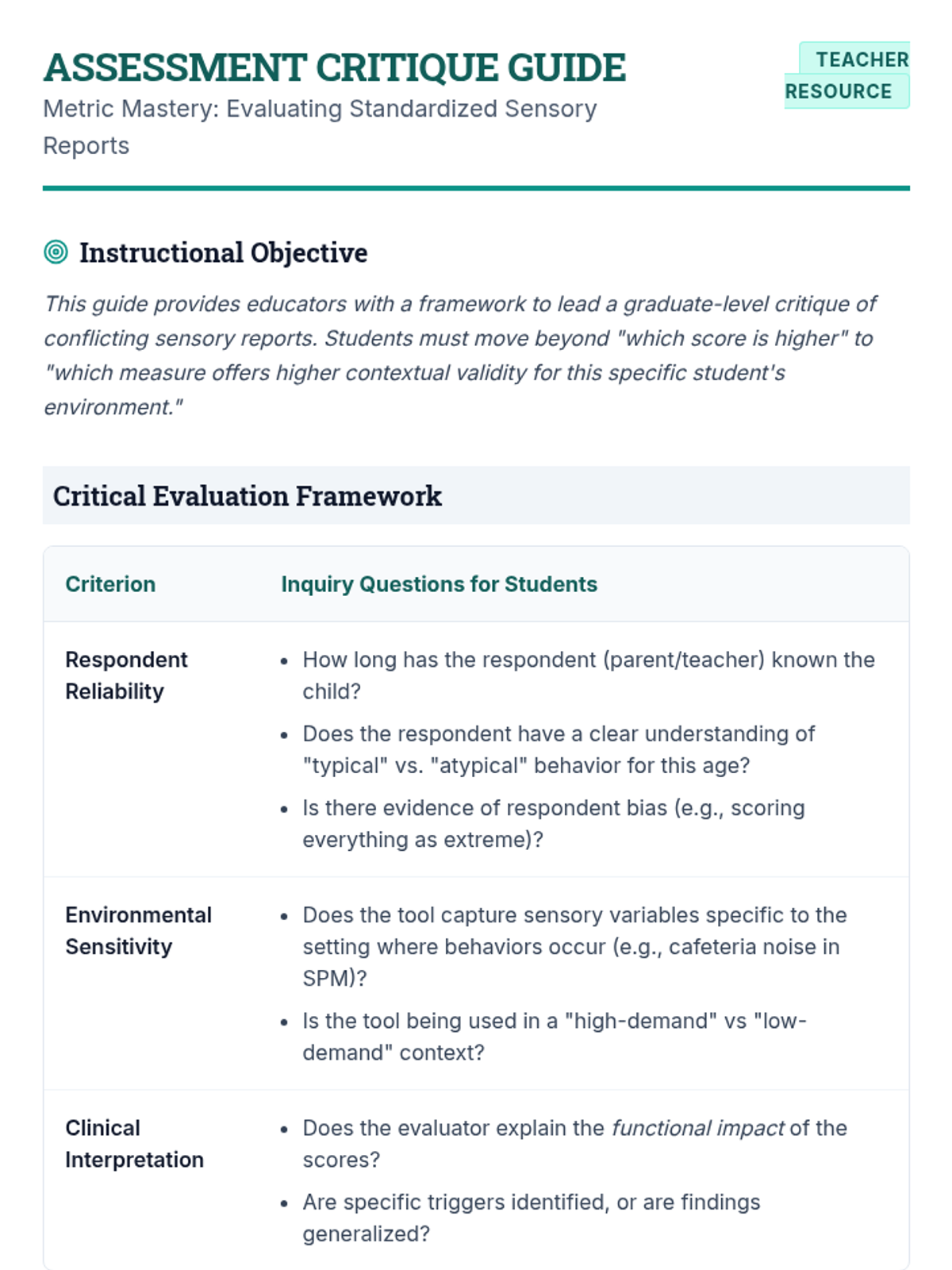 A comprehensive graduate-level sequence focused on the assessment of sensory processing disorders, moving from standardized measures to qualitative observations and data-driven intervention planning for personalized calming routines.
