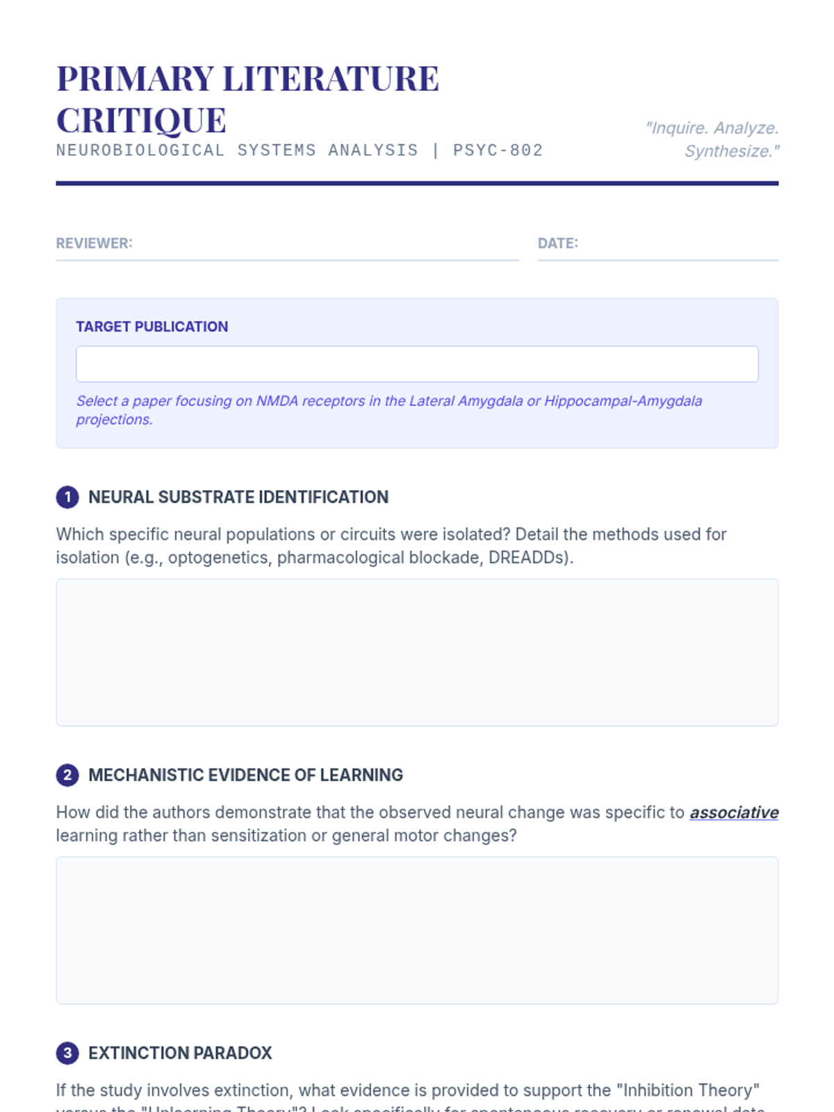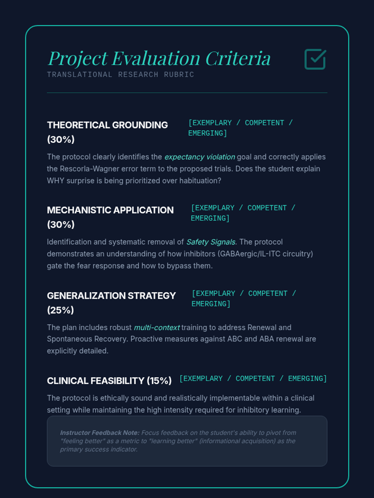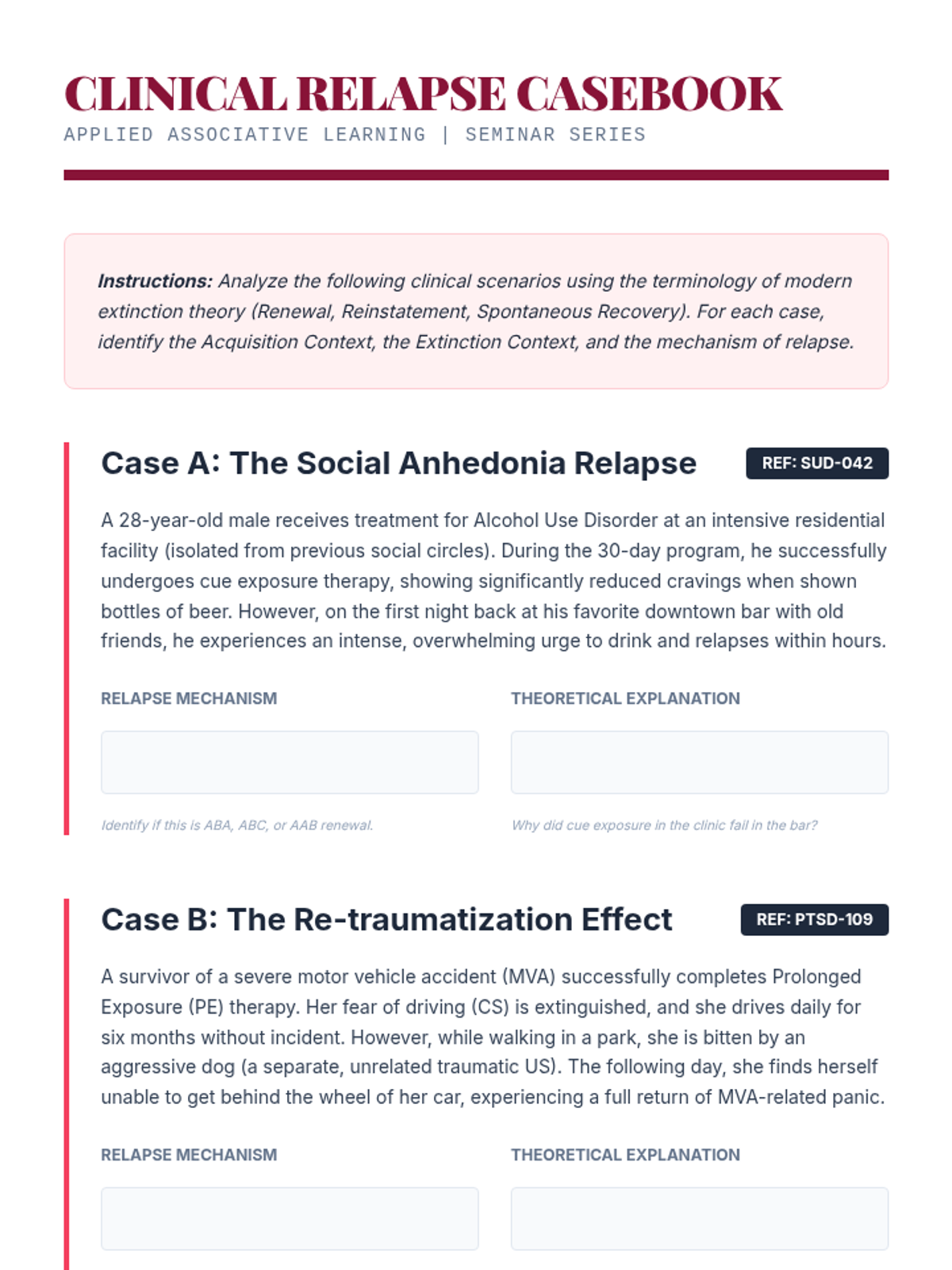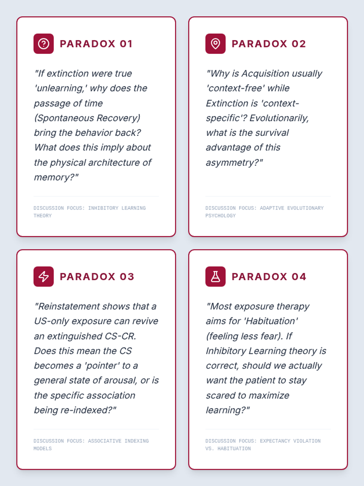 A graduate-level sequence exploring the mathematical, neurobiological, and clinical dimensions of classical conditioning. Students move from the Rescorla-Wagner model's prediction error to the neural circuits of fear and the translation of inhibitory learning theory into modern exposure therapy.