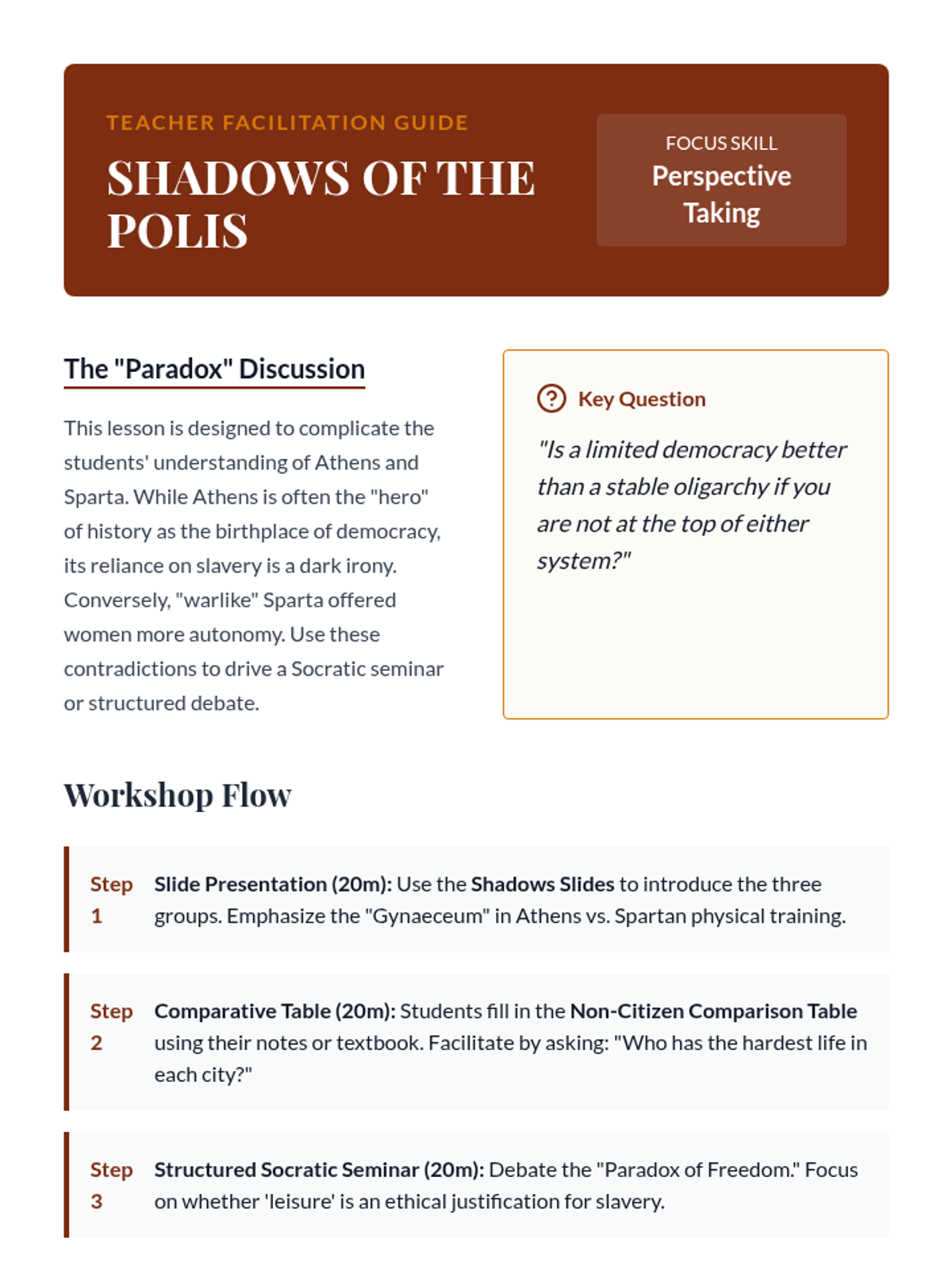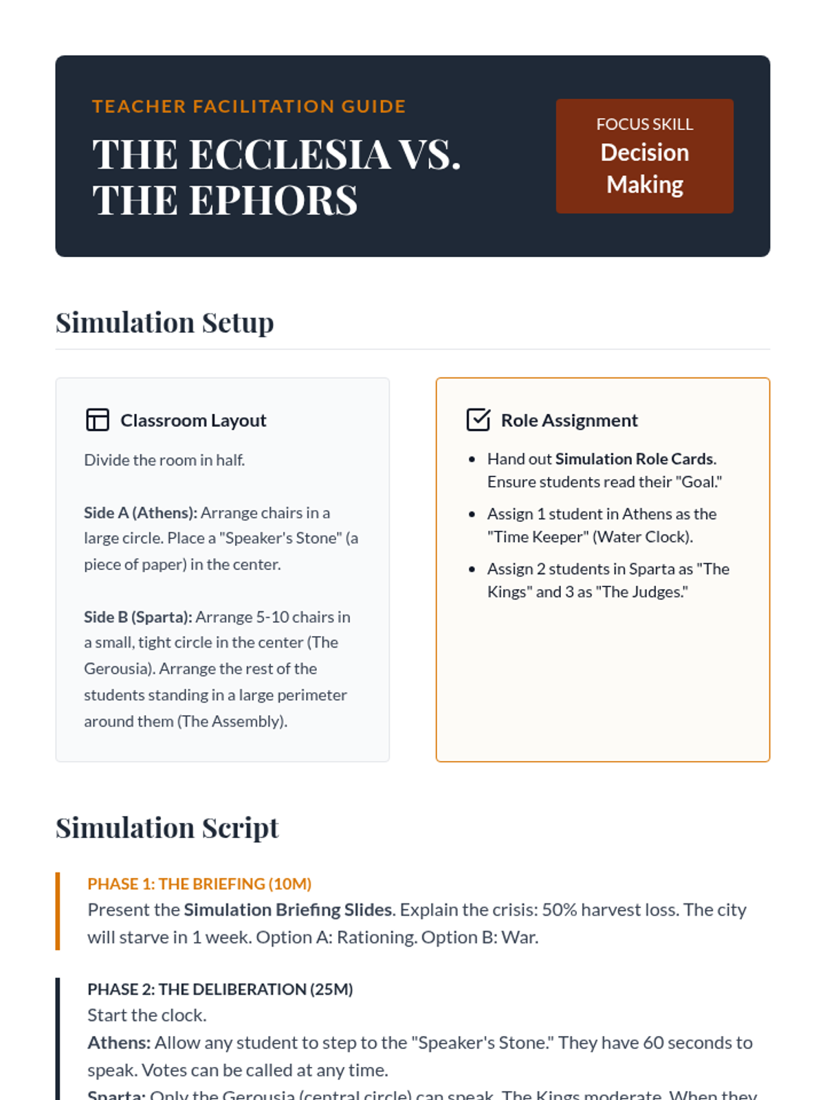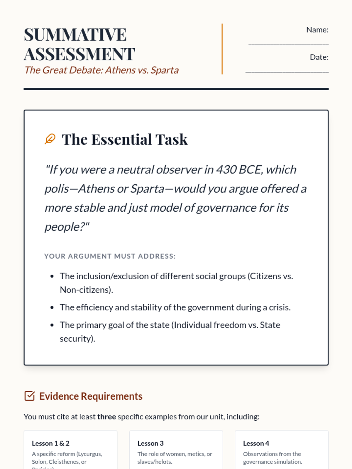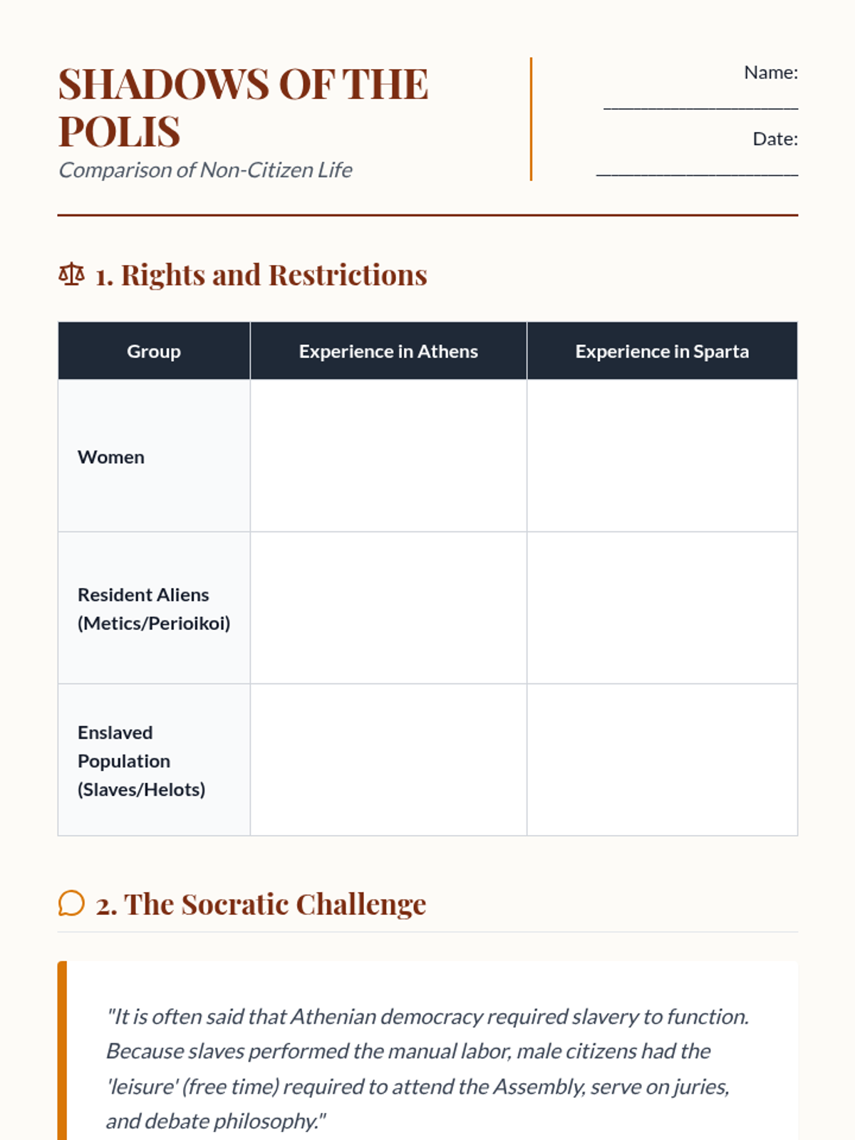 A comparative analysis of Athenian and Spartan governance, focusing on social structures, political systems, and cultural values. Students investigate the tension between security and freedom through simulations and primary source analysis.