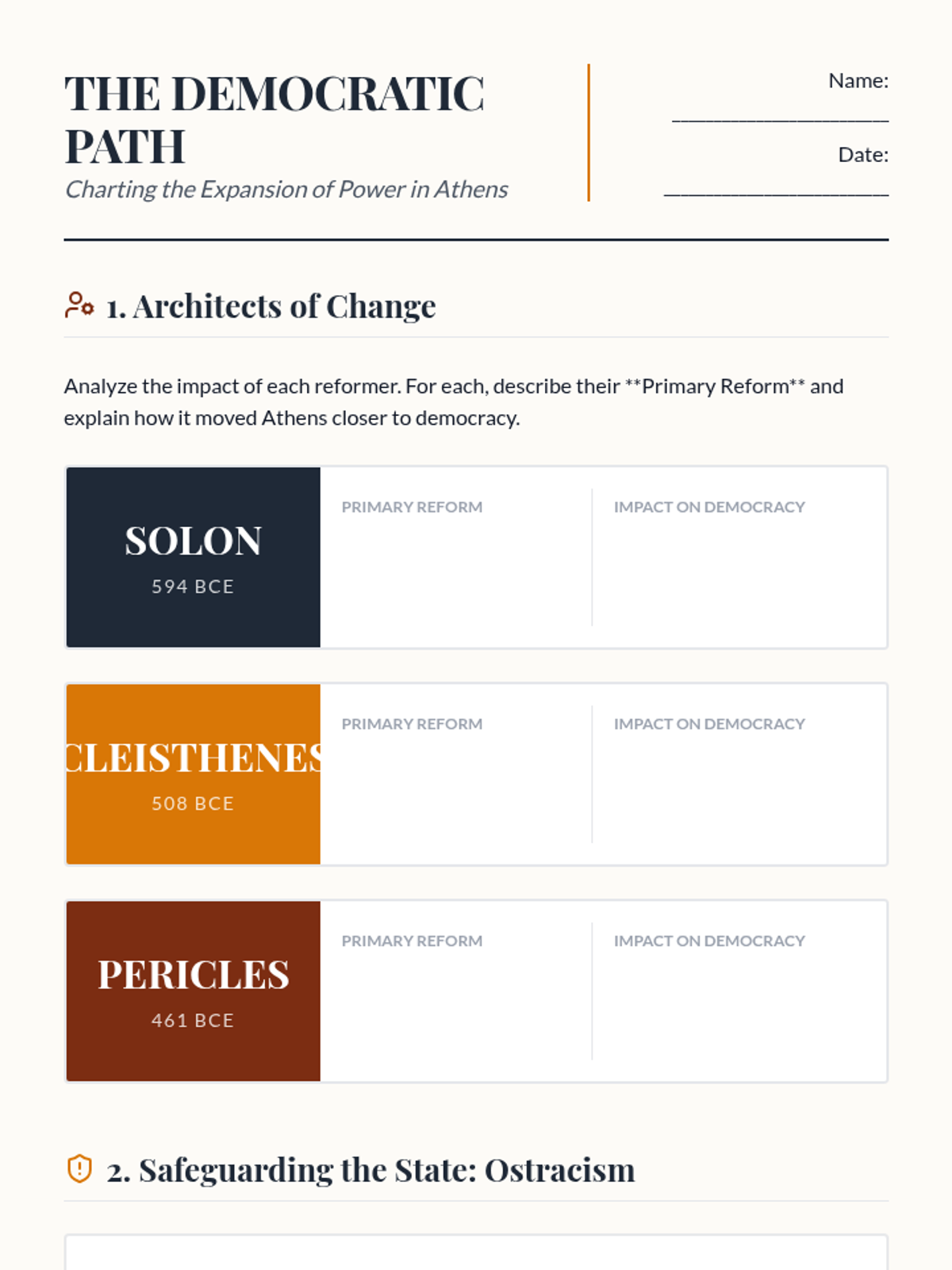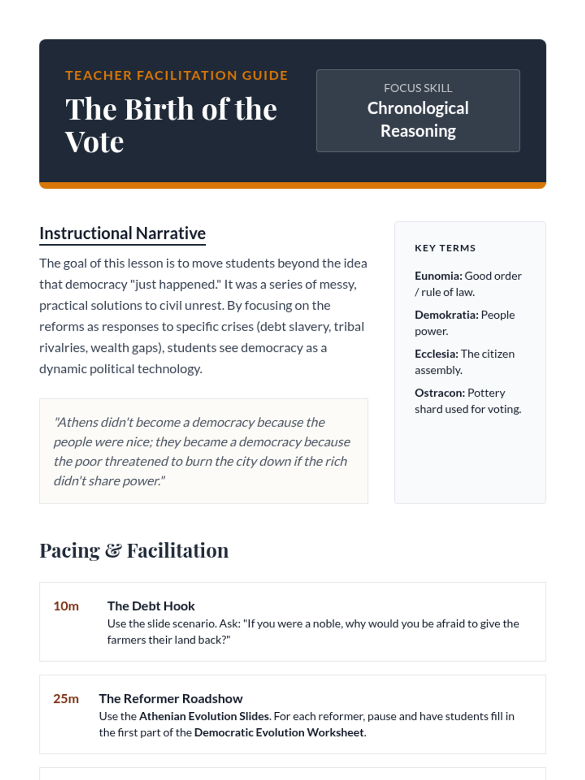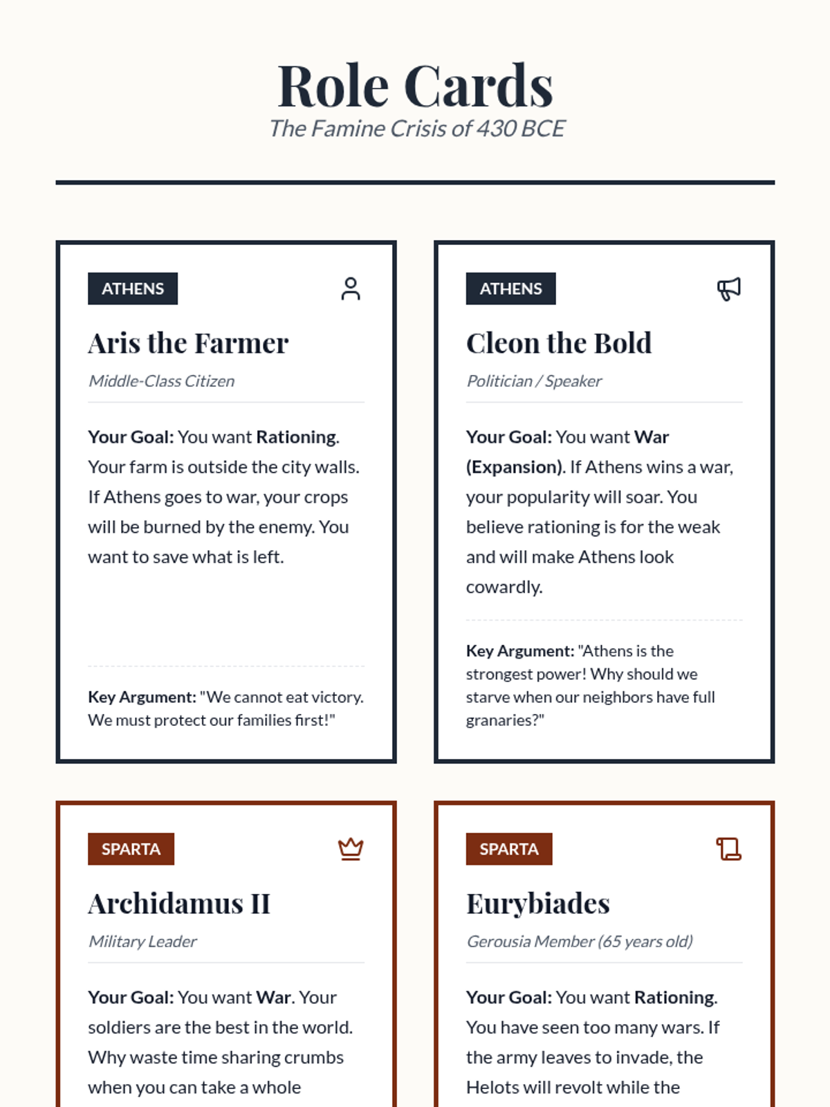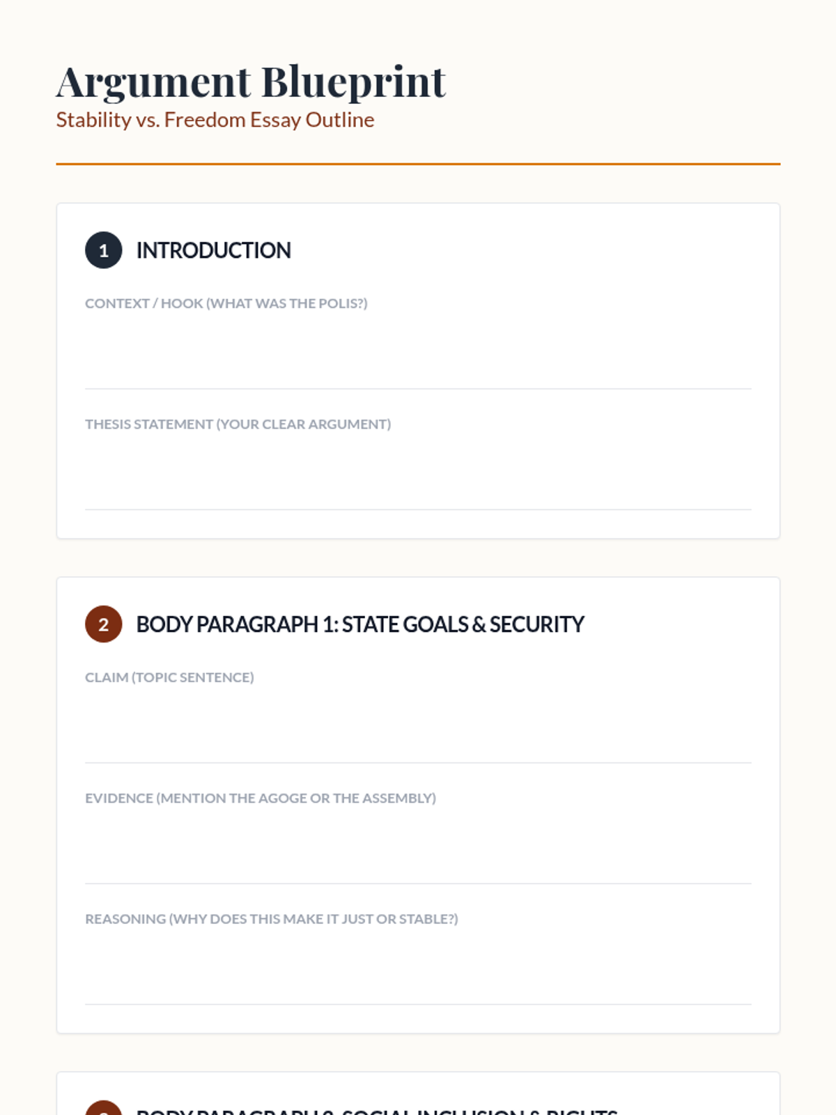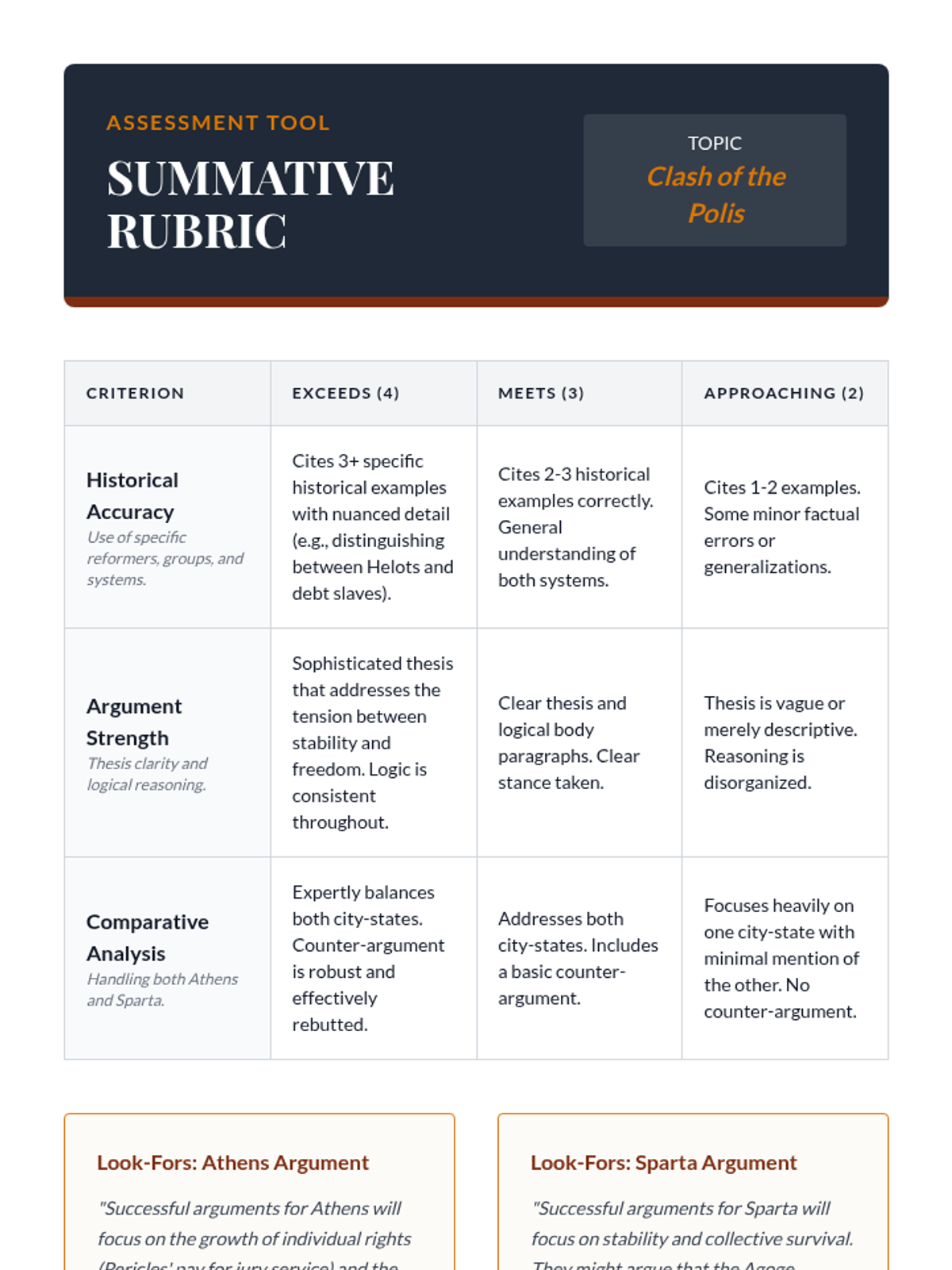 A comparative analysis of Athenian and Spartan governance, focusing on social structures, political systems, and cultural values. Students investigate the tension between security and freedom through simulations and primary source analysis.