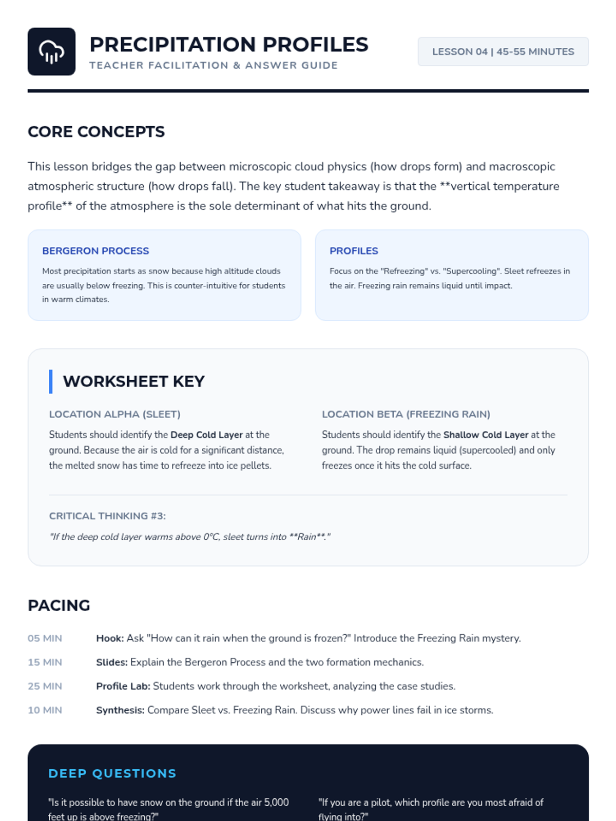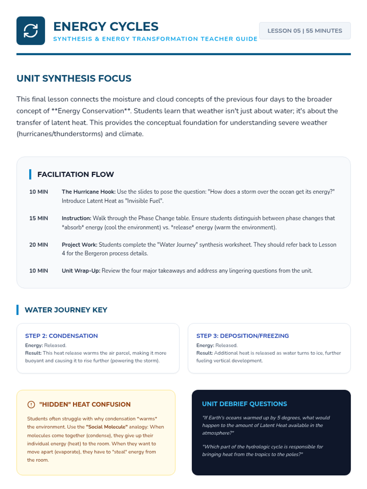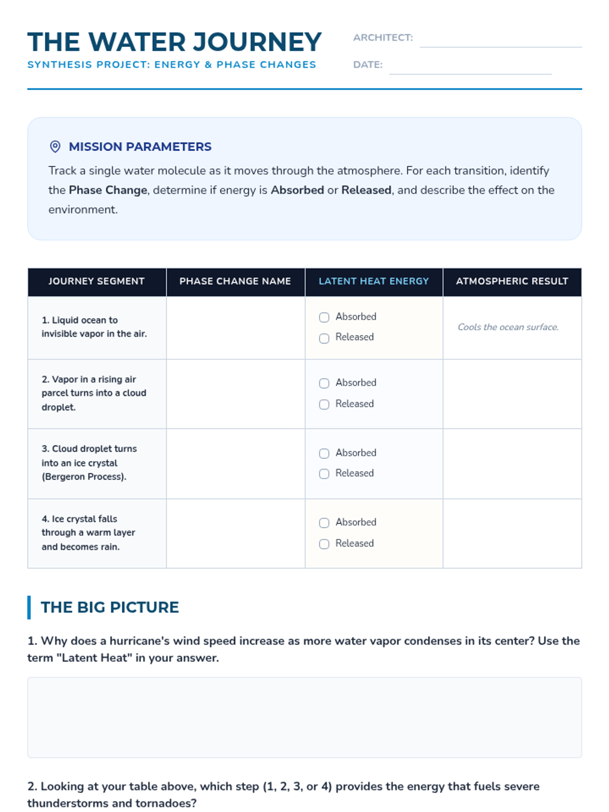 A comprehensive 9th-grade sequence exploring the physics of atmospheric moisture, from humidity measurements and adiabatic cooling to cloud classification and precipitation formation. Students use meteorological tools, analyze temperature profiles, and track latent heat energy through the hydrologic cycle.