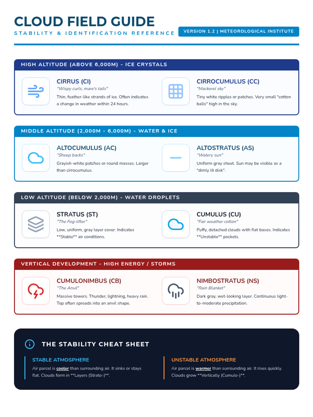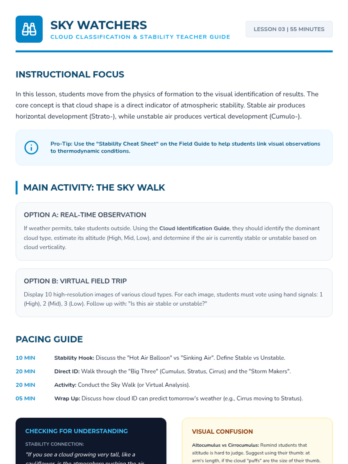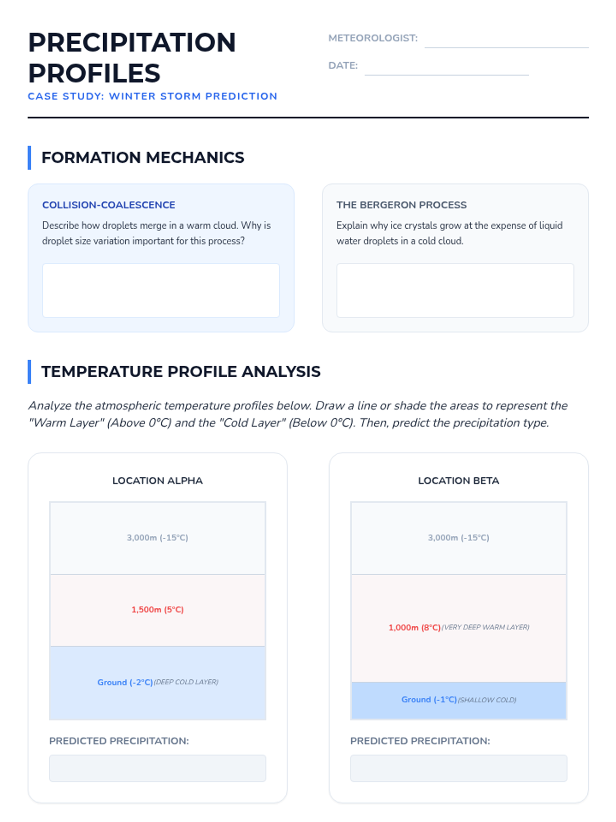 A comprehensive 9th-grade sequence exploring the physics of atmospheric moisture, from humidity measurements and adiabatic cooling to cloud classification and precipitation formation. Students use meteorological tools, analyze temperature profiles, and track latent heat energy through the hydrologic cycle.