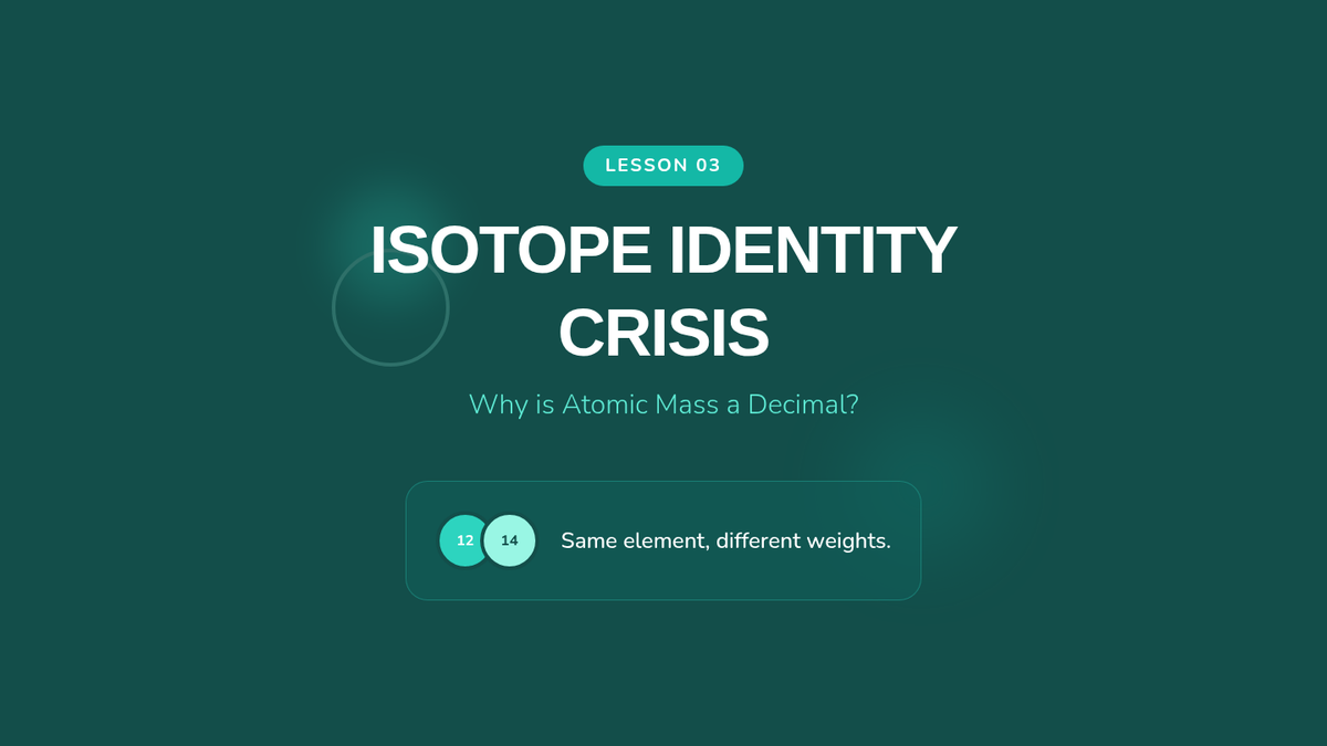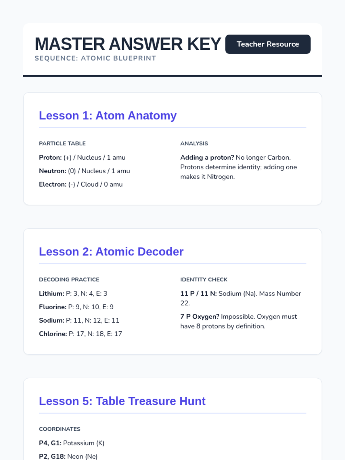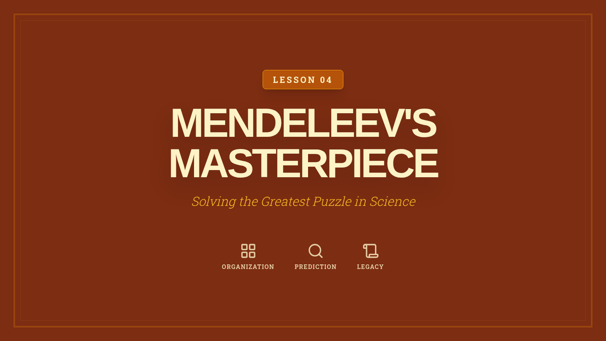 This sequence introduces students to the fundamental building blocks of matter and the logical organization of the Periodic Table. Students progress from subatomic particles to the predictive power of element classification.
