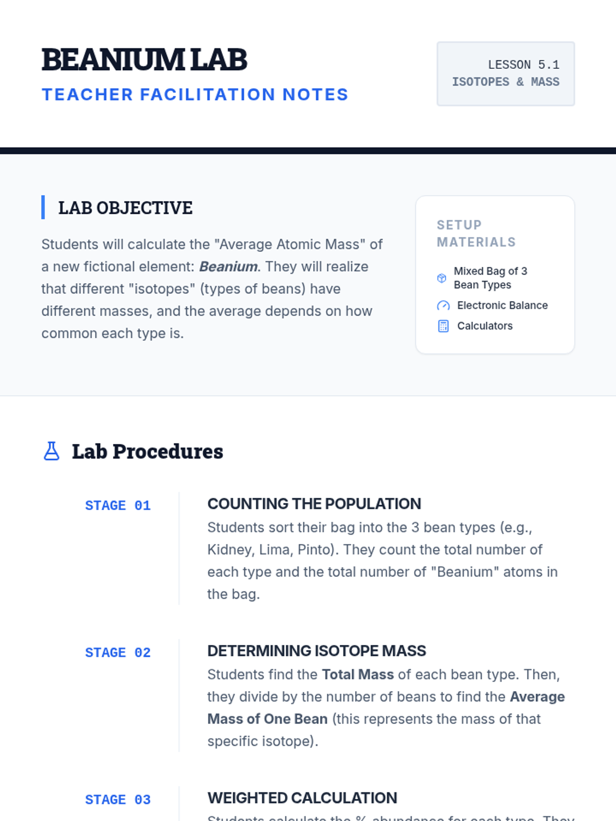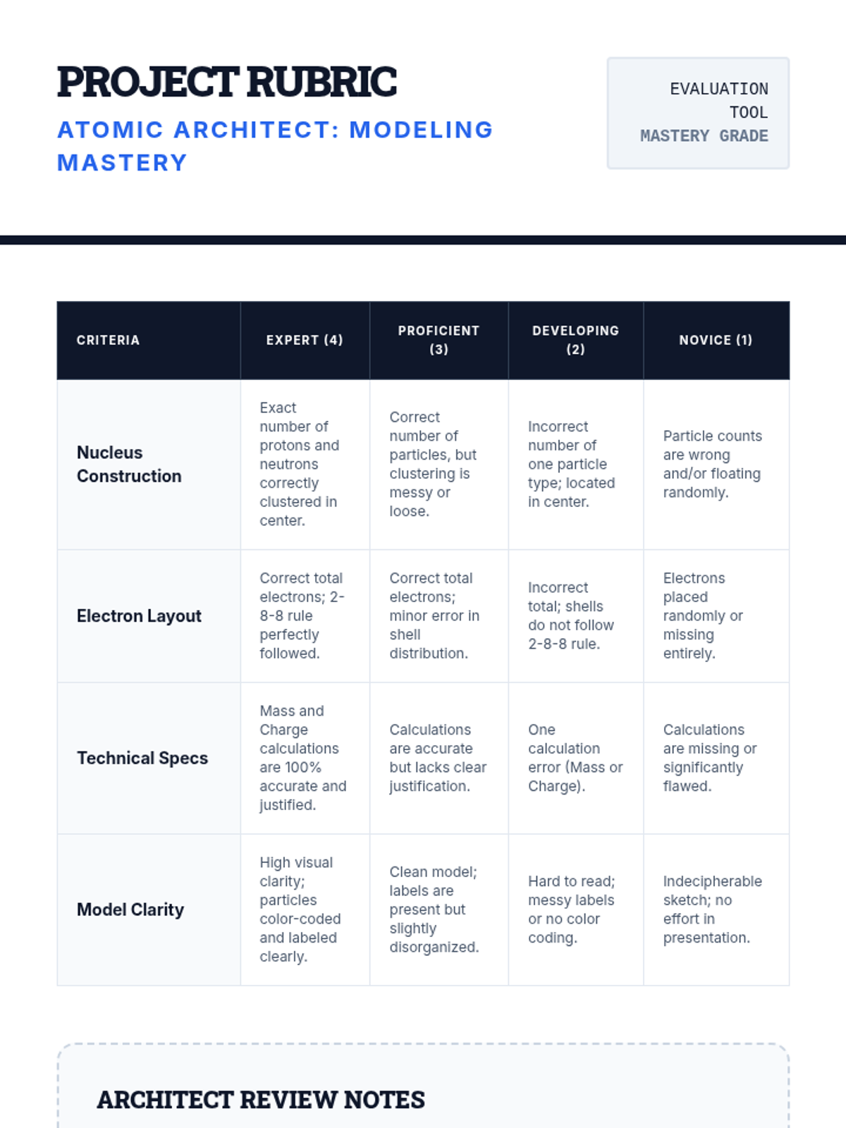 This sequence introduces 8th-grade students to atomic structure through historical models, subatomic particle properties, and isotope calculations. Students will use a blueprint-inspired approach to build, calculate, and analyze the fundamental building blocks of matter.