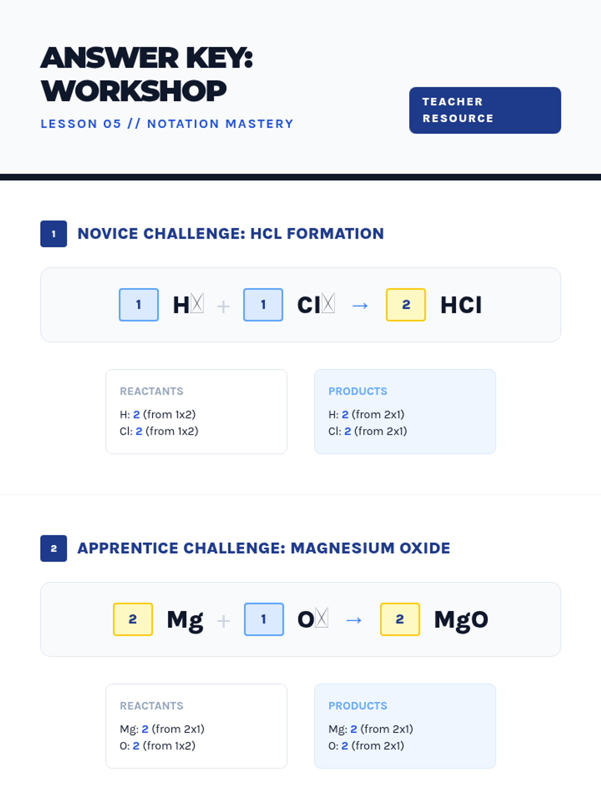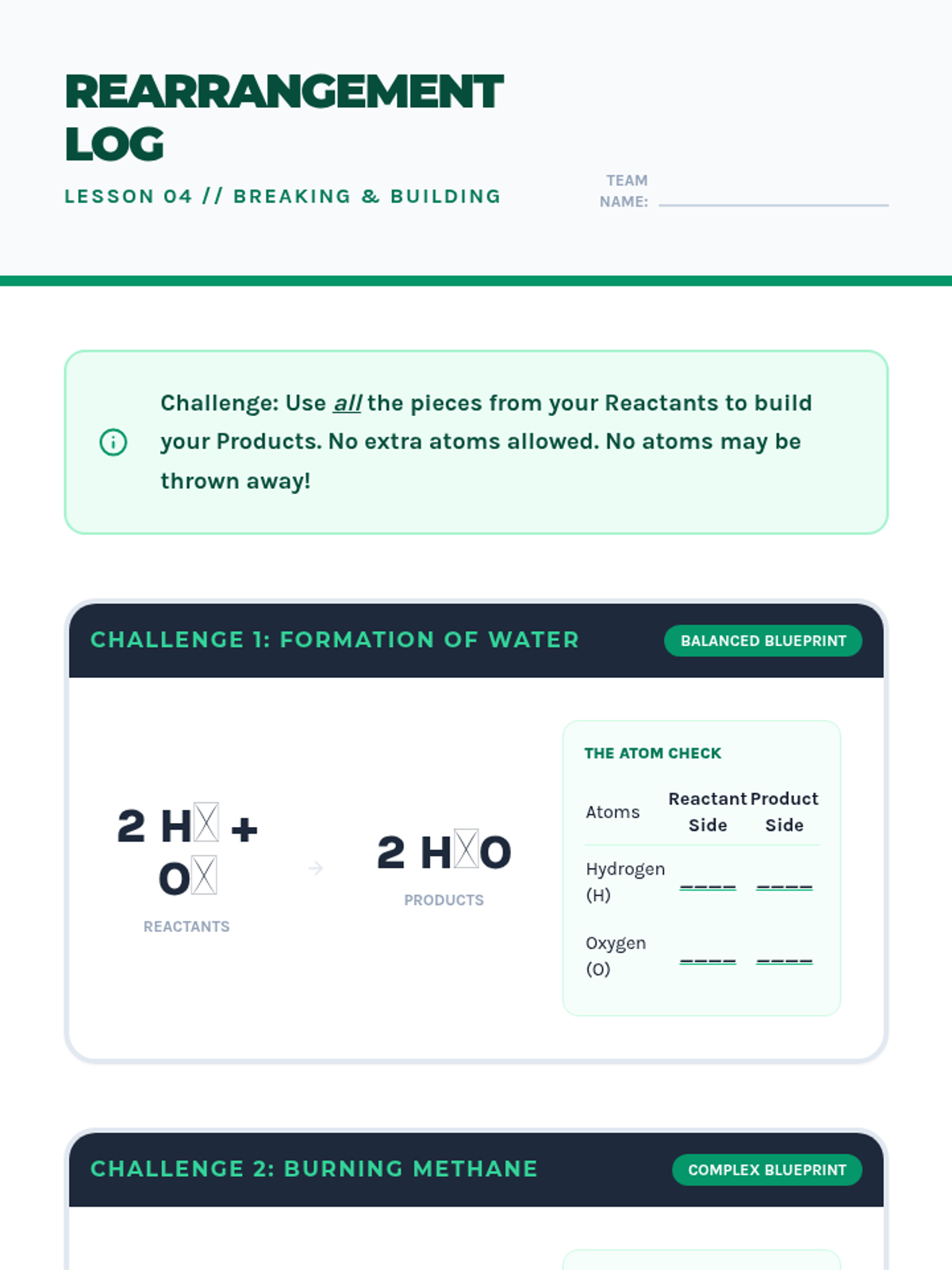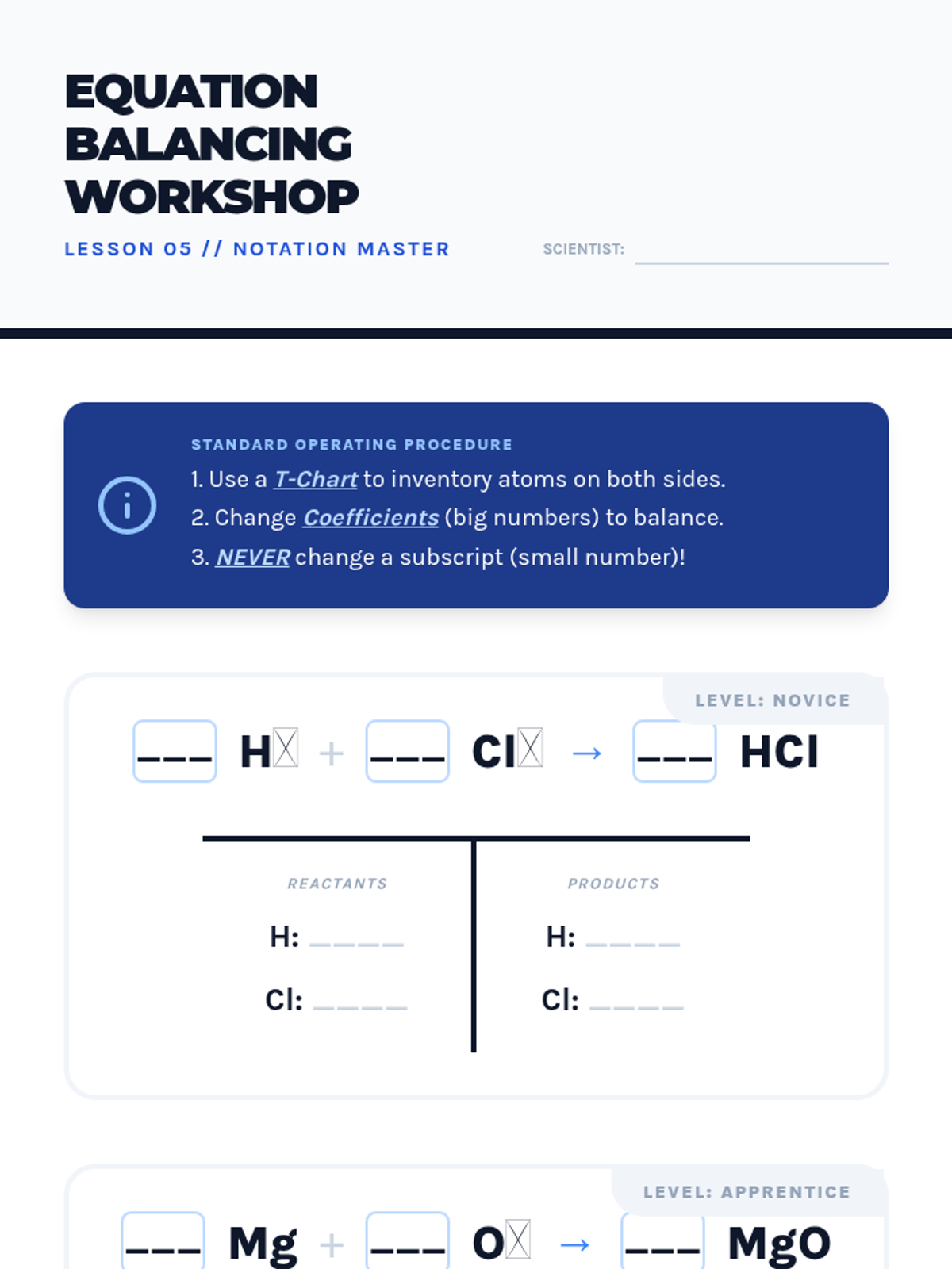 A 7th-grade chemistry unit that uses physical modeling to bridge the gap between tangible mass conservation and abstract chemical equation balancing. Students progress from weighing reactions to building molecular structures and finally mastering scientific notation.