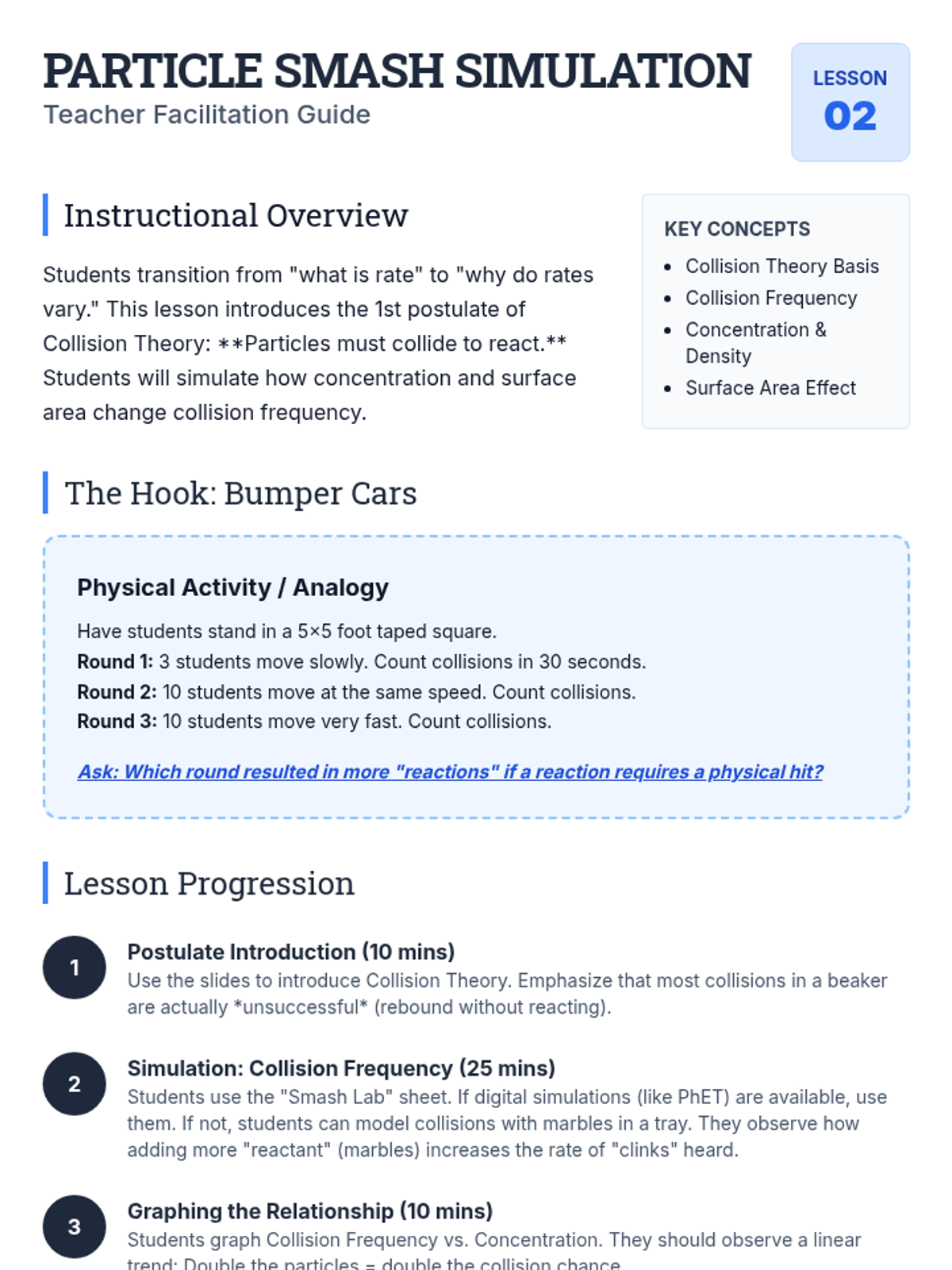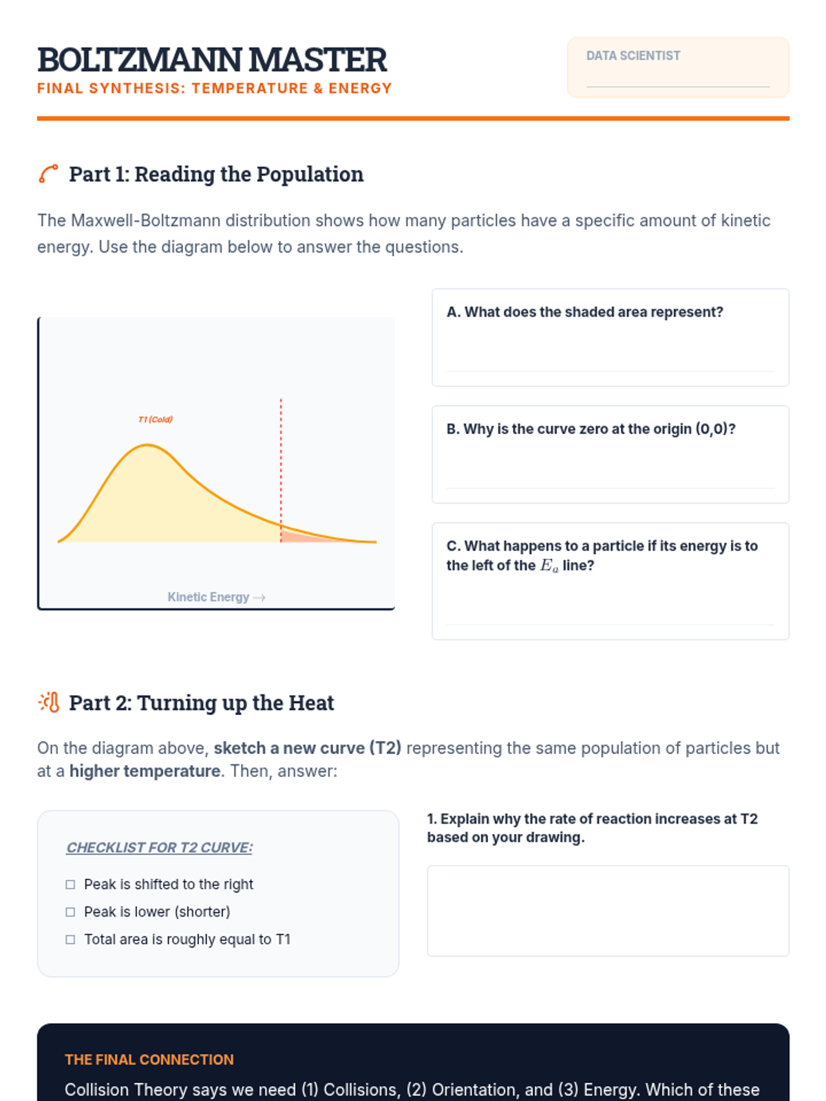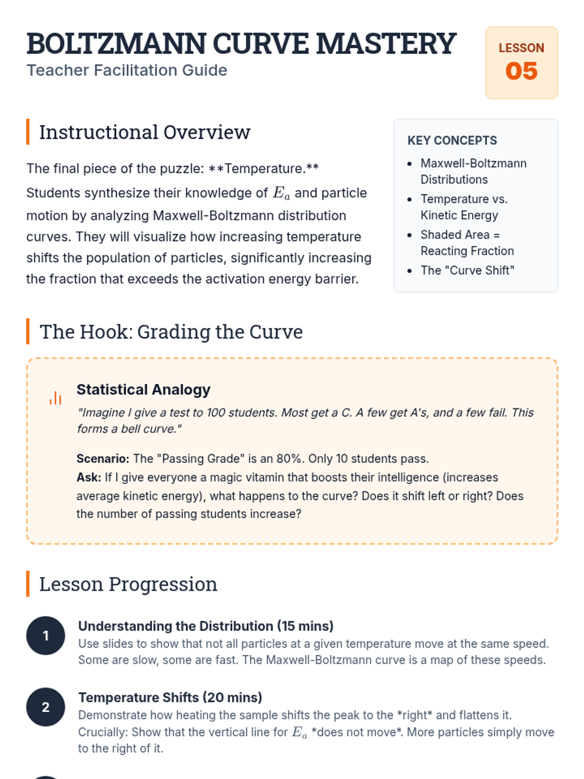 A comprehensive unit on chemical kinetics for 10th-grade chemistry. Students explore reaction rates through the lens of Collision Theory, molecular orientation, and Activation Energy, culminating in the interpretation of Maxwell-Boltzmann distribution curves.