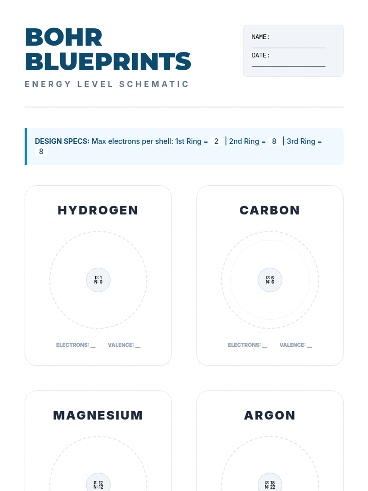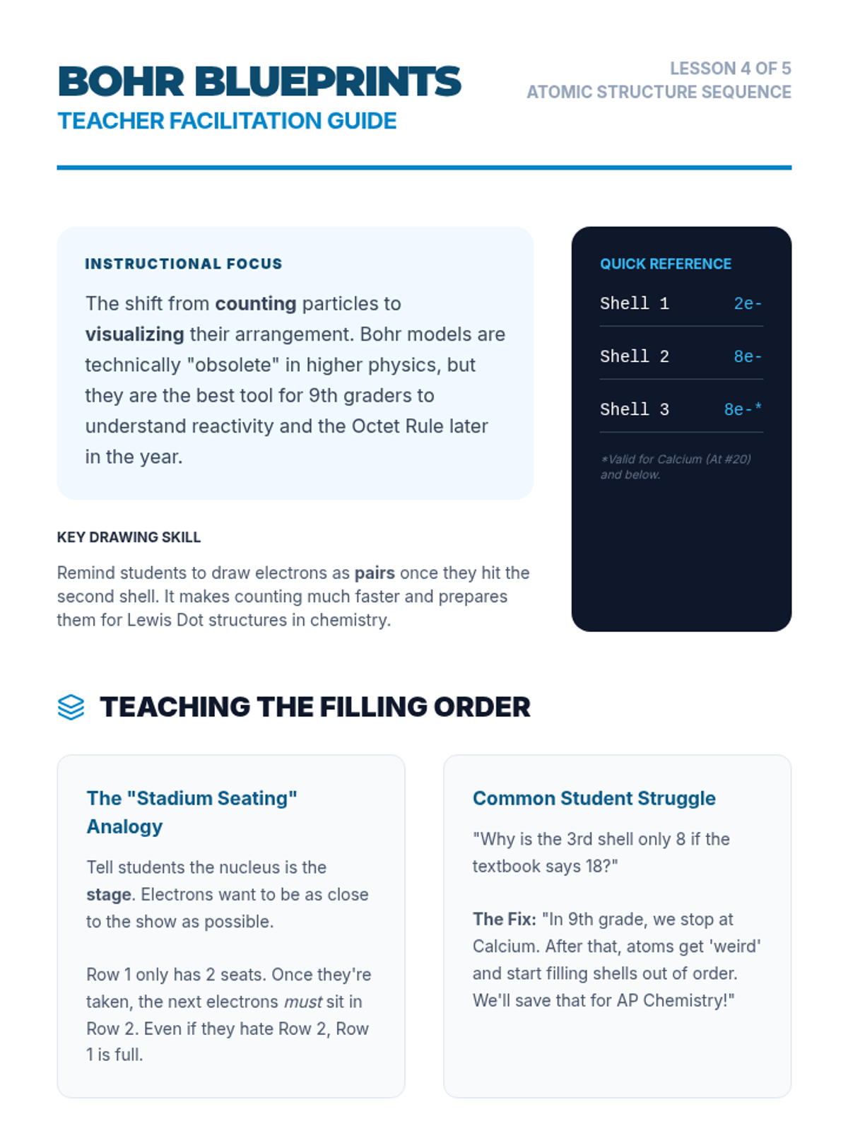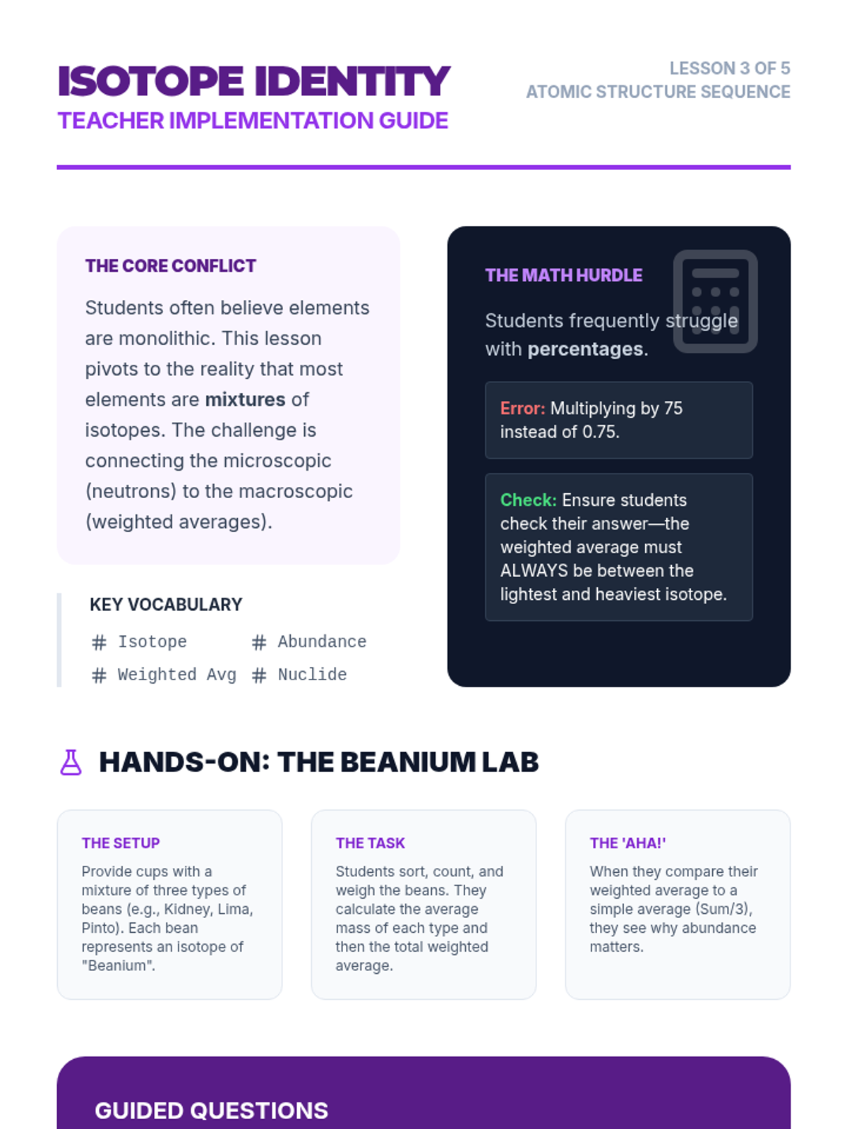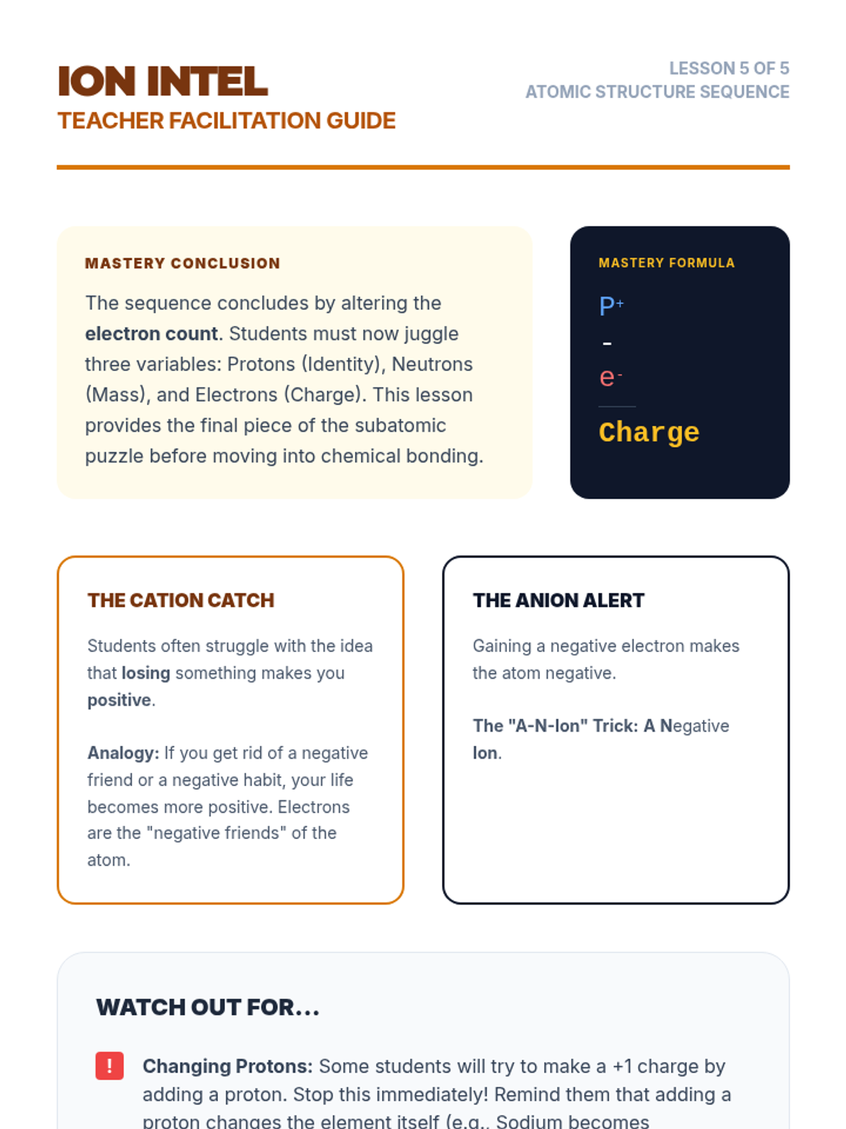 A comprehensive 9th-grade physics sequence exploring the internal structure of atoms. Students move from identifying subatomic particles to calculating atomic mass, understanding isotopes, drawing Bohr models, and analyzing ion formation.