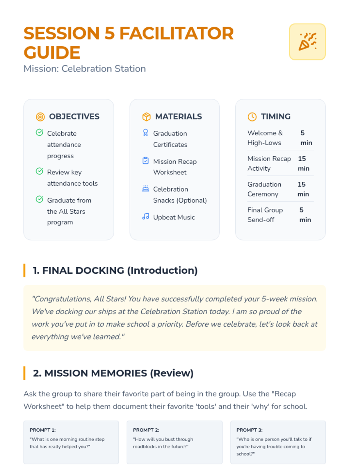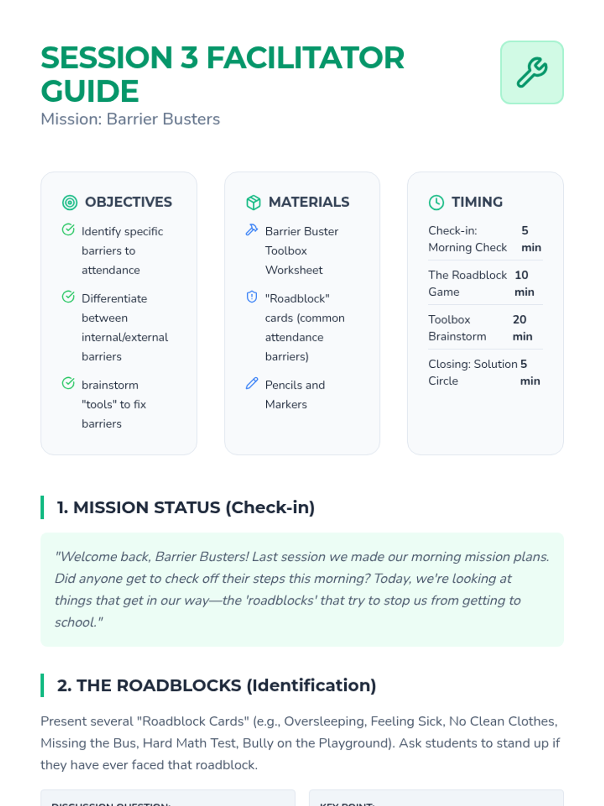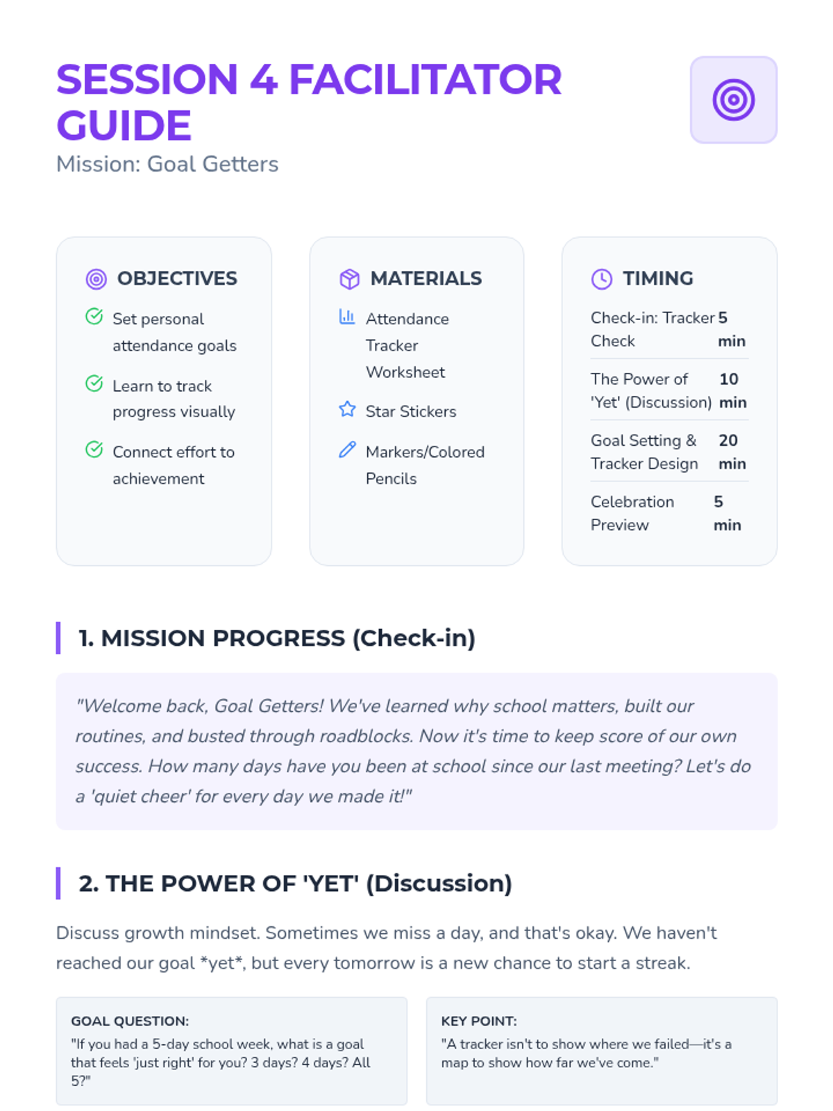A comprehensive 5-session group counseling program designed to improve elementary school attendance by building routines, solving barriers, and fostering a sense of belonging.