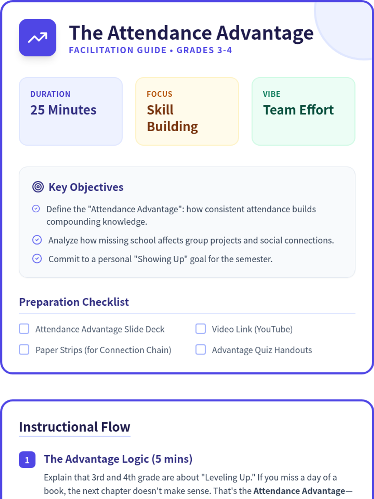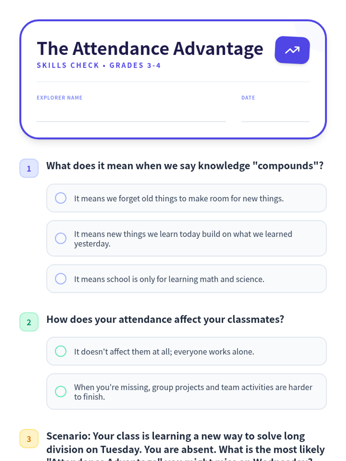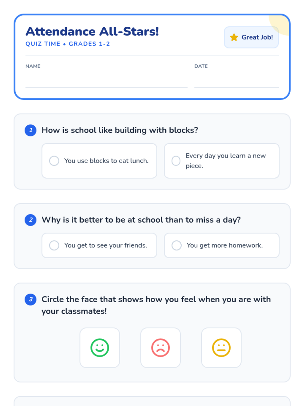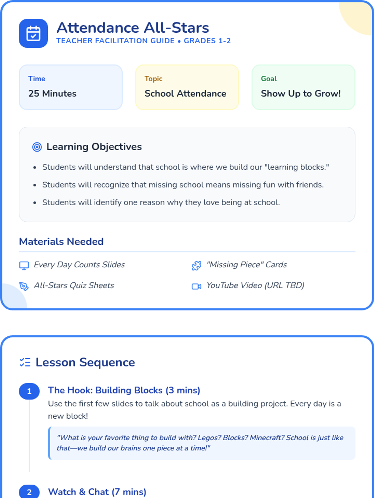 A pair of lessons designed to teach 1st-4th graders the importance of school attendance. The lessons use a 'Building Blocks' theme to show how every day helps build knowledge and friendships.
