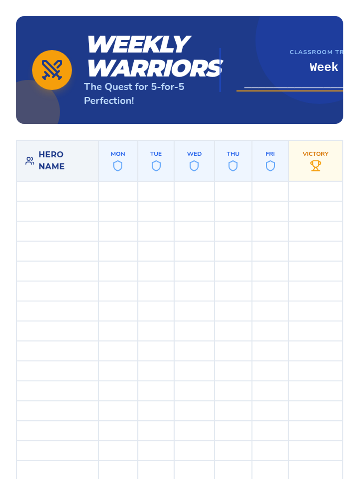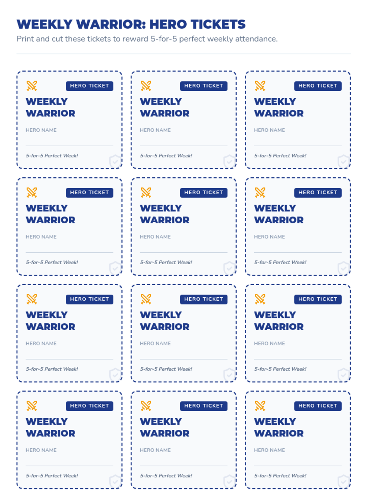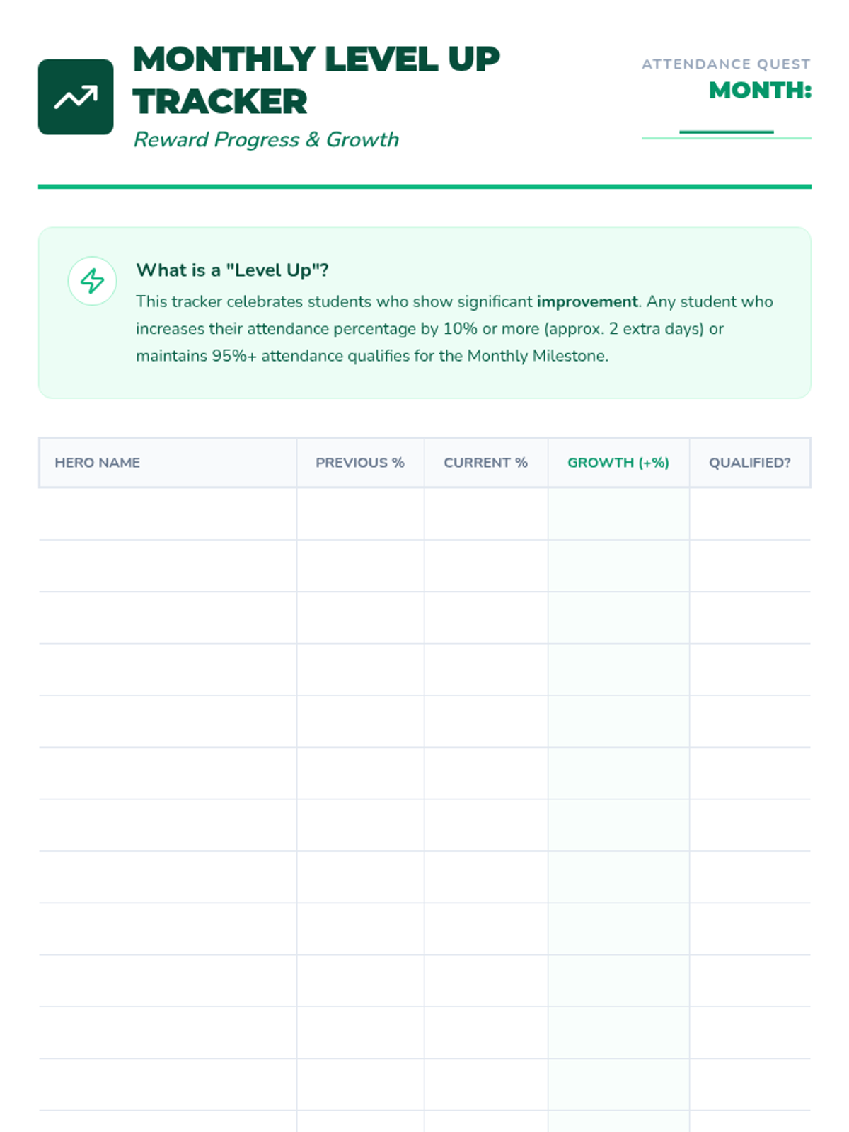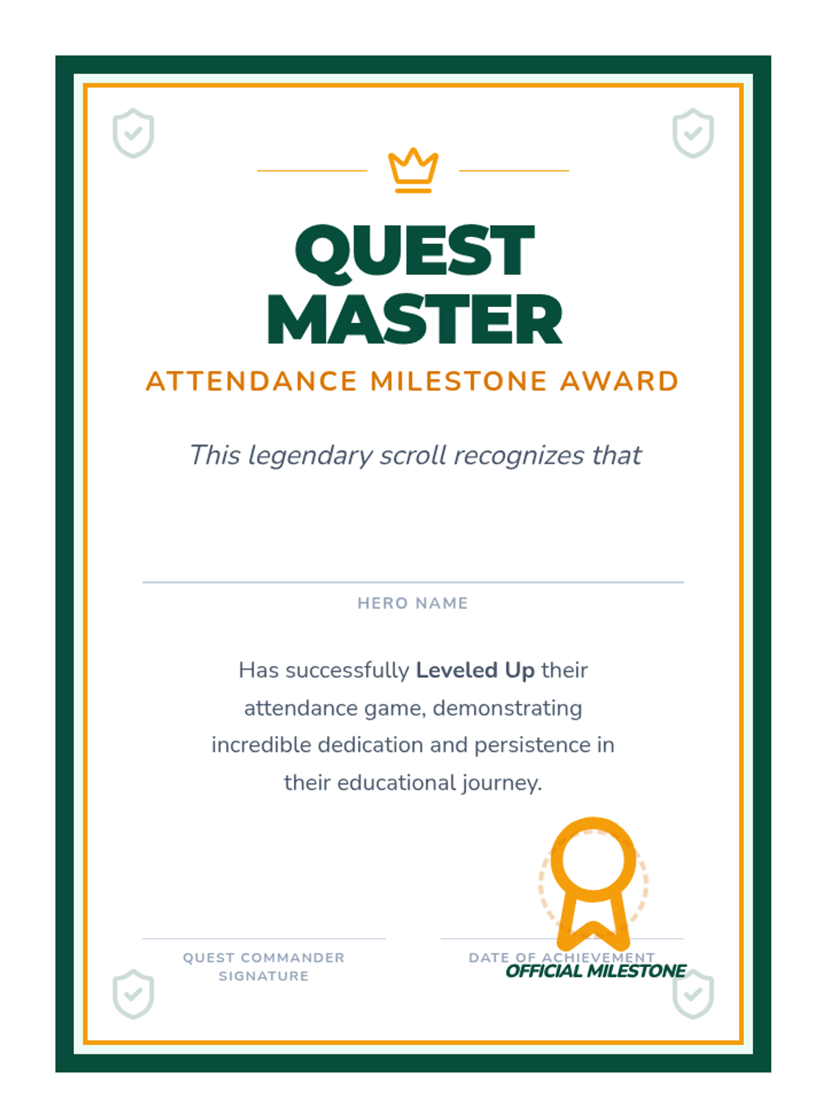 A school-wide attendance incentive program designed to reward perfect weekly attendance and improved monthly attendance through a gamified "Quest" theme.