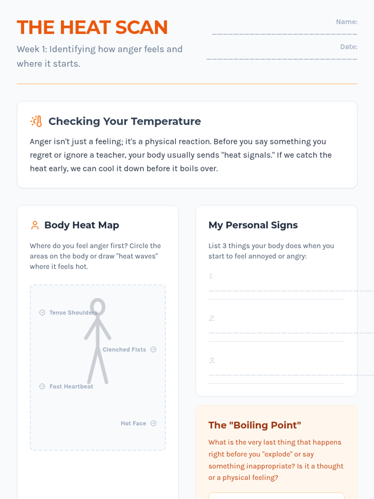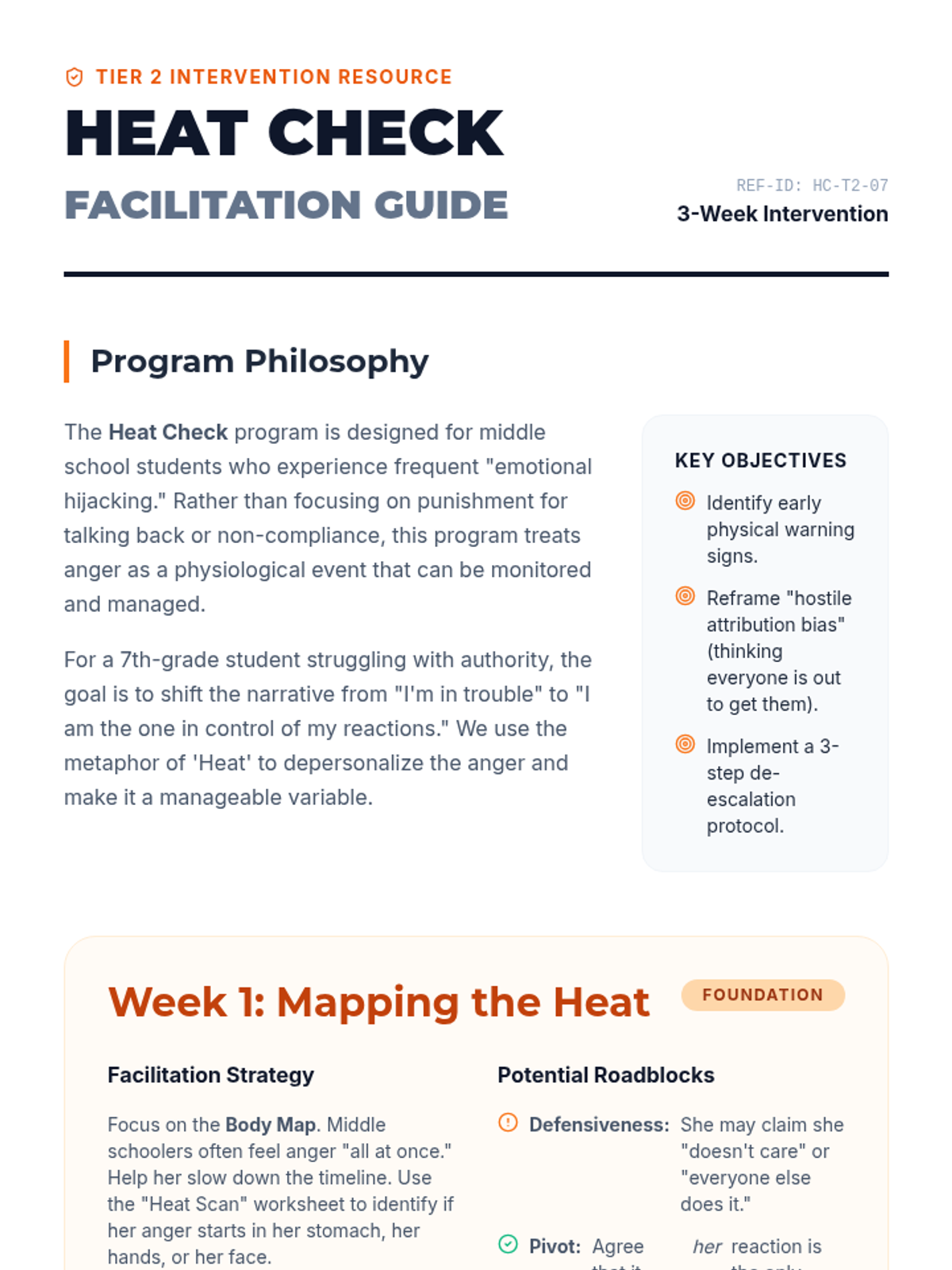 A three-week Tier 2 intervention program for a 7th-grade student focusing on anger management, trigger identification, and relationship repair. The program uses a 'Heat Check' theme to help the student monitor and regulate emotional intensity.