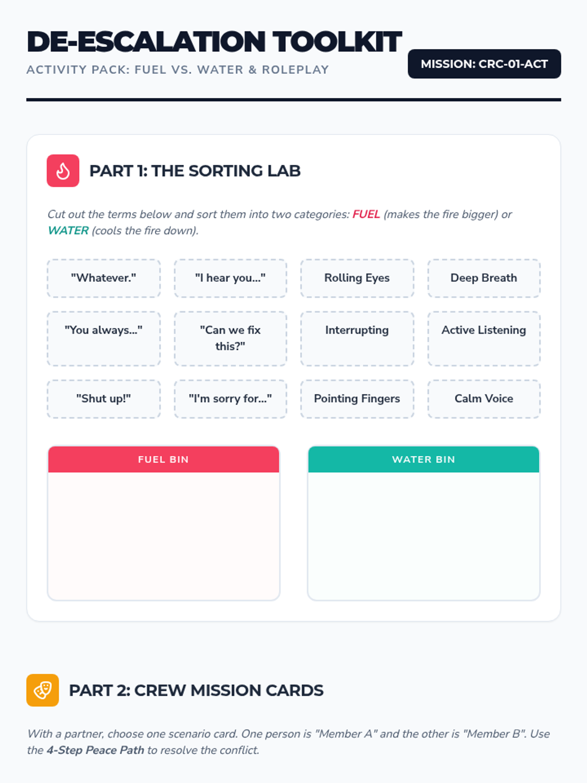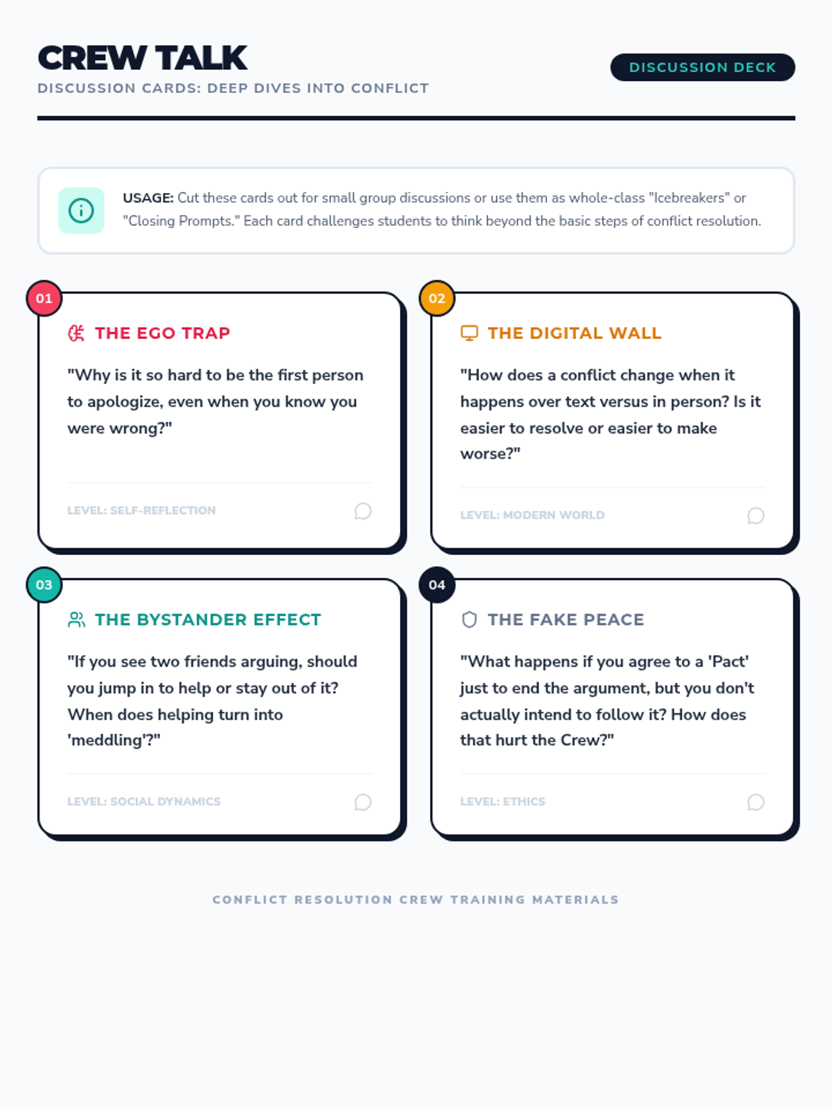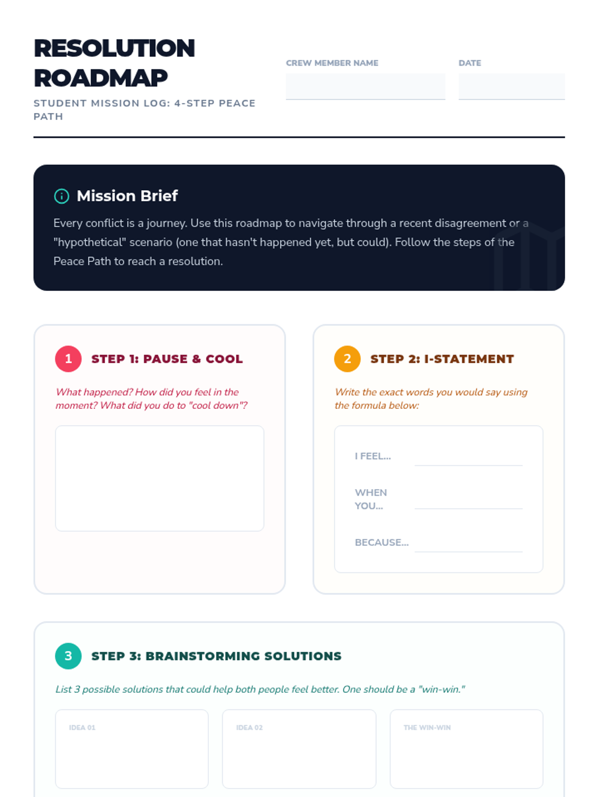 This series empowers students to become effective members of a 'Conflict Resolution Crew' by teaching practical, step-by-step strategies for peacefully resolving disagreements and de-escalating conflicts.