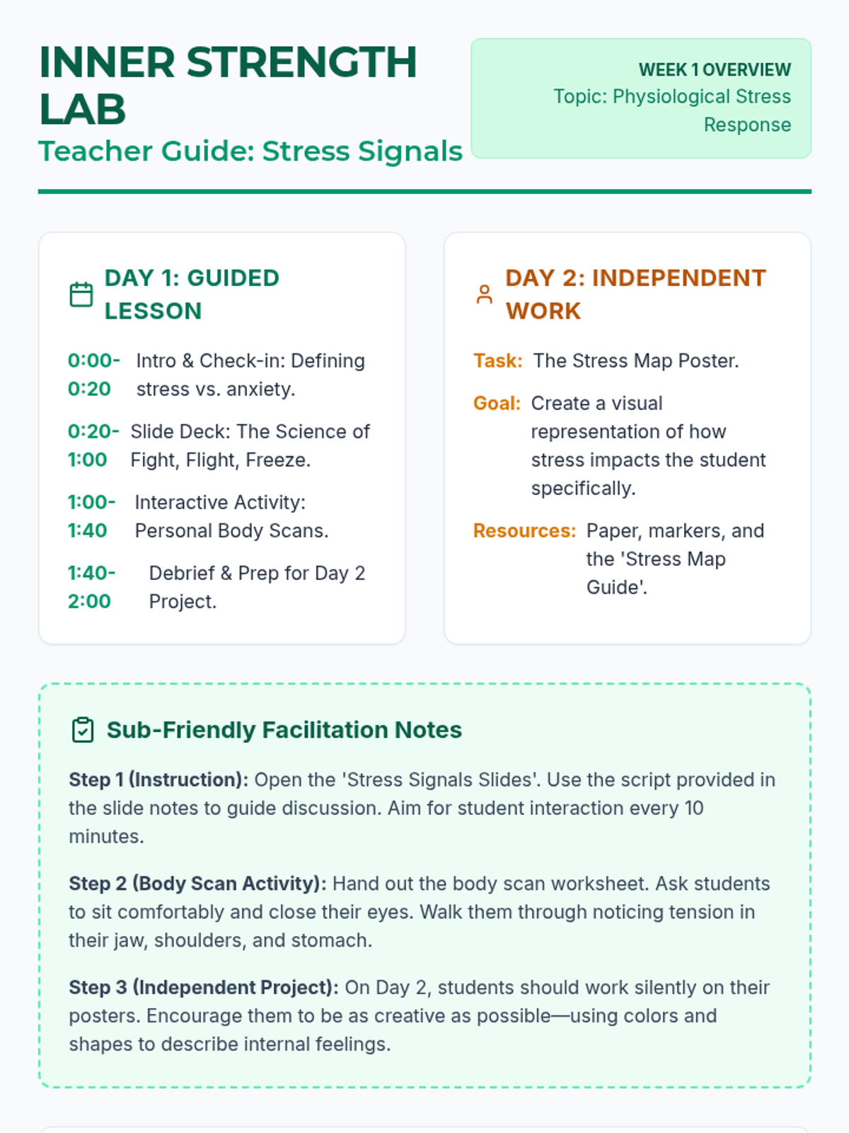 A comprehensive substitute teacher packet for the 8th-grade 'Teen Challenges' course, focusing on the Inner Strength Lab and the novel Hatchet. Includes daily procedures, survival-themed activities, and feedback forms.