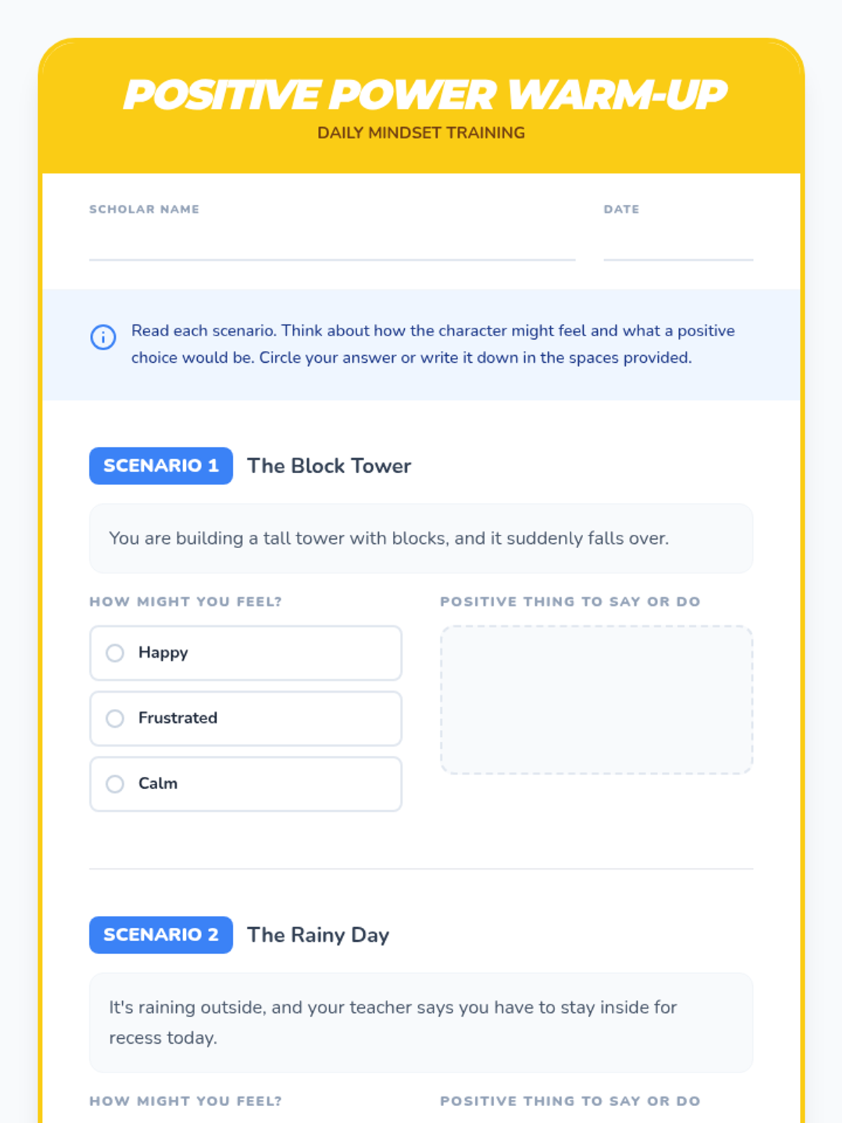 A 12-session emotional intelligence and literacy program designed for K-6 students. Using a 'Trailblazer' theme, Pathfinders develop self-awareness, confidence, and critical decision-making skills to replace impulsive reactions with thoughtful choices. Includes safety scenarios and practical tools for managing exam stress.