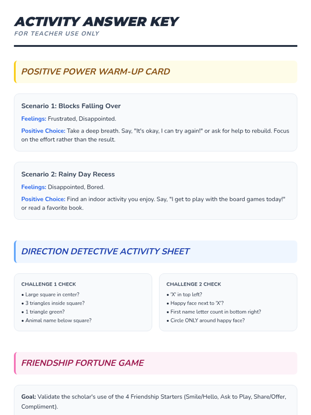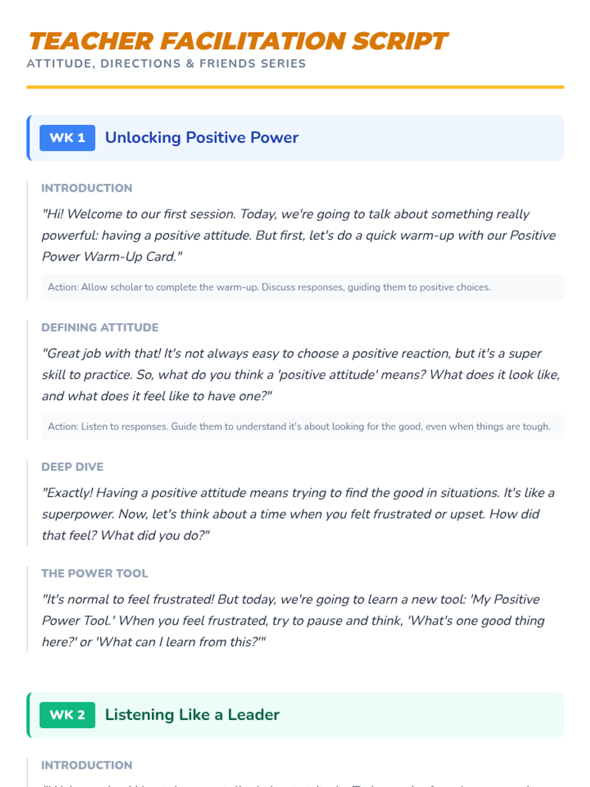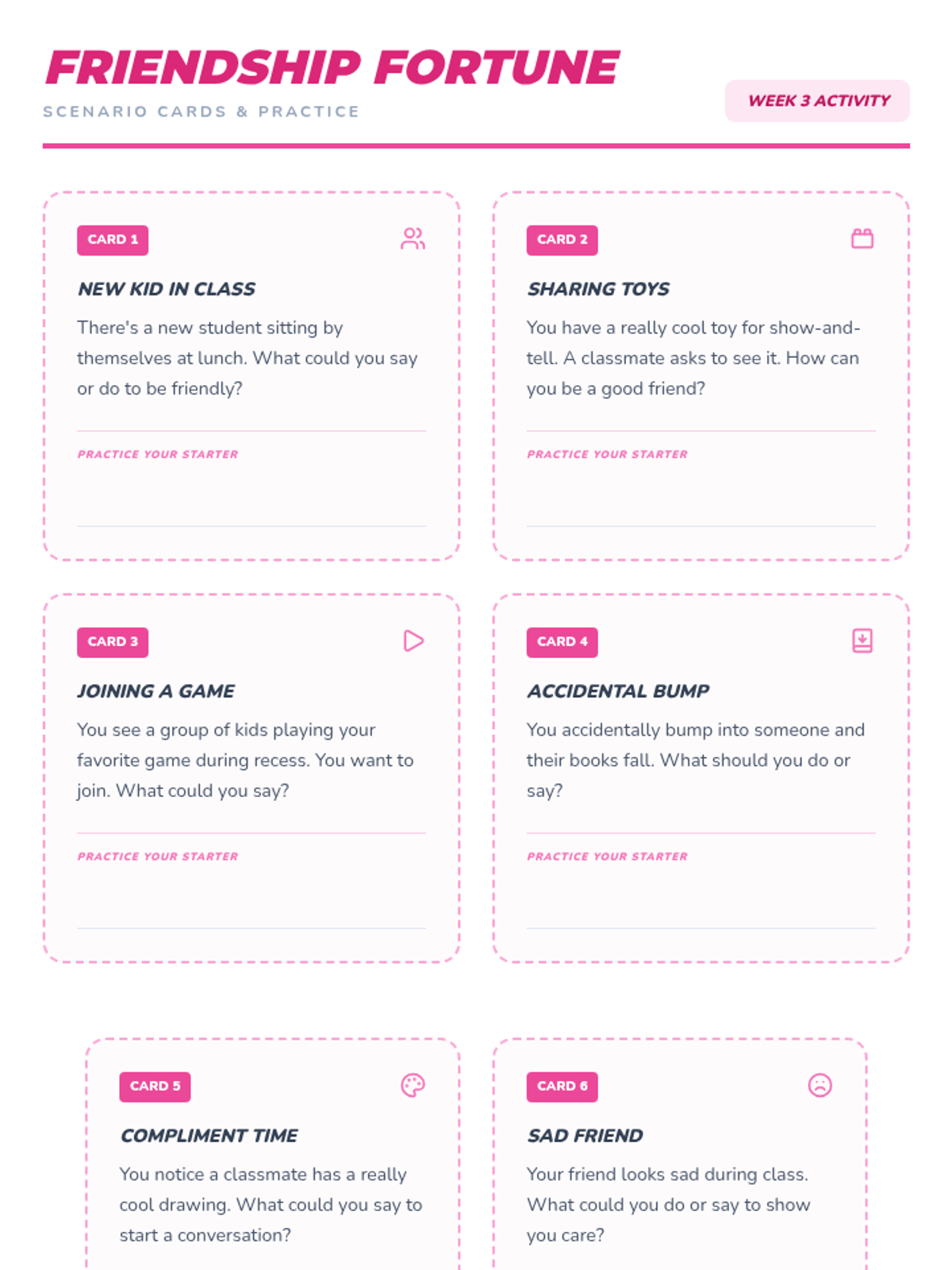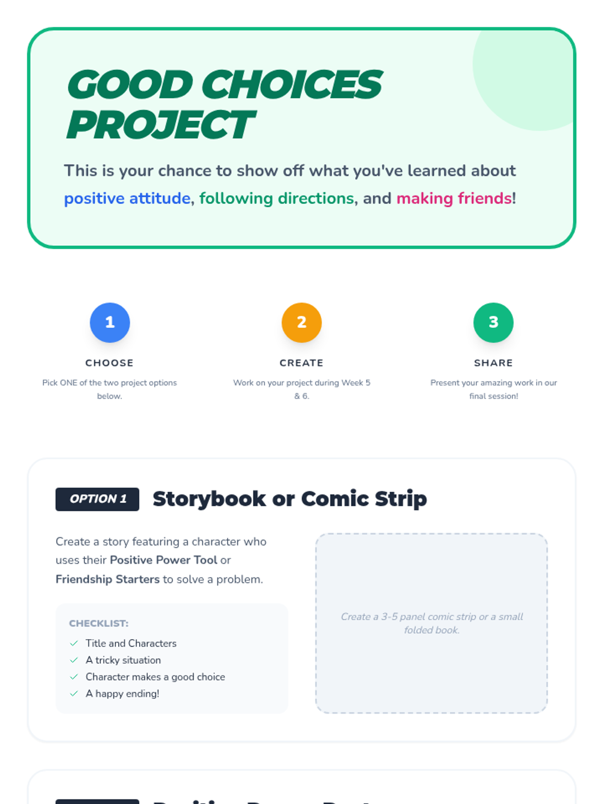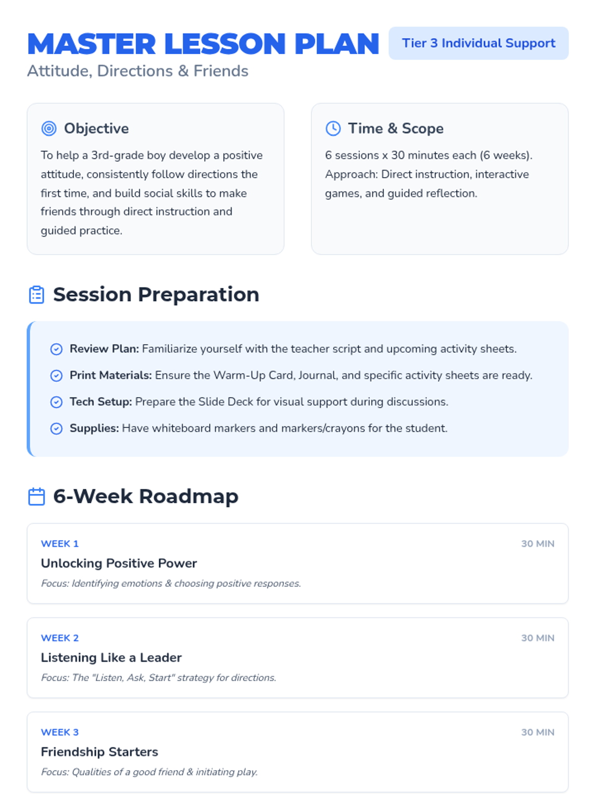 A 6-week social-emotional learning series for 3rd grade, focusing on attitude, listening skills, and friendship building through interactive activities and a final project.