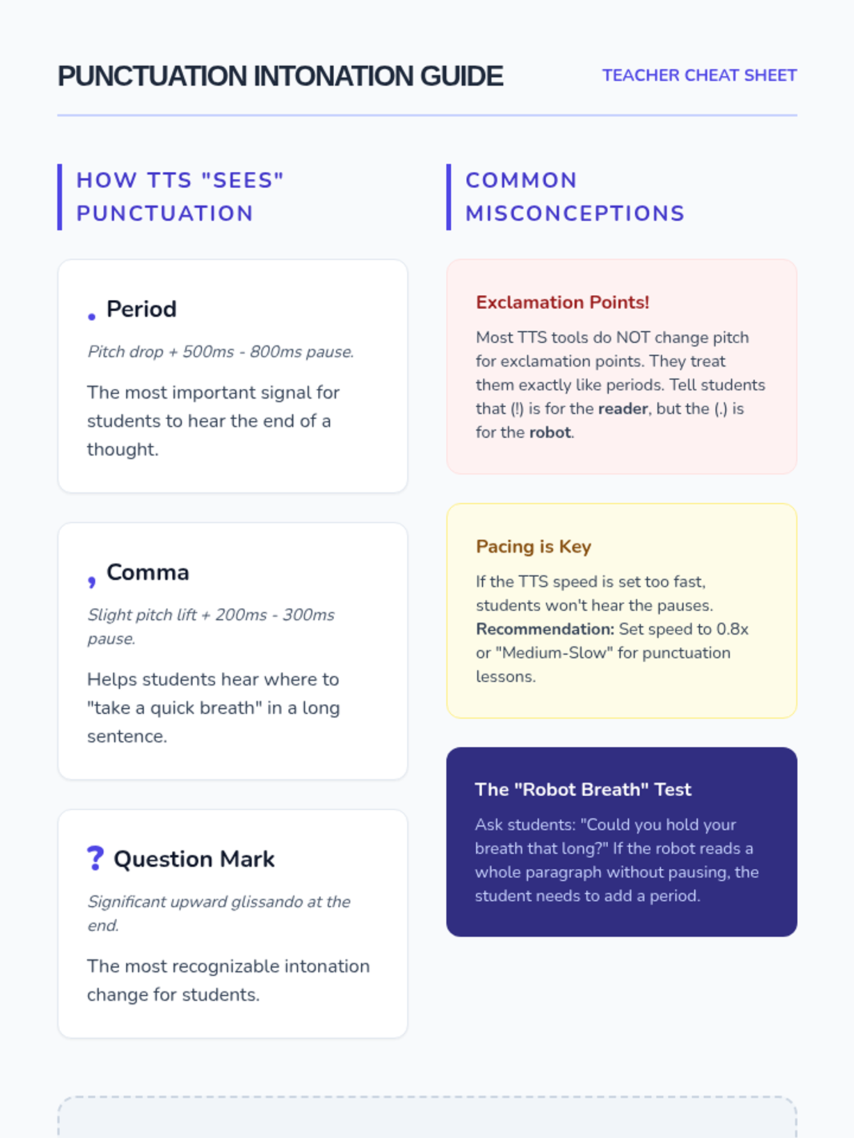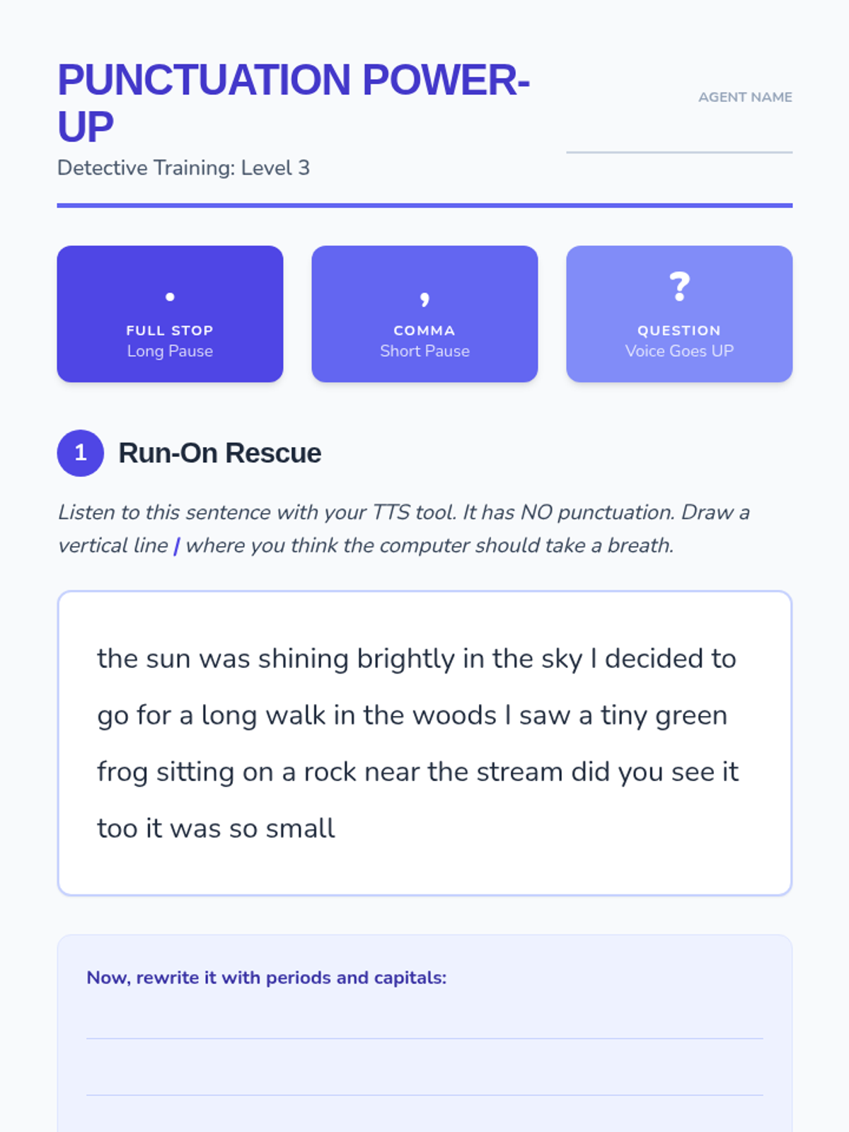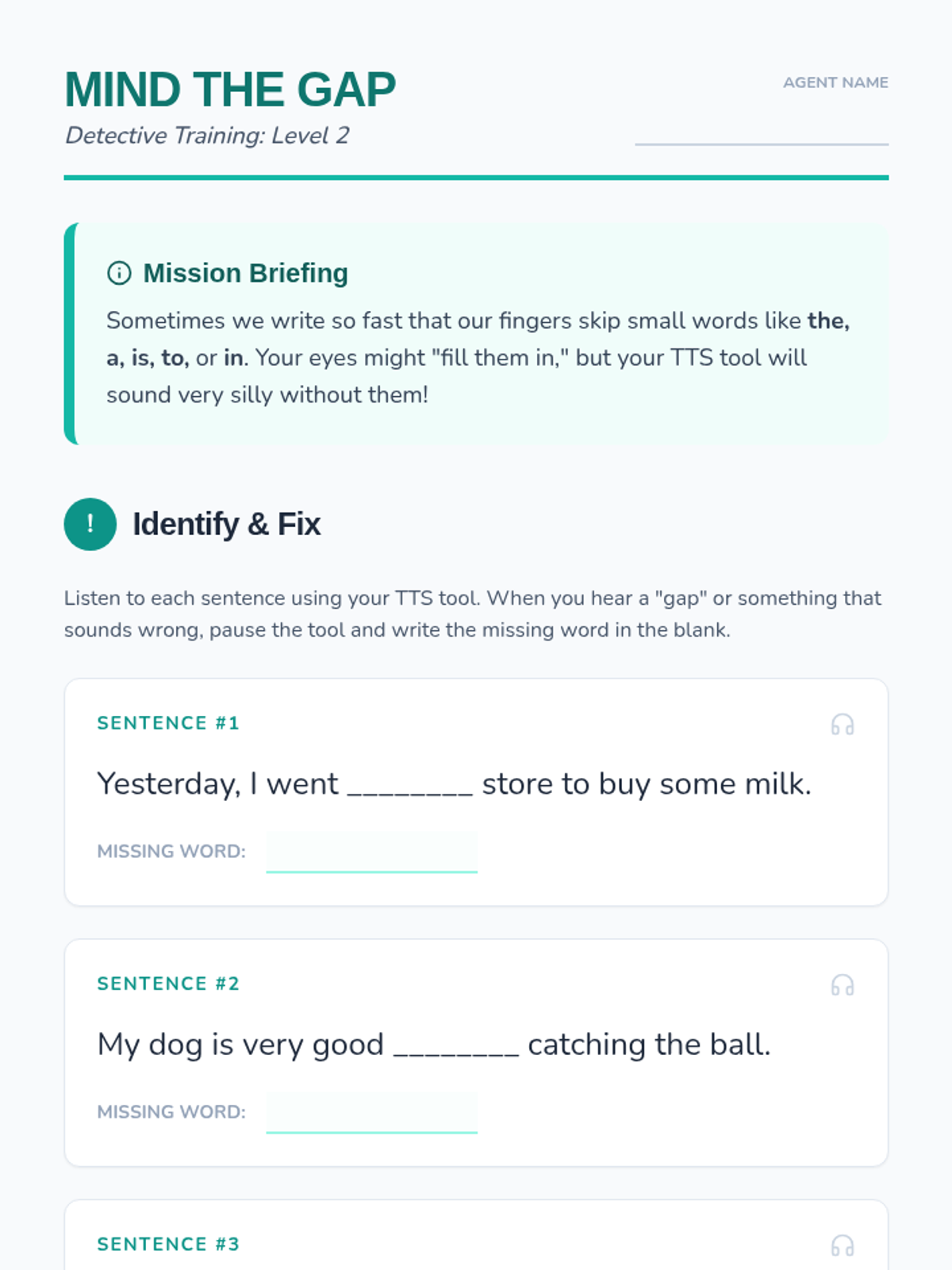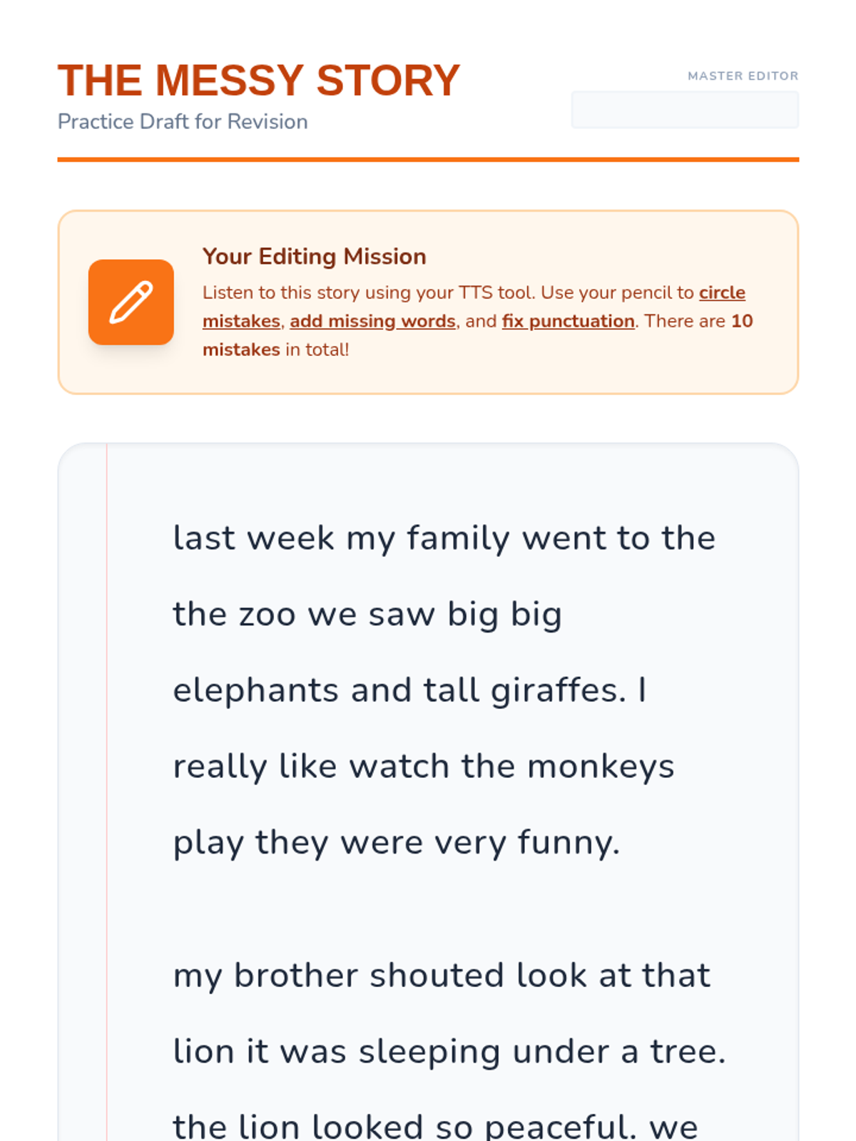 This sequence teaches 4th-grade students how to use Text-to-Speech (TTS) technology as a revision tool. Students learn to identify skipped words, awkward phrasing, and punctuation errors by listening to their writing read aloud, moving from guided error detection to independent revision of their own work.