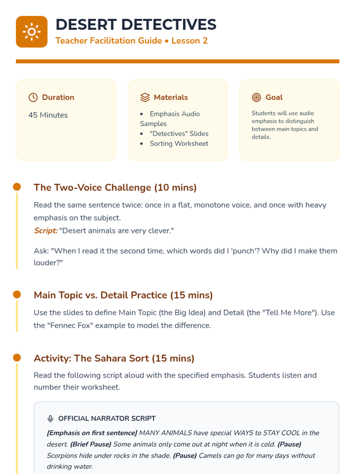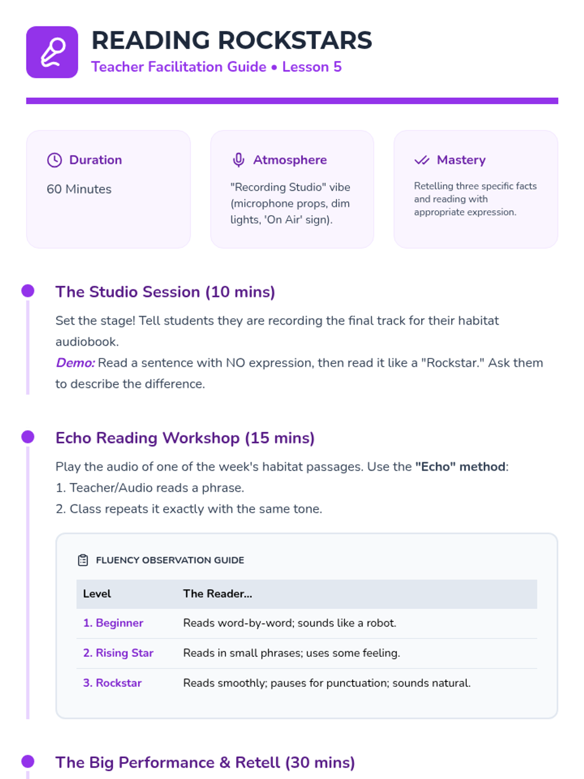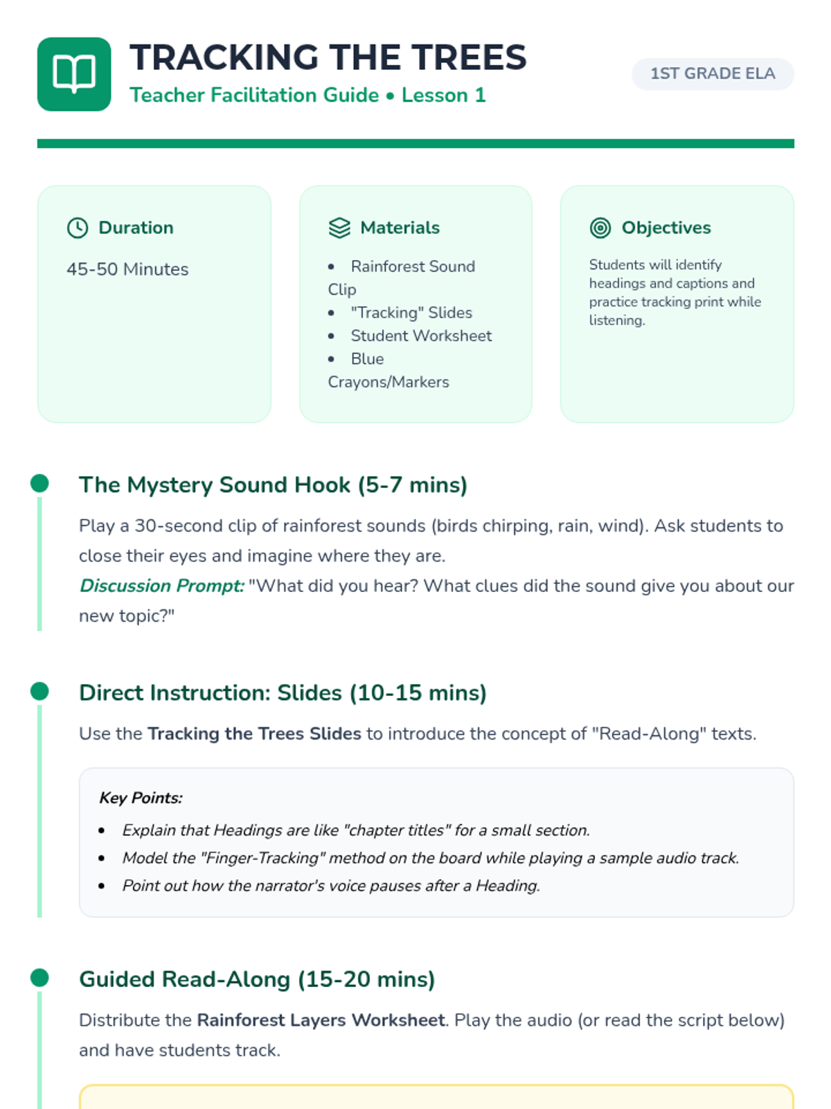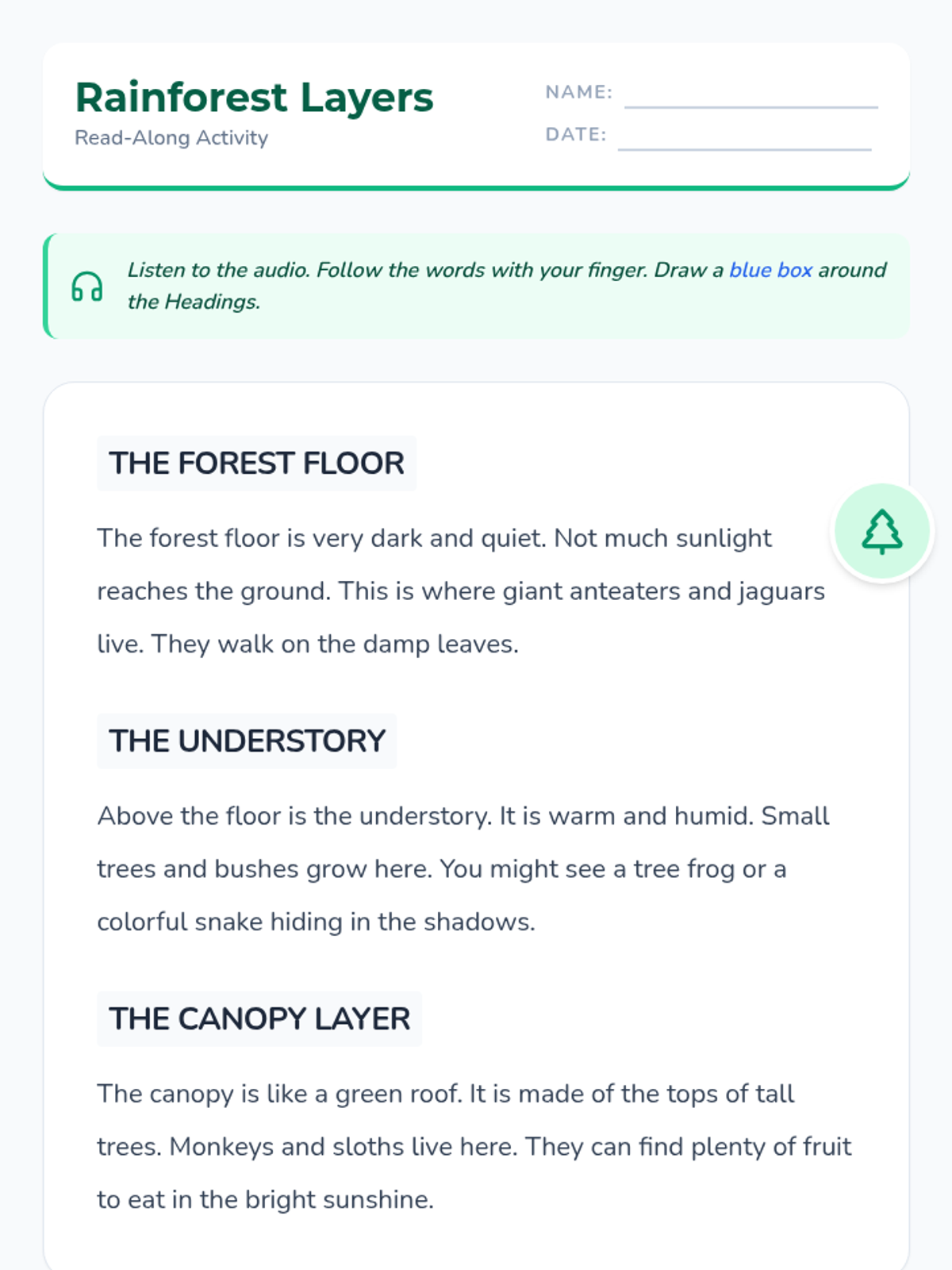 A sequence for 1st Grade students to build reading comprehension and fluency using audio-supported non-fiction texts about animal habitats. Students learn to identify text features, main ideas, and vocabulary while connecting spoken words to print and images.