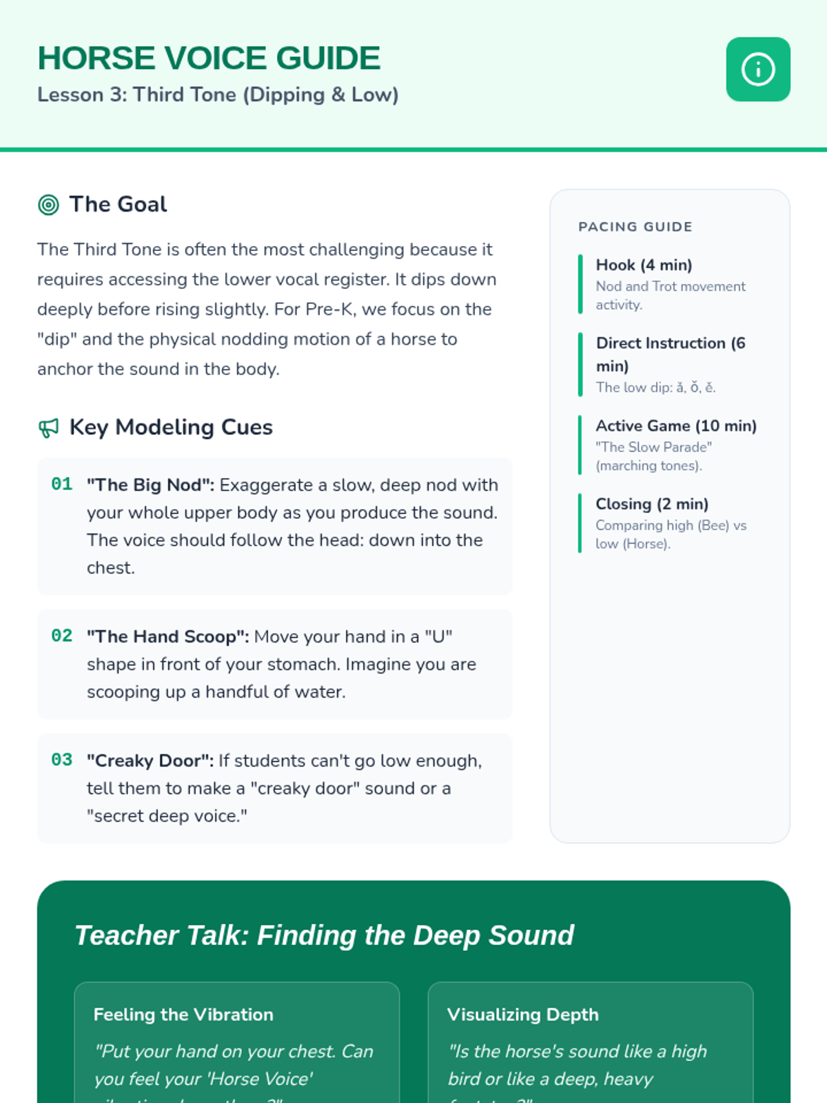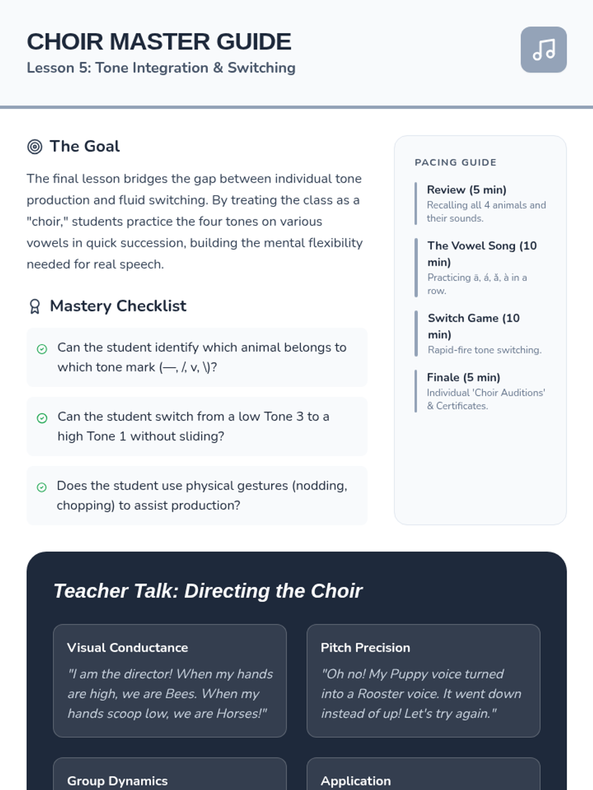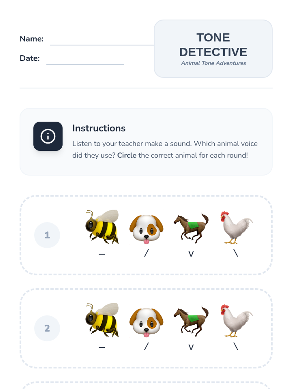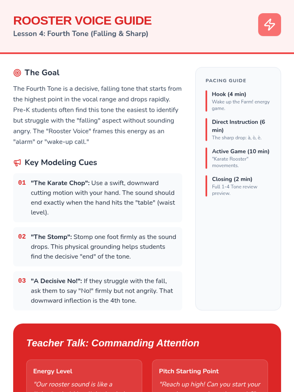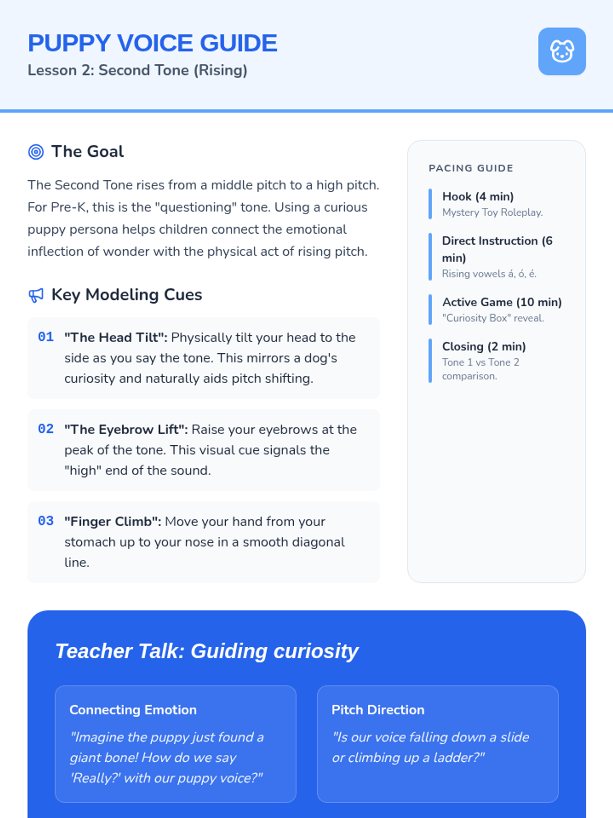A Pre-K Mandarin Chinese sequence that uses animal associations (Bee, Puppy, Horse, Rooster) to teach the four tones through auditory differentiation and vocal mimicry. Students move from animal sounds to linguistic pitch patterns, anchoring abstract tones in concrete personas.