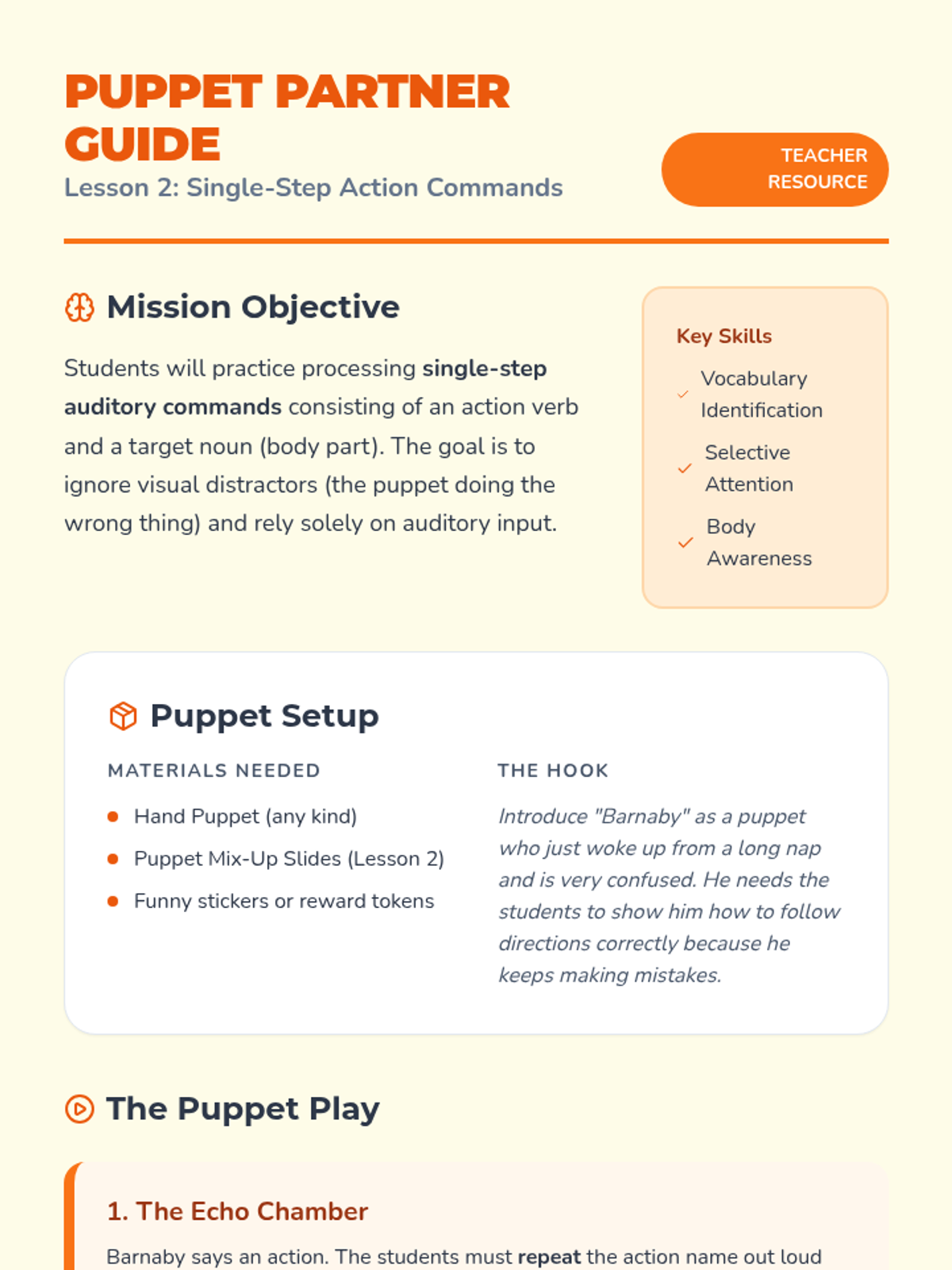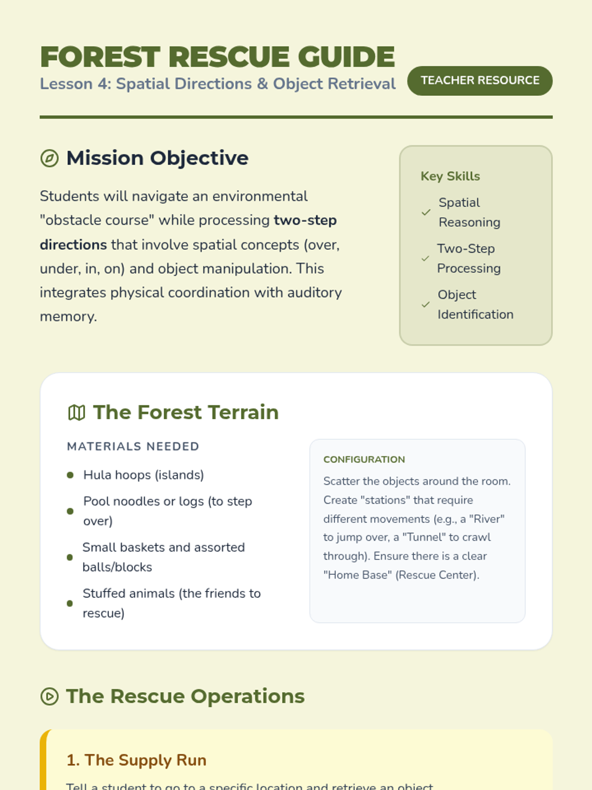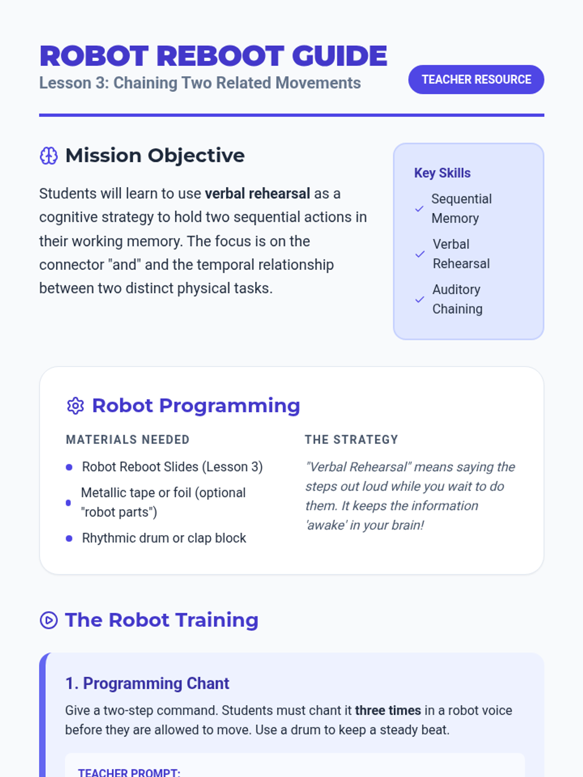 A Pre-K sequence focused on developing working memory and auditory processing through movement-based games, progressing from single-step inhibition to complex three-step motor chains.