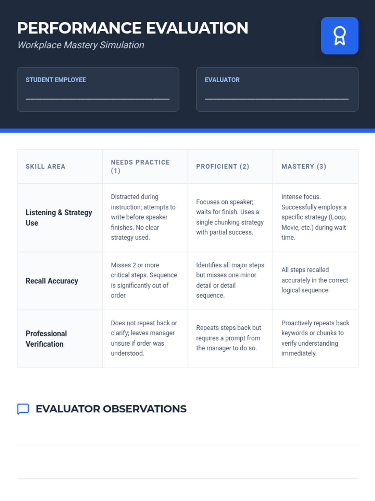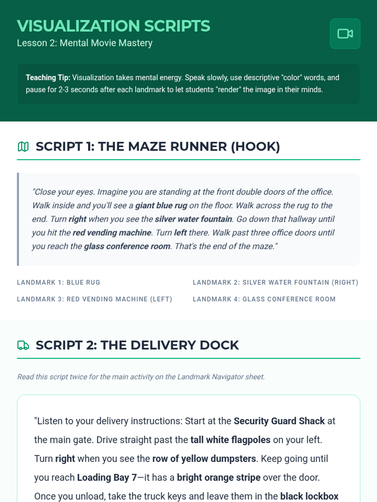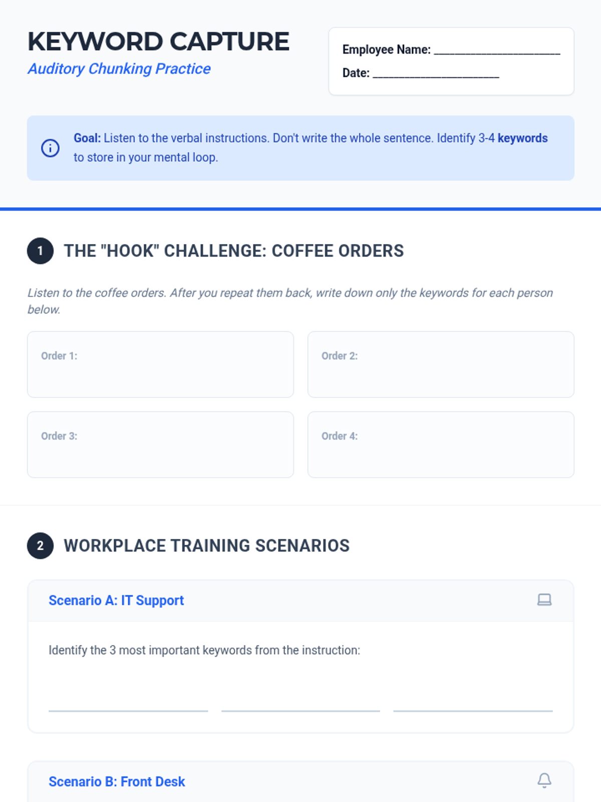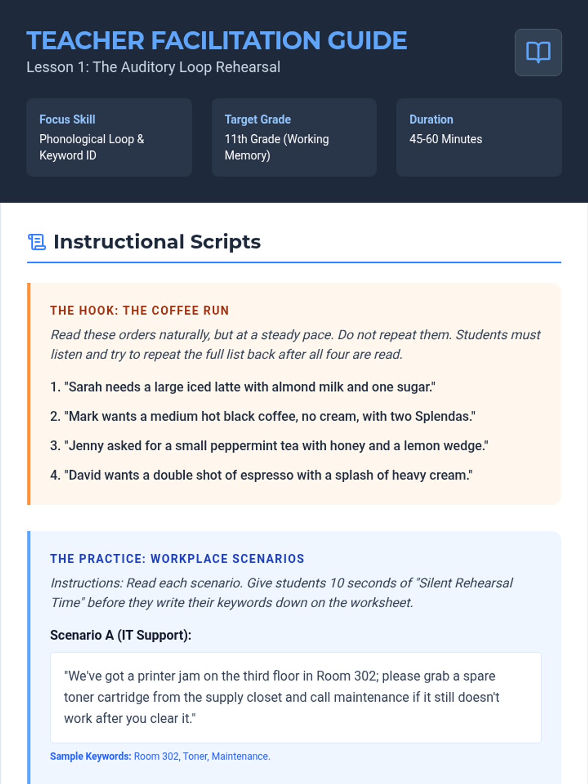 A 5-lesson sequence for 11th-grade students focusing on auditory chunking strategies to improve working memory in workplace settings. Students learn techniques like the phonological loop, visualization, contextual grouping, and mnemonics to execute complex verbal instructions.