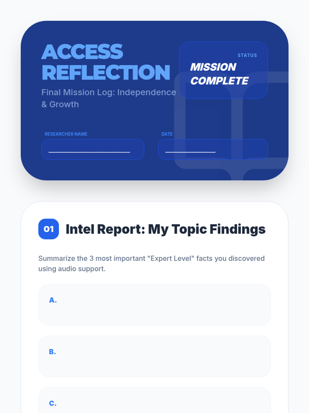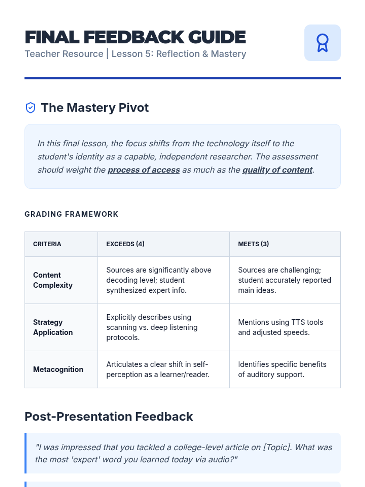 A project-based unit where 6th-grade students use text-to-speech technology to access and analyze complex informational texts. Students develop research skills, digital literacy, and metacognitive awareness of their own learning tools.