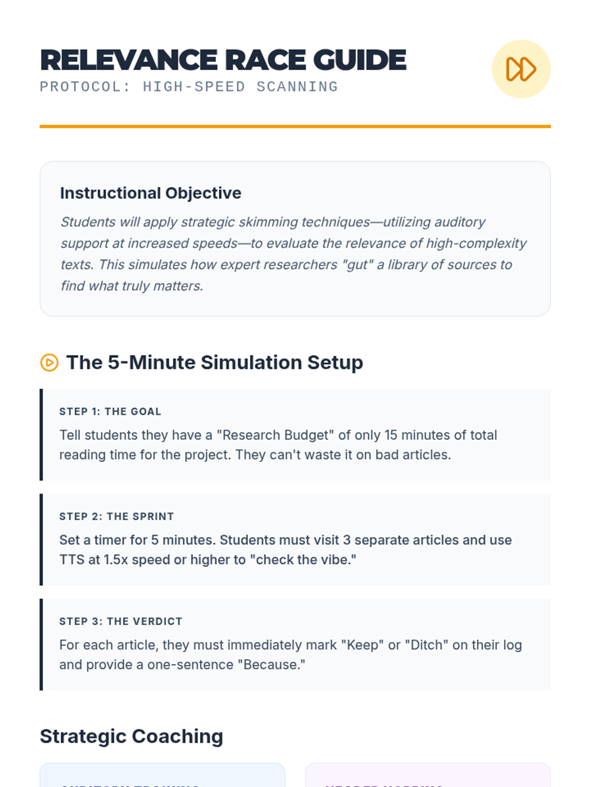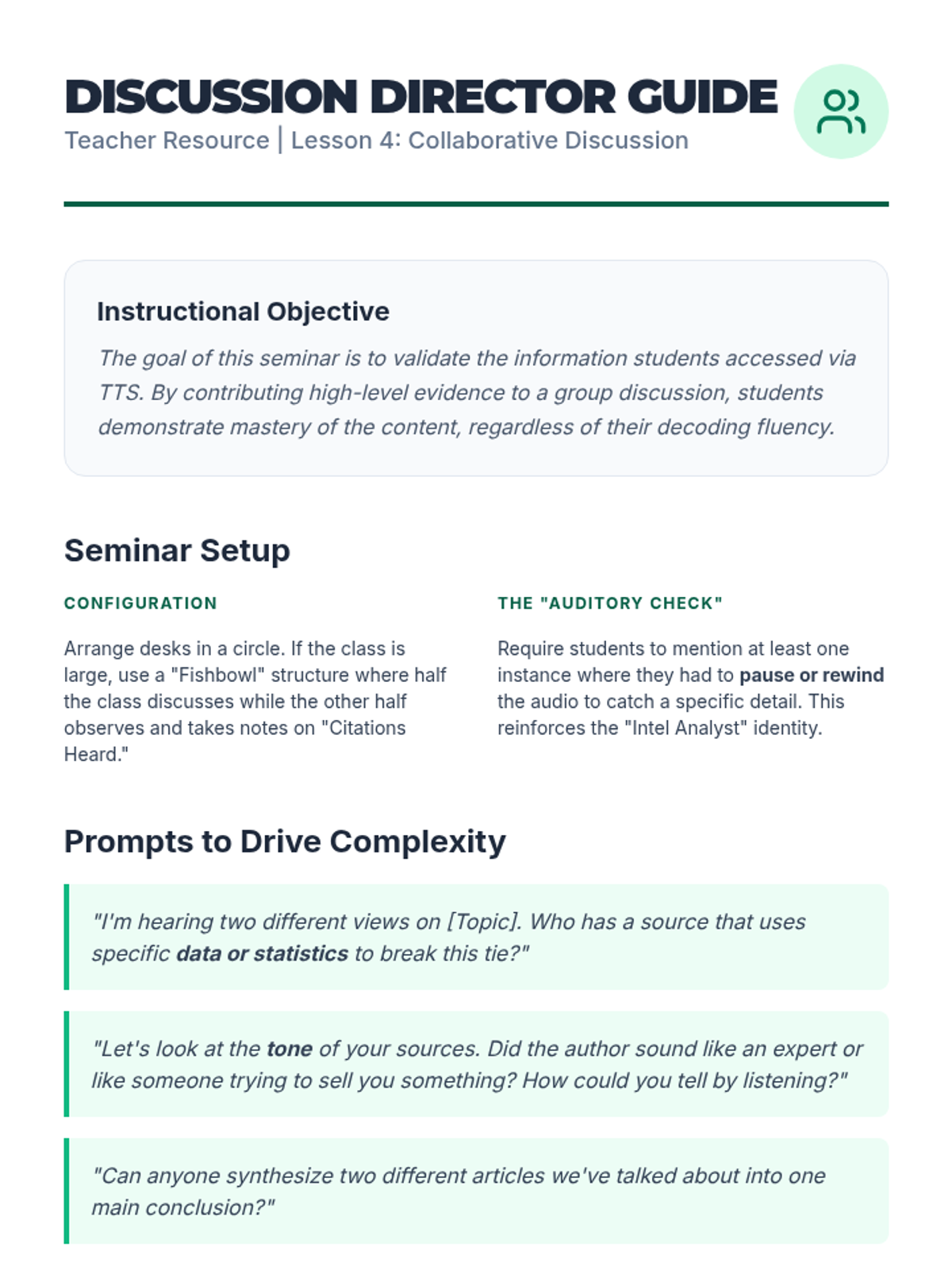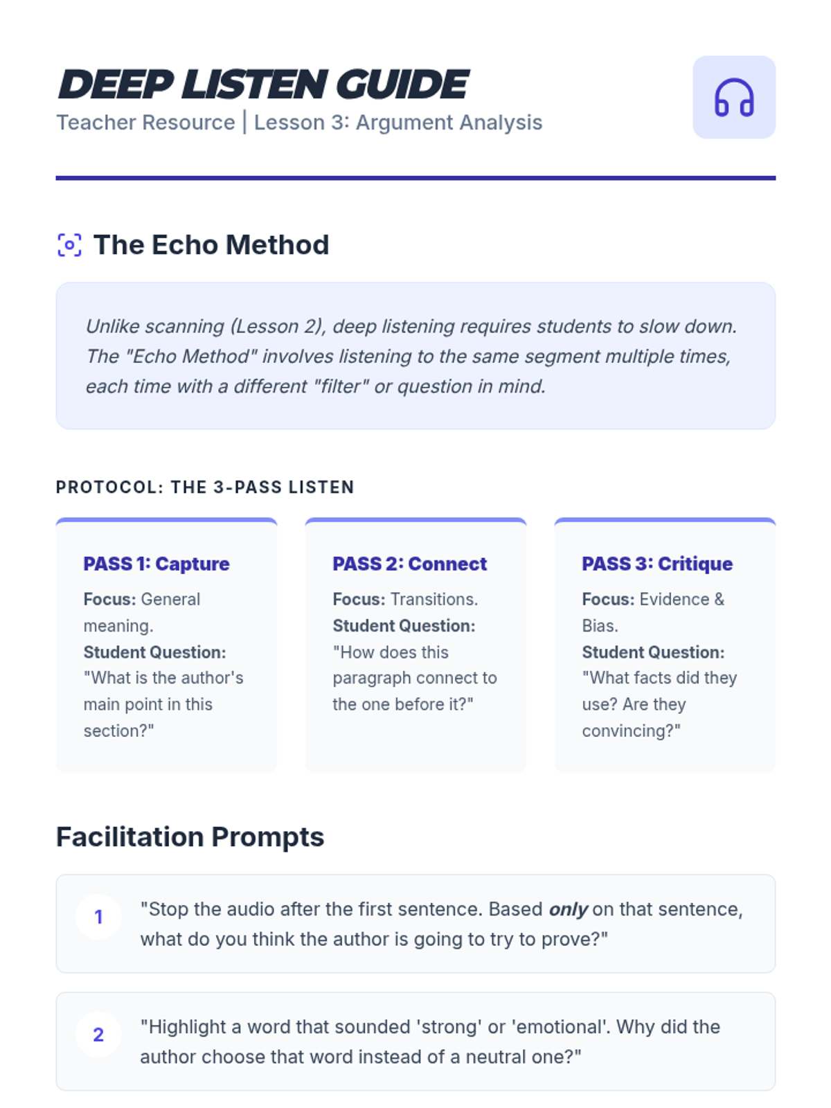 This sequence shifts the focus from assistive technology to the cognitive strategies required for auditory learning. Students engage in inquiry-based activities to distinguish between passive hearing and active listening, applying specific comprehension strategies while using text-to-speech (TTS) to access grade-level texts.