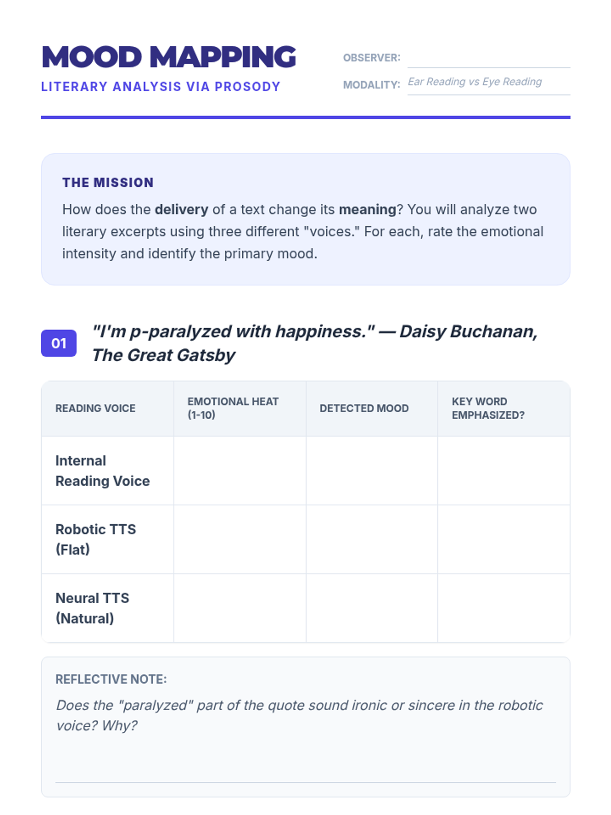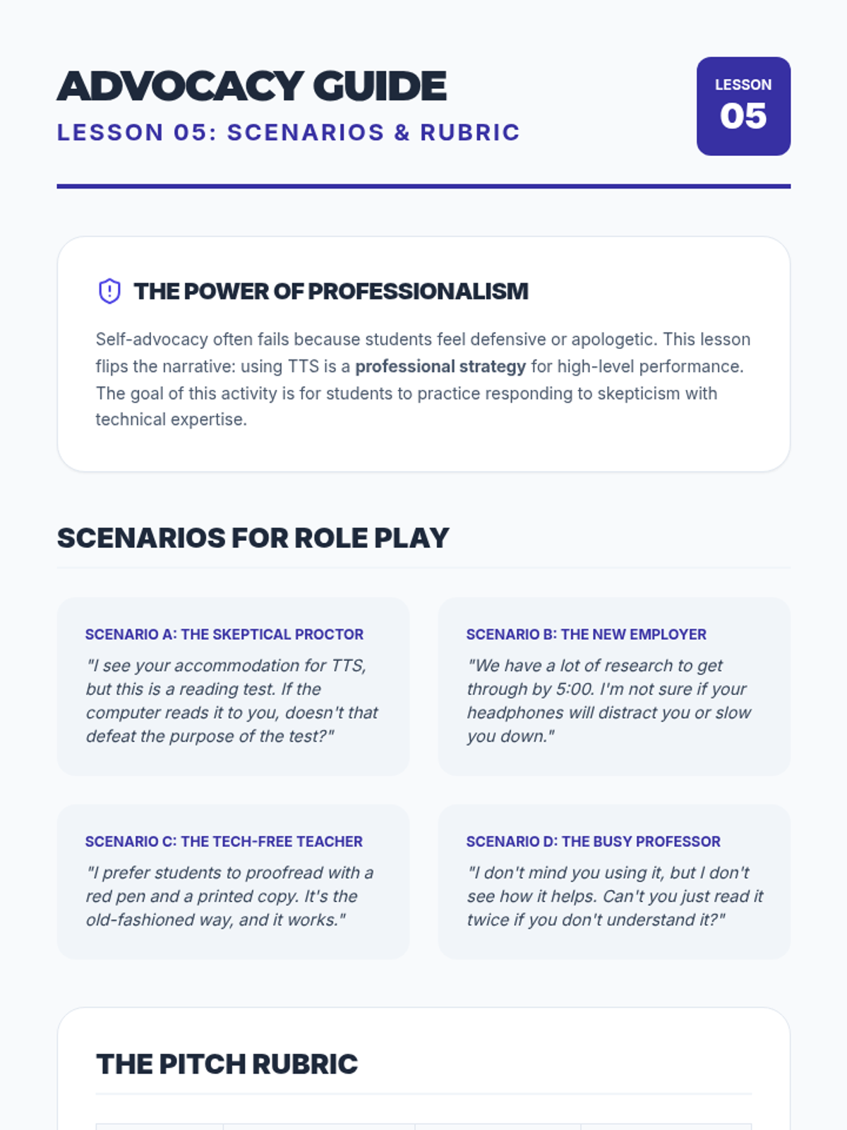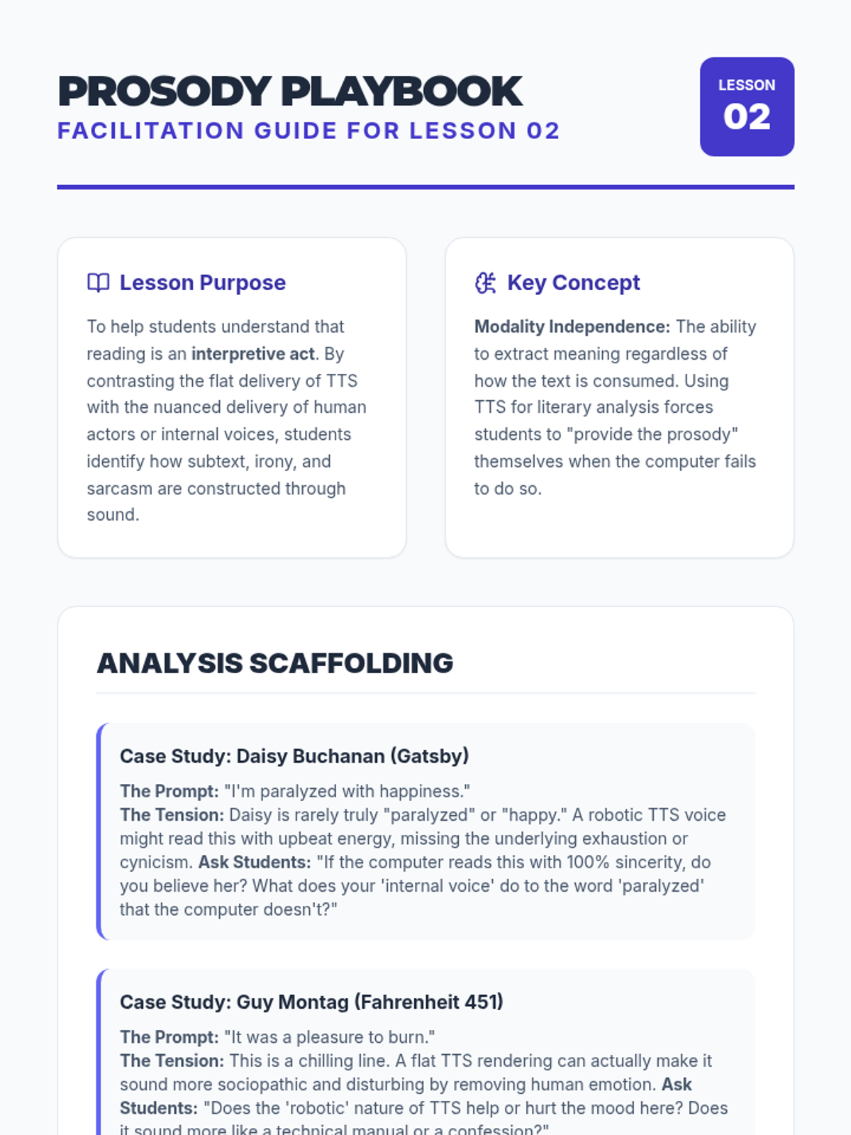 A 10th-grade sequence focusing on the cognitive and analytical applications of Text-to-Speech (TTS). Students transition from using TTS as a basic accommodation to leveraging it as a sophisticated tool for proofreading, literary analysis, and research efficiency, culminating in a self-advocacy project.