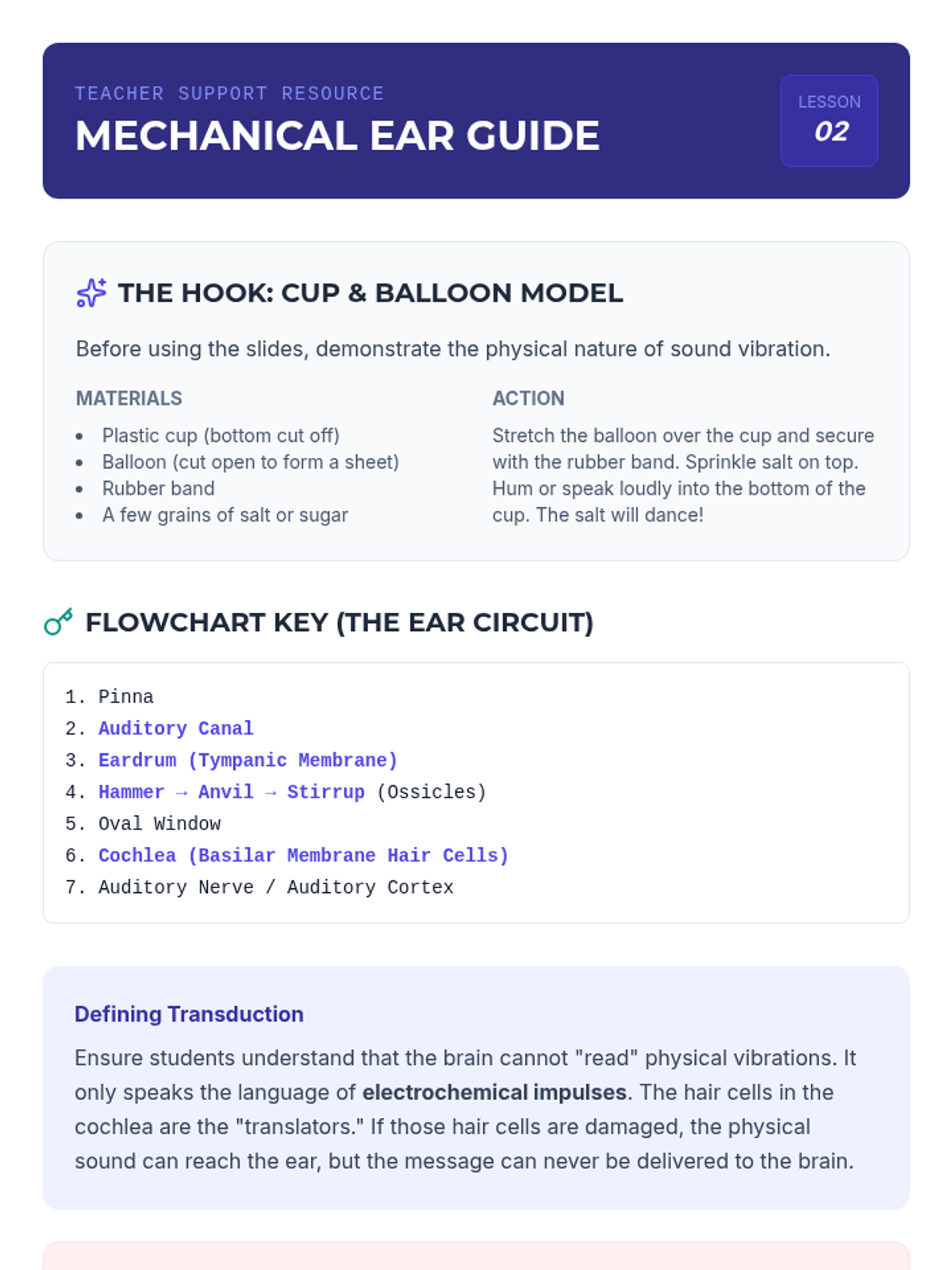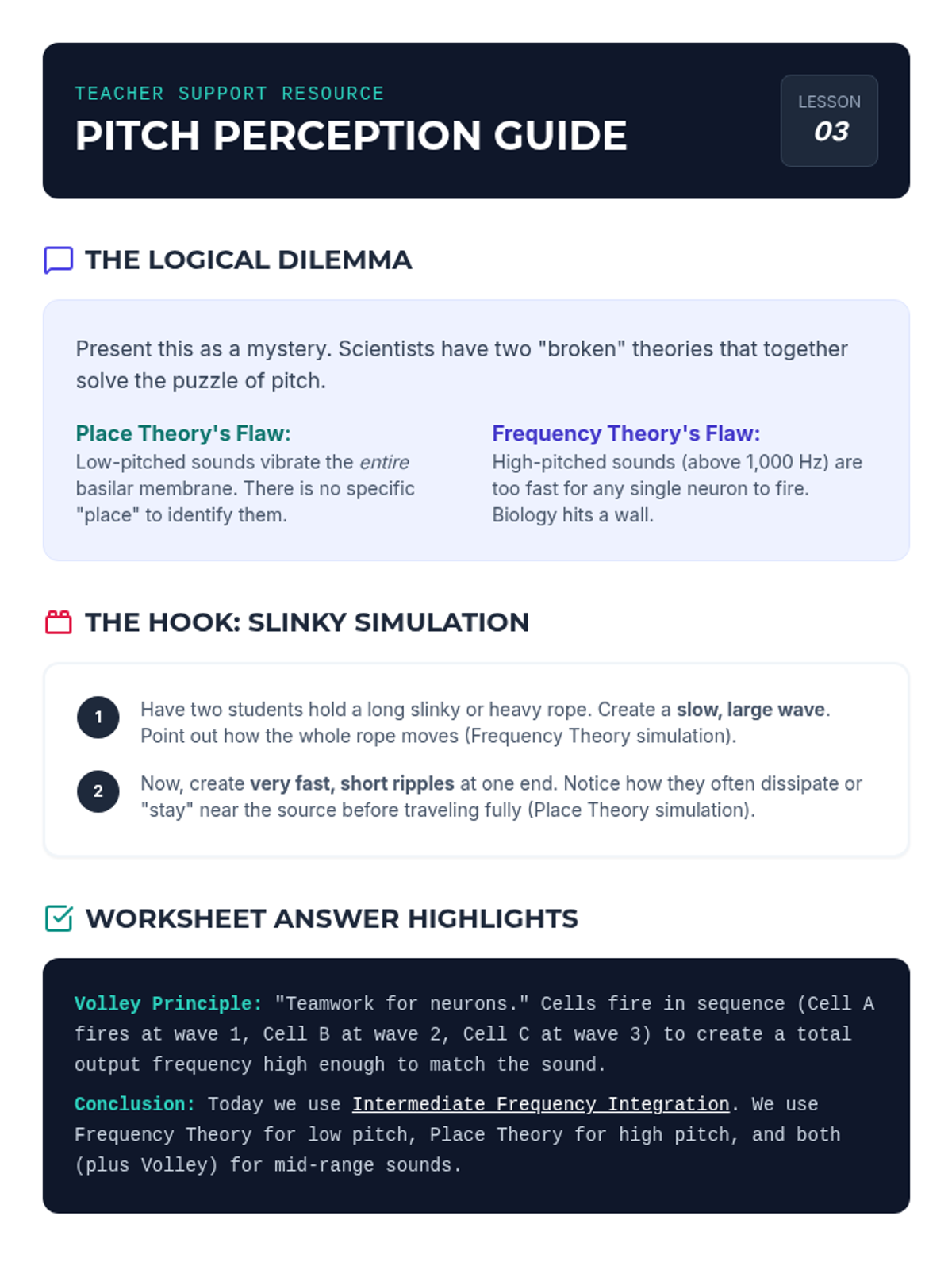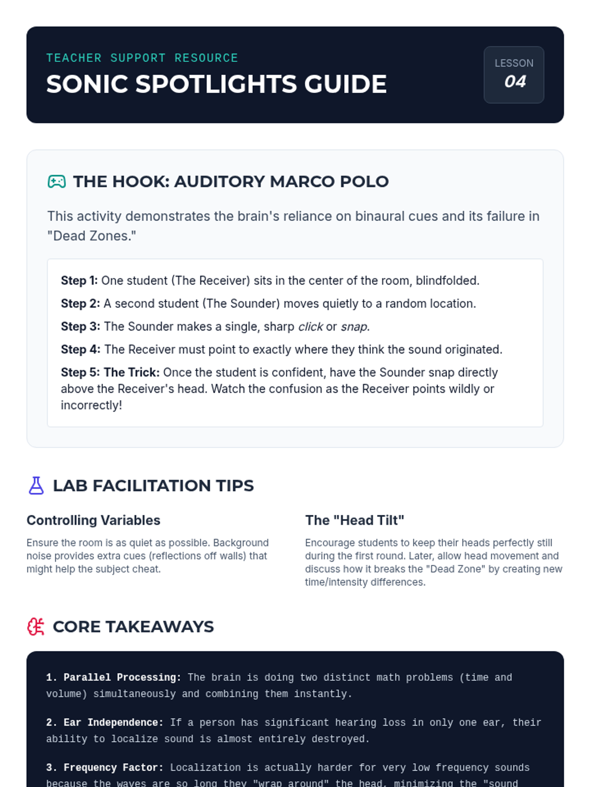 This sequence explores the auditory system, moving from the physics of sound waves to the complex anatomy of the ear and the psychology of pitch perception. Students will investigate how we localize sounds and analyze the physiological causes and prevention of hearing loss.
