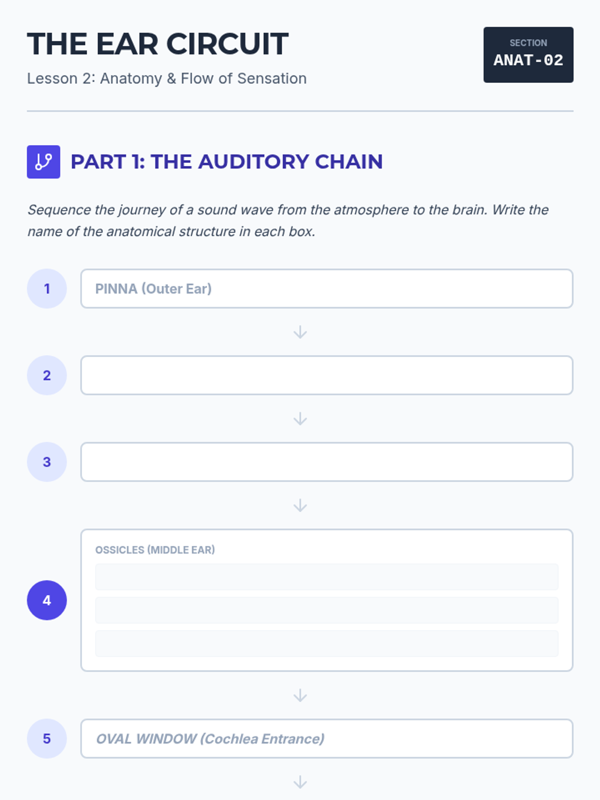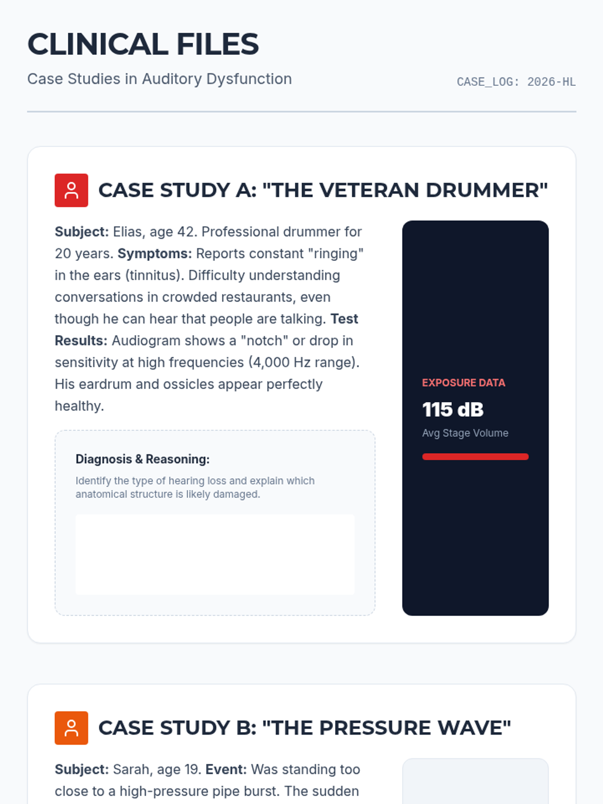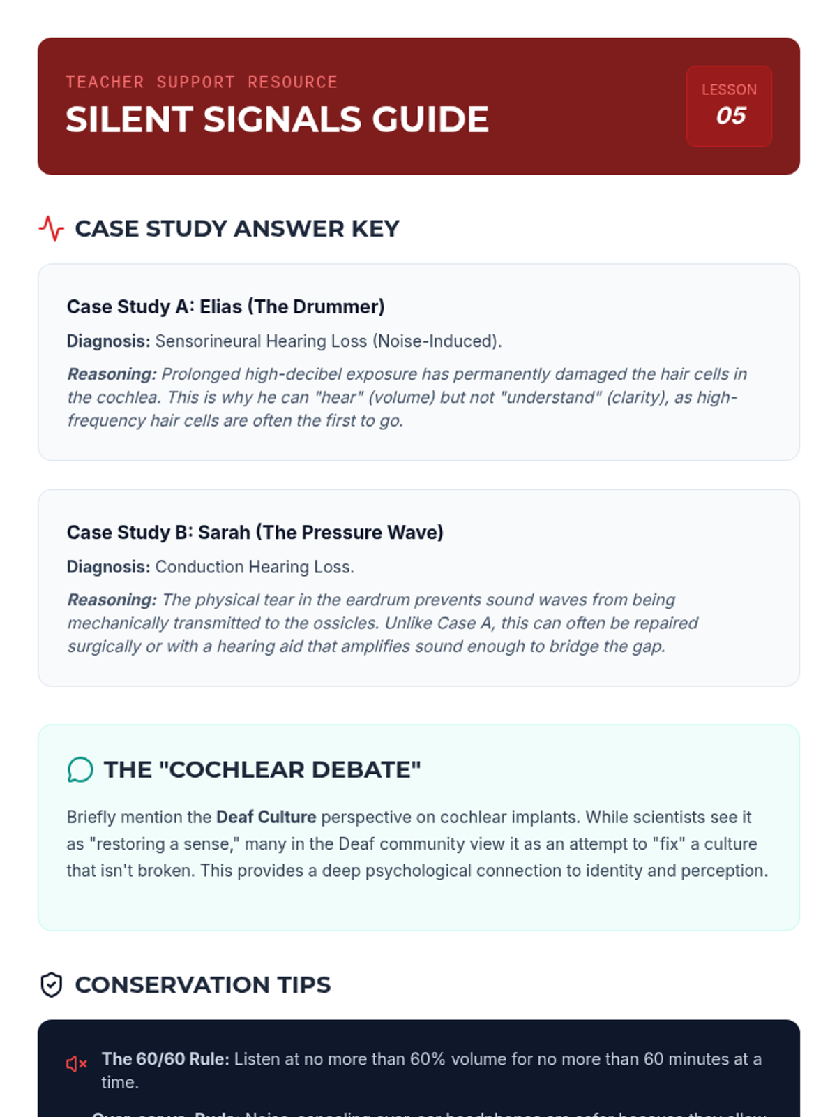 This sequence explores the auditory system, moving from the physics of sound waves to the complex anatomy of the ear and the psychology of pitch perception. Students will investigate how we localize sounds and analyze the physiological causes and prevention of hearing loss.