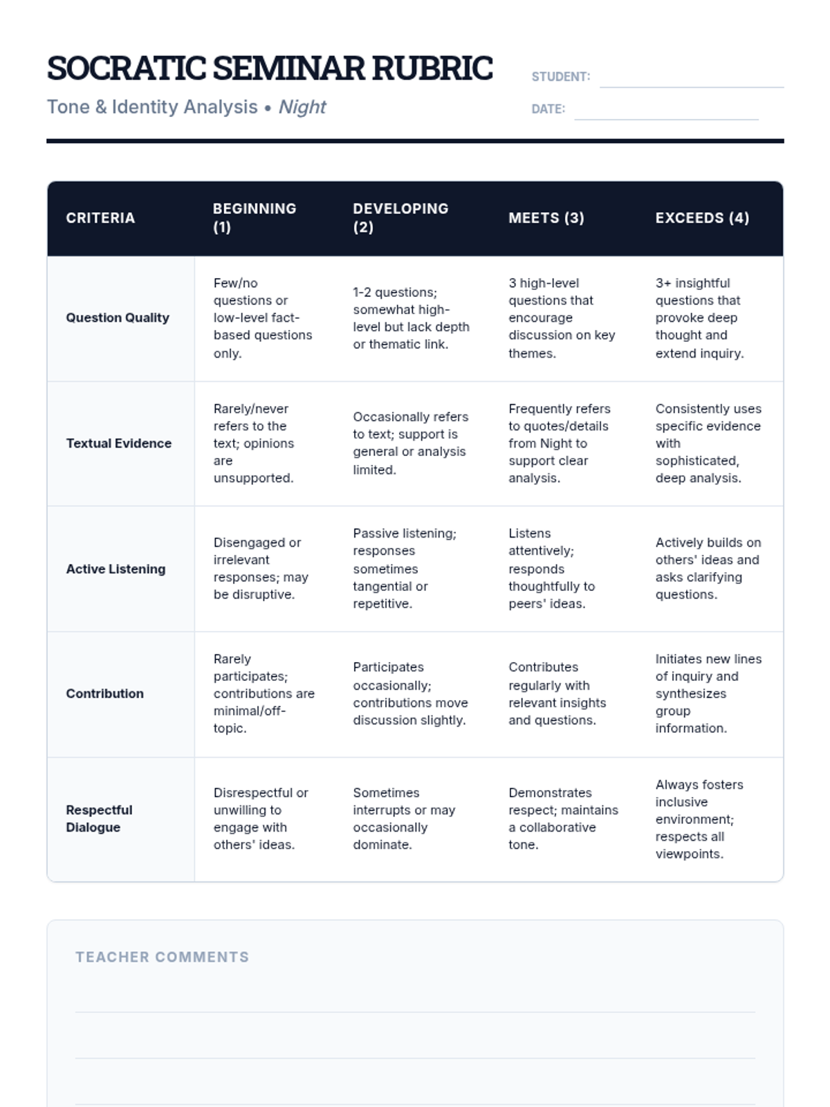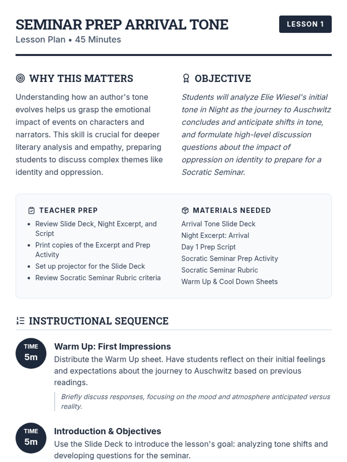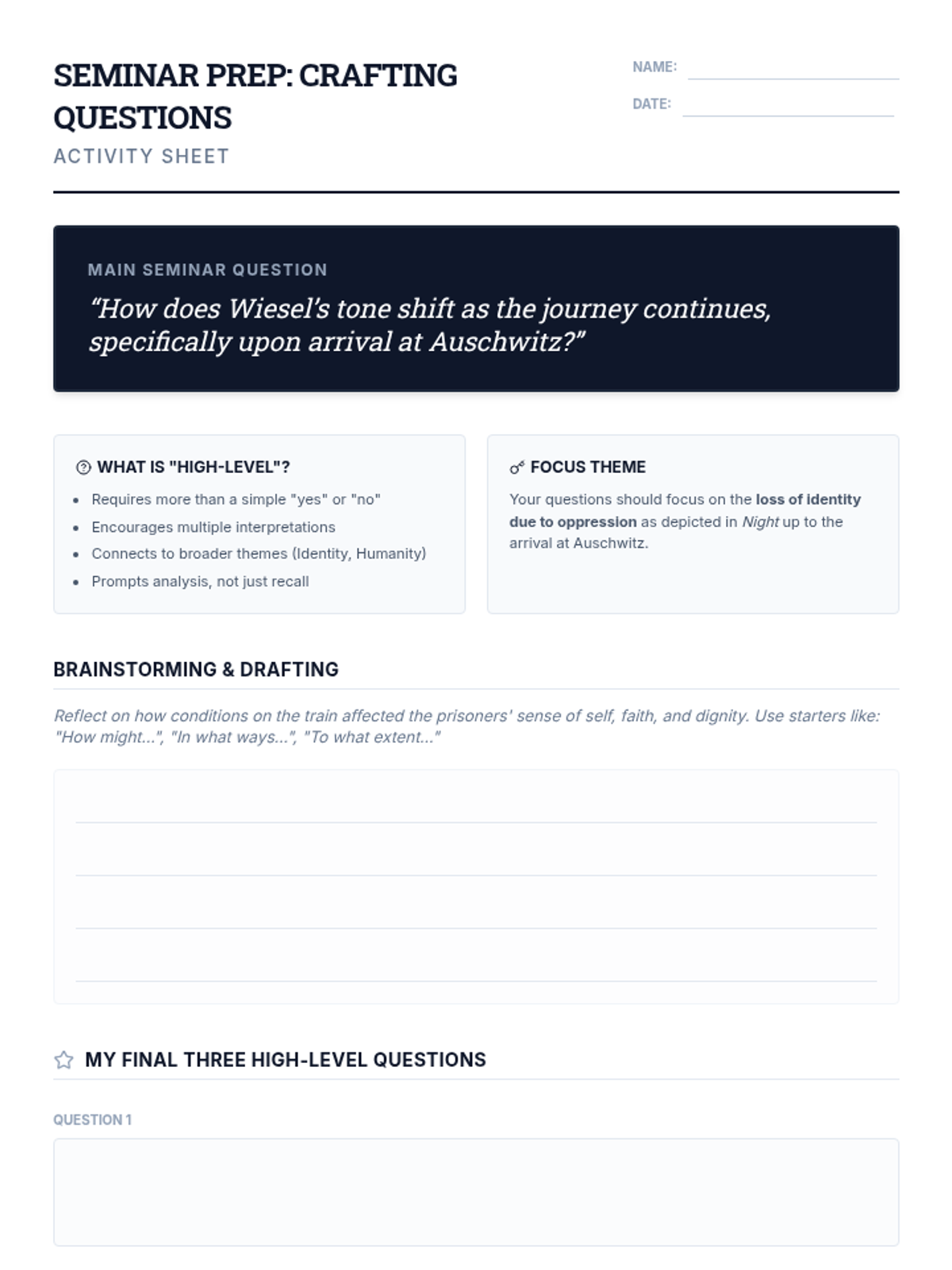 A two-part lesson sequence for advanced 8th-grade students focused on analyzing Elie Wiesel's tone in 'Night' and developing high-level questions for a Socratic Seminar on identity and oppression.