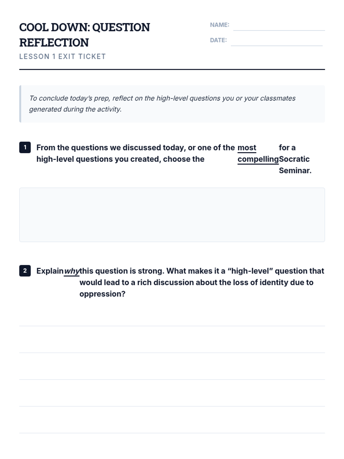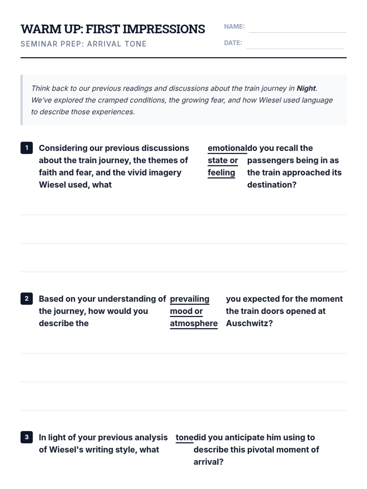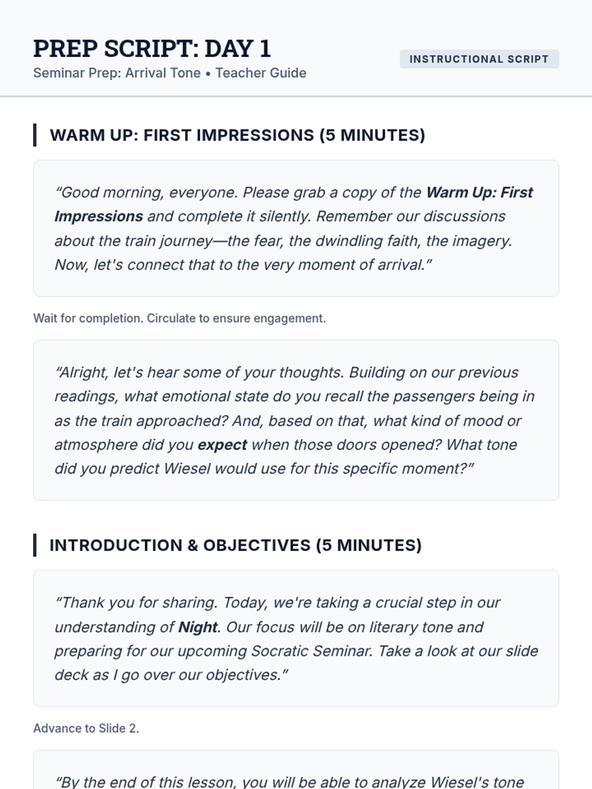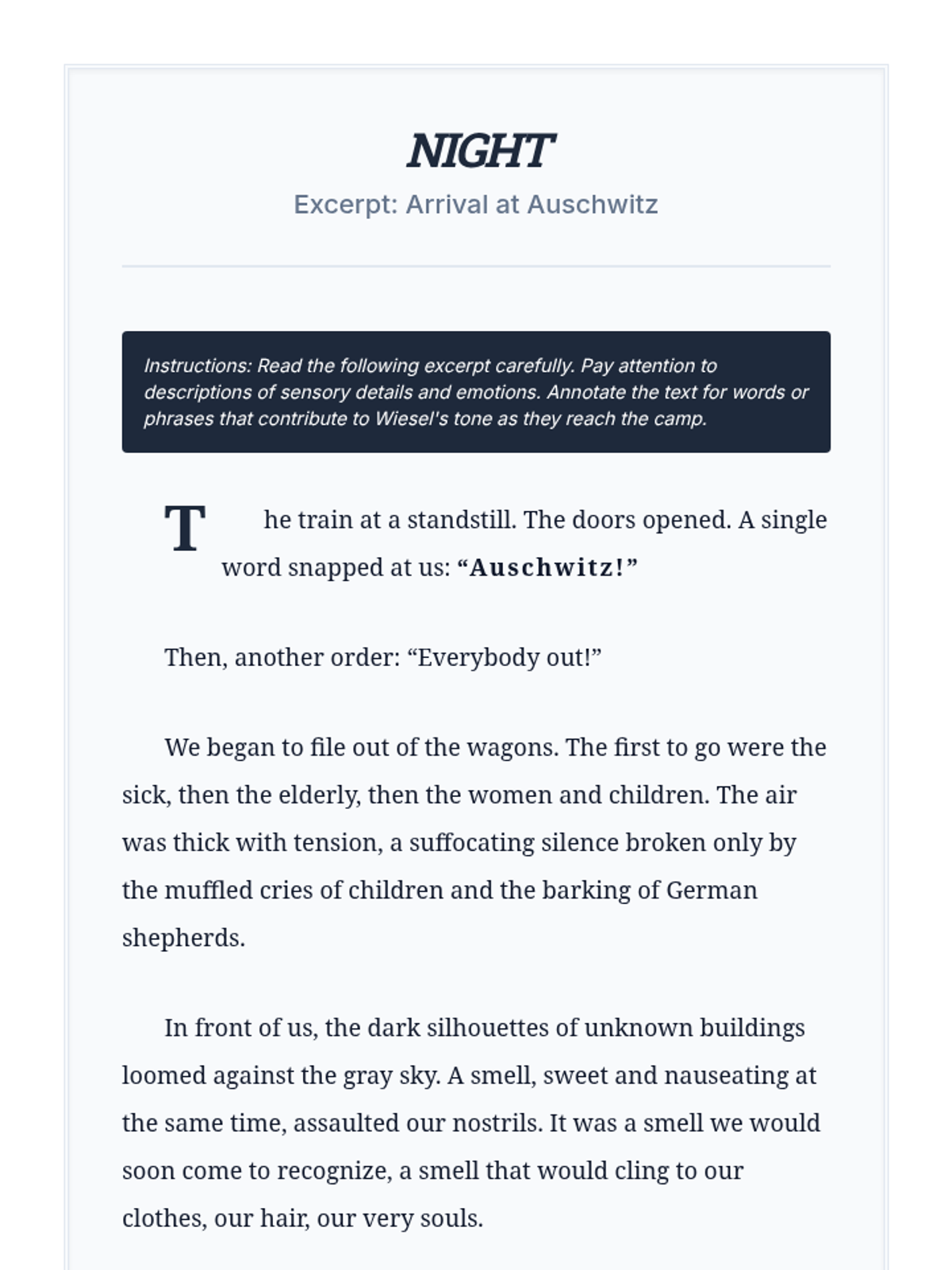 A two-part lesson sequence for advanced 8th-grade students focused on analyzing Elie Wiesel's tone in 'Night' and developing high-level questions for a Socratic Seminar on identity and oppression.