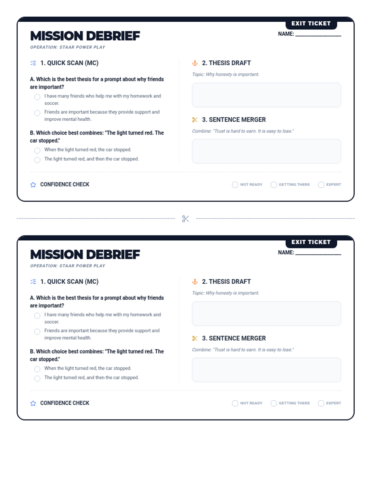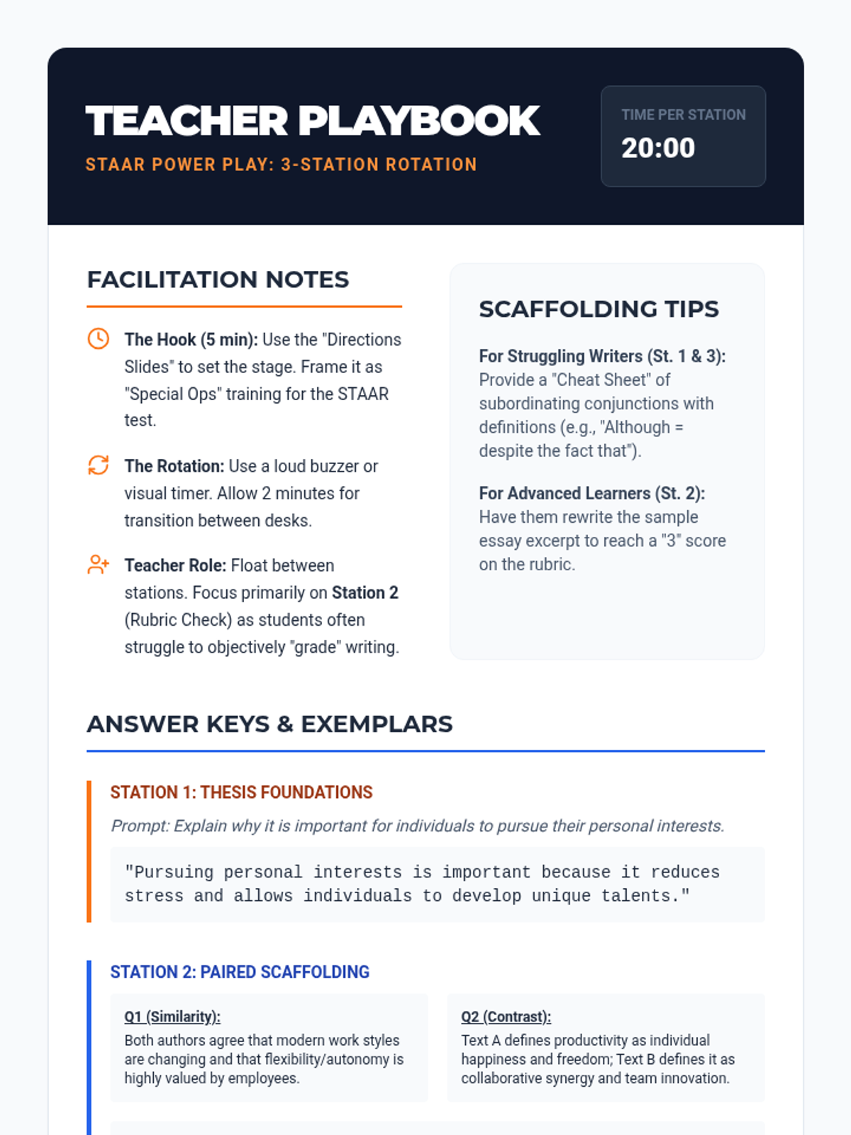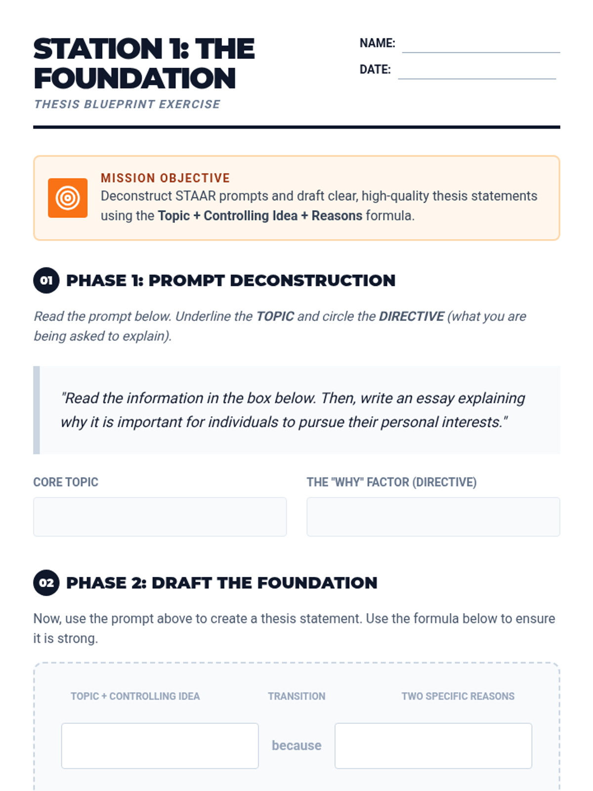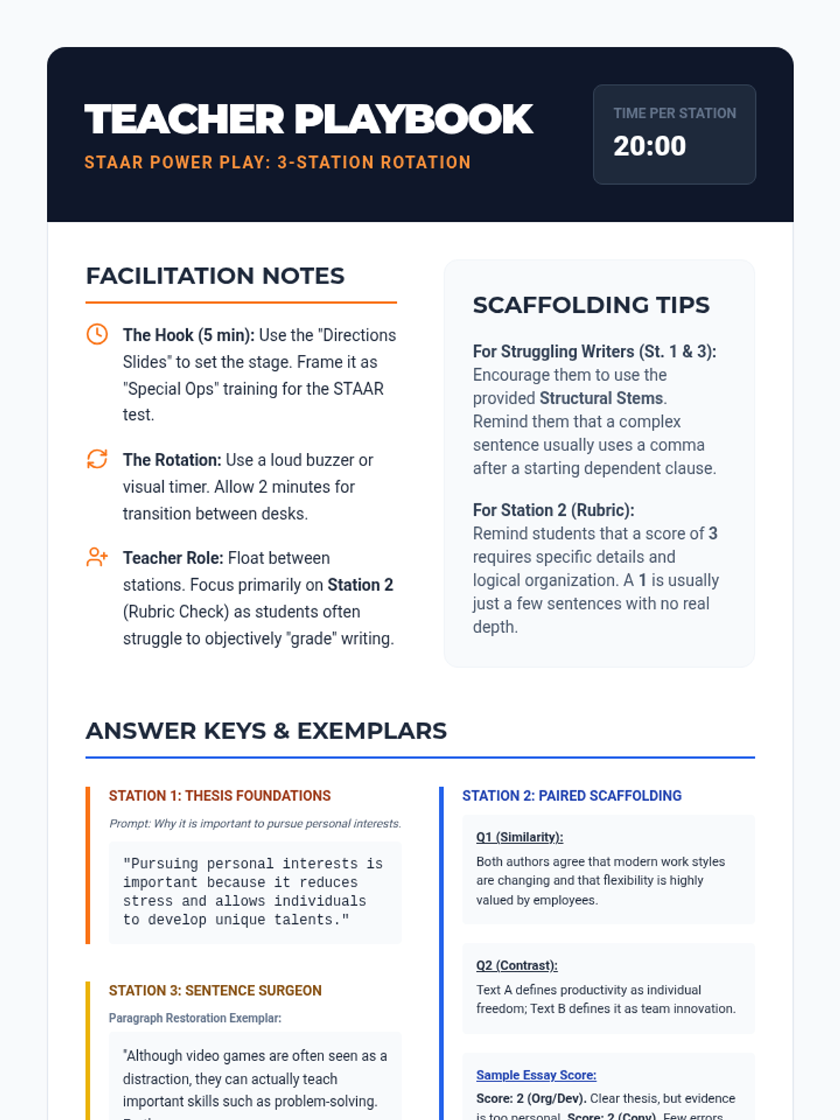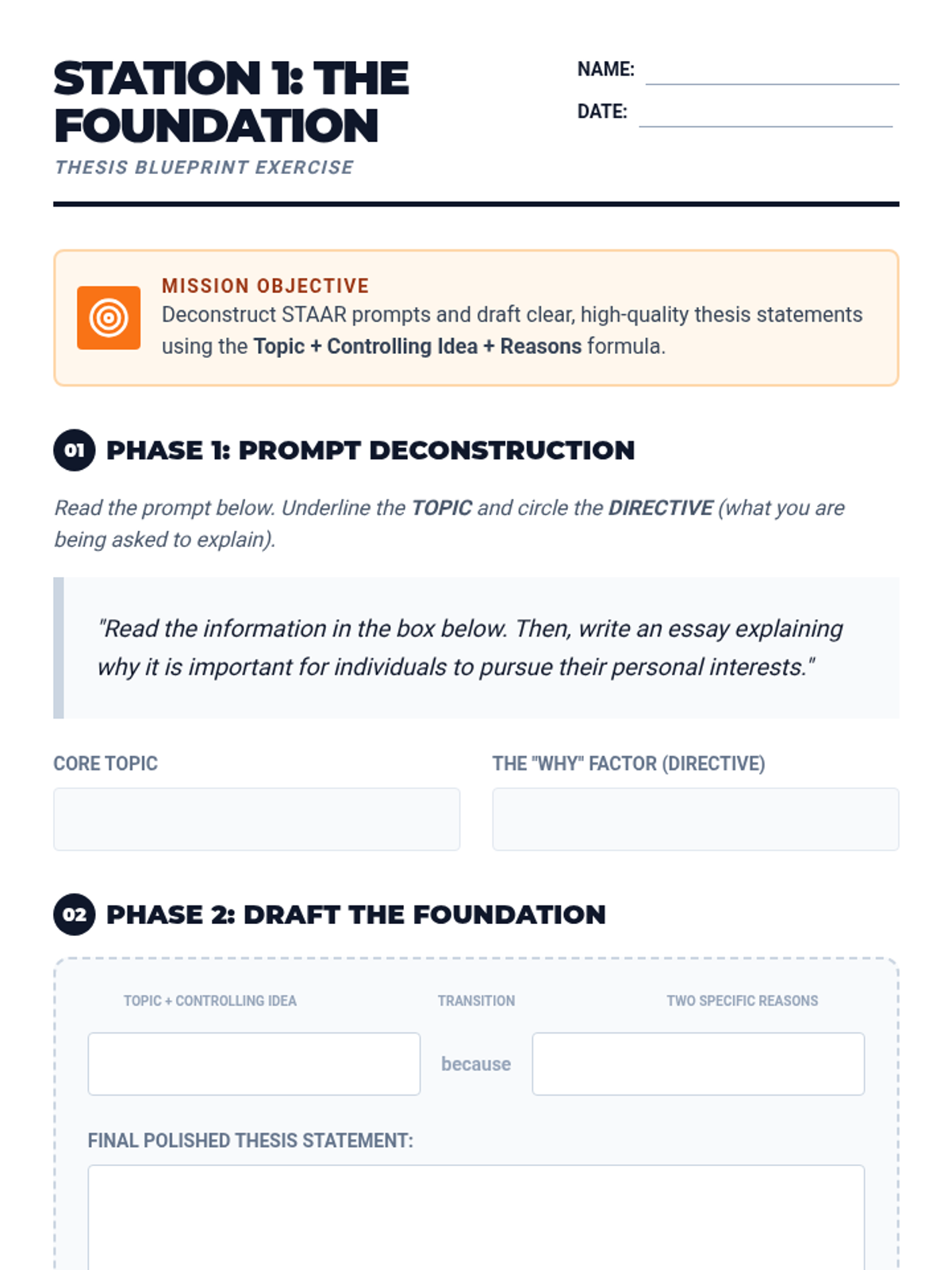 A series of three high-intensity stations designed to prepare students for the STAAR English assessment, focusing on thesis development, paired passage analysis, and sentence combining.