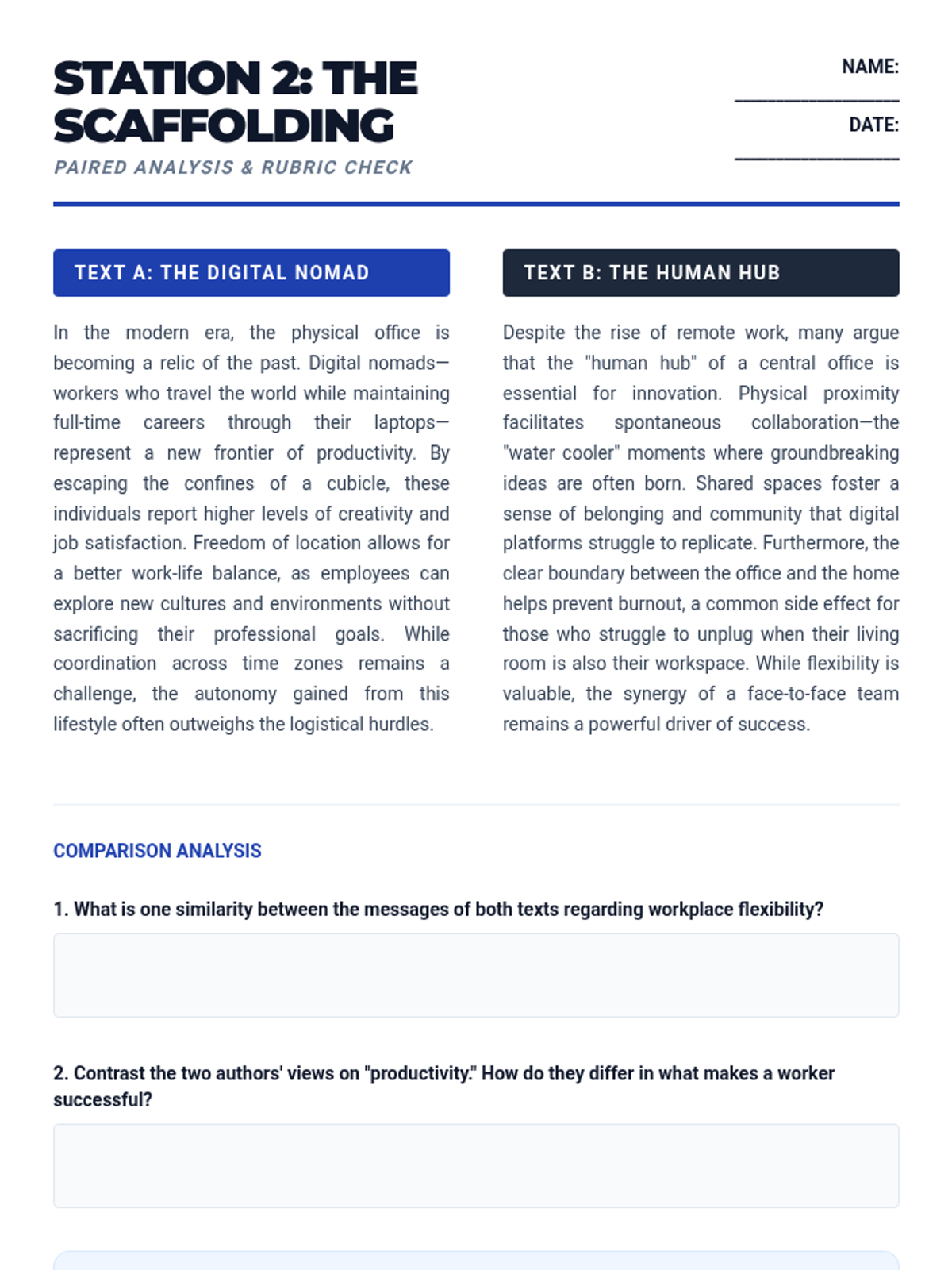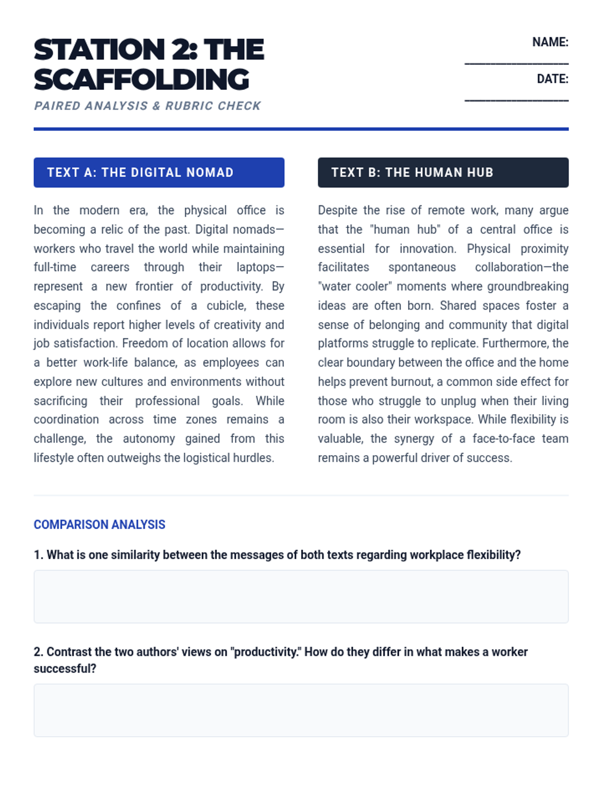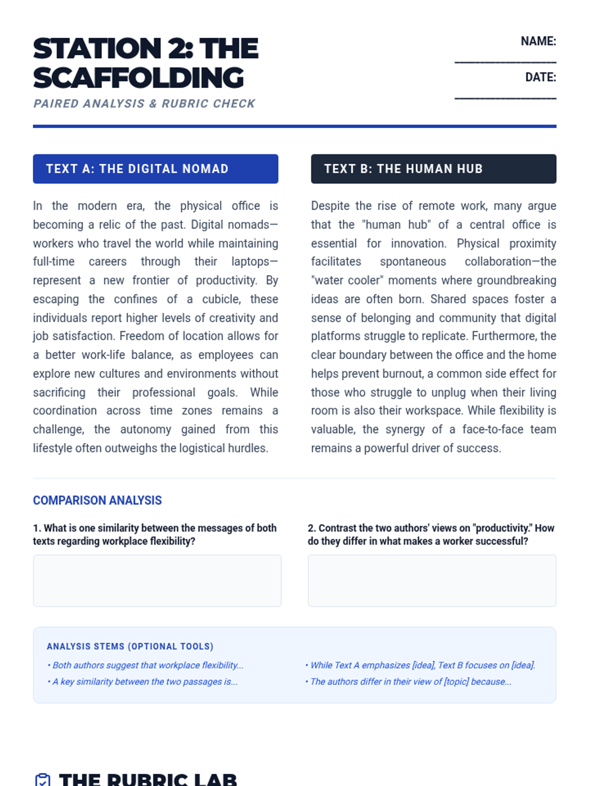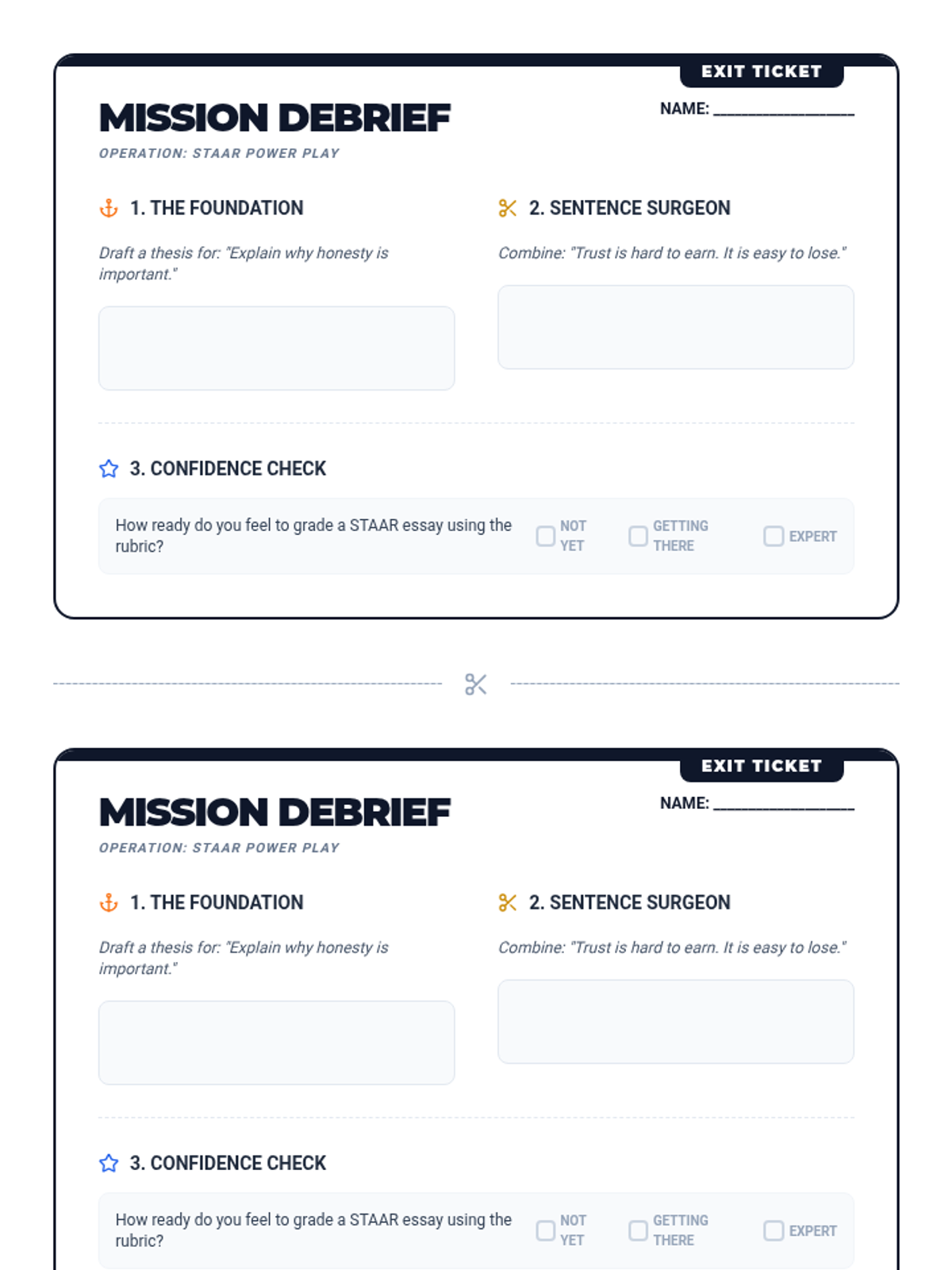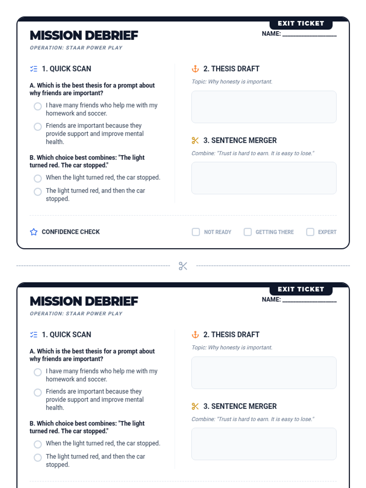 A series of three high-intensity stations designed to prepare students for the STAAR English assessment, focusing on thesis development, paired passage analysis, and sentence combining.