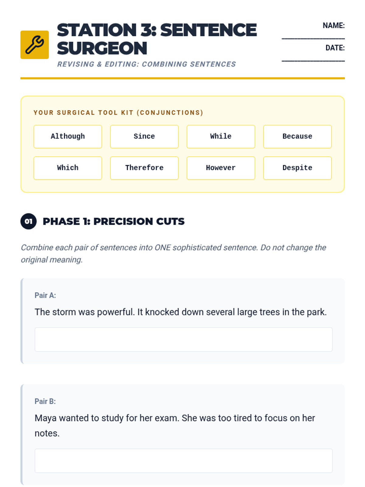 A three-part grammar intensive for 8th graders focusing on the mechanics of compound and complex sentences through architectural-themed practice and application.