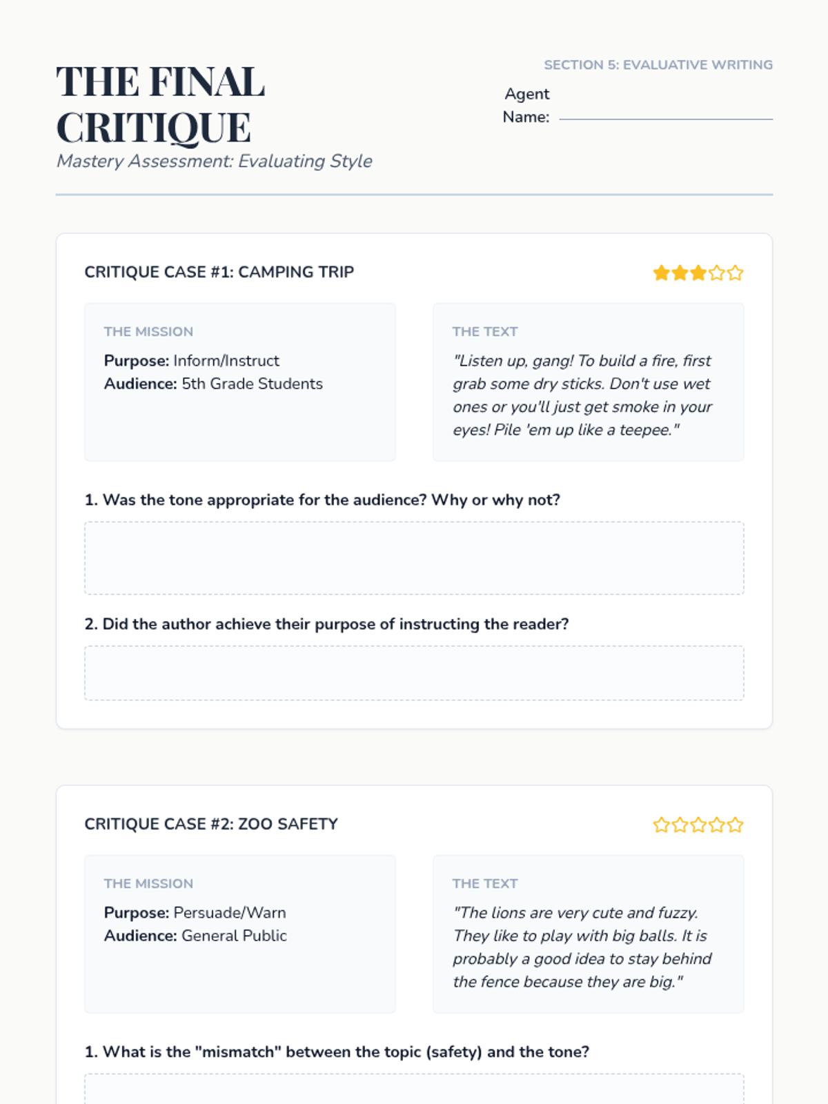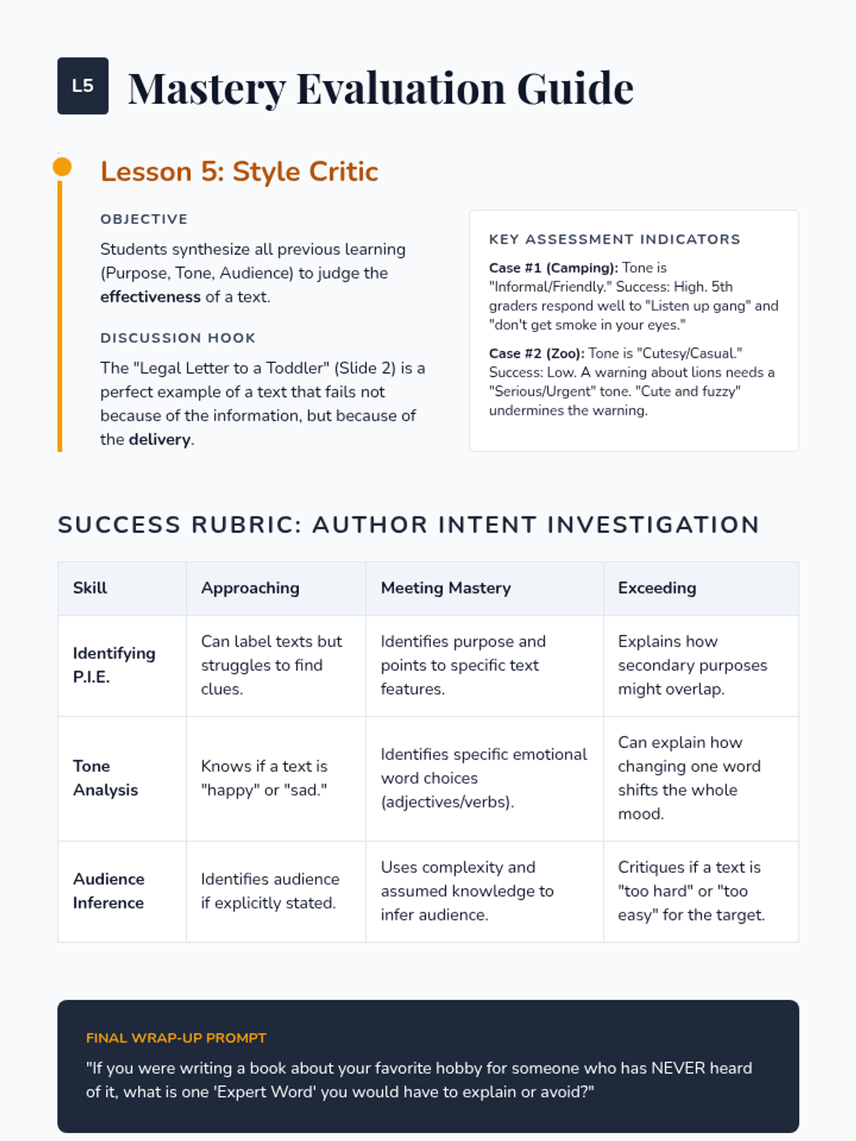 A 5th-grade ELA sequence that explores how an author's purpose and intended audience shape the tone and style of informational texts through comparative analysis and critical investigation.