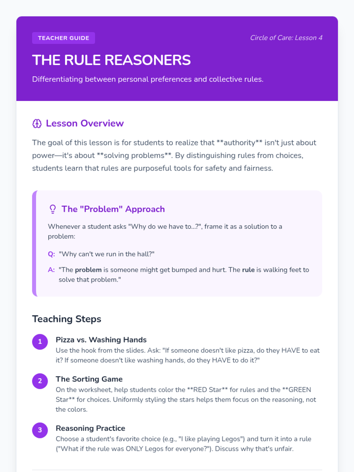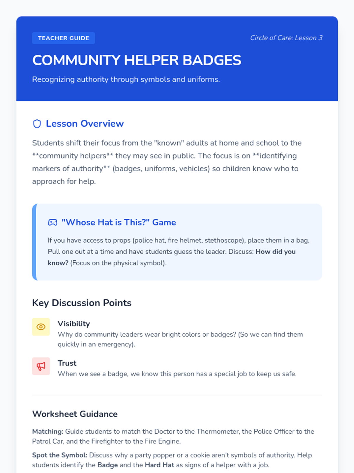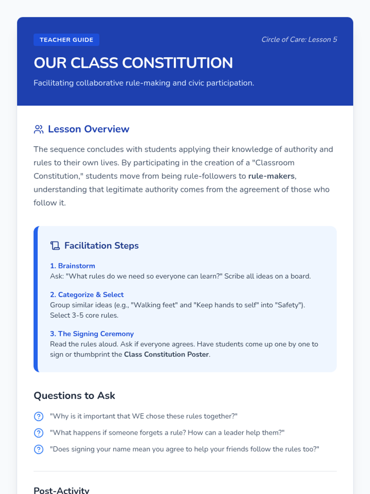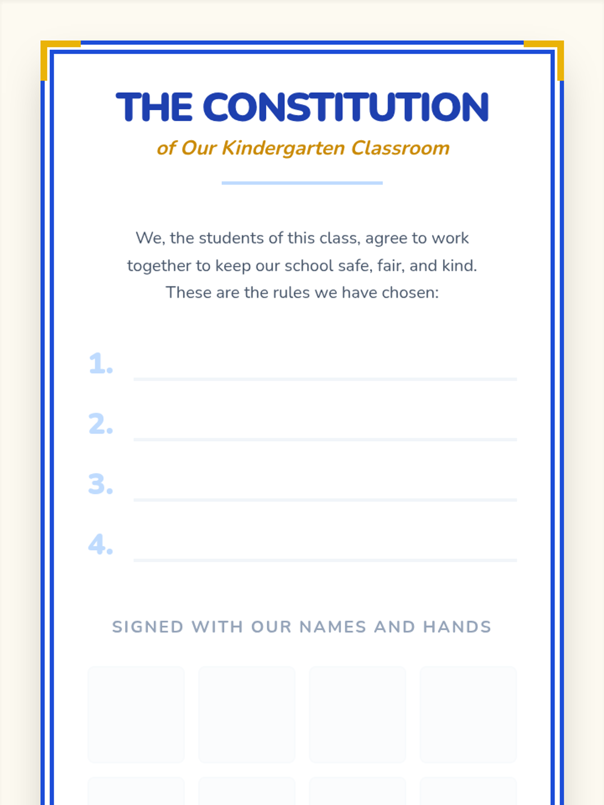 A Kindergarten civics sequence that introduces the concept of authority figures and the purpose of rules at home, in school, and in the community. Students learn why rules exist for safety and fairness, and conclude by collaboratively creating a classroom constitution.