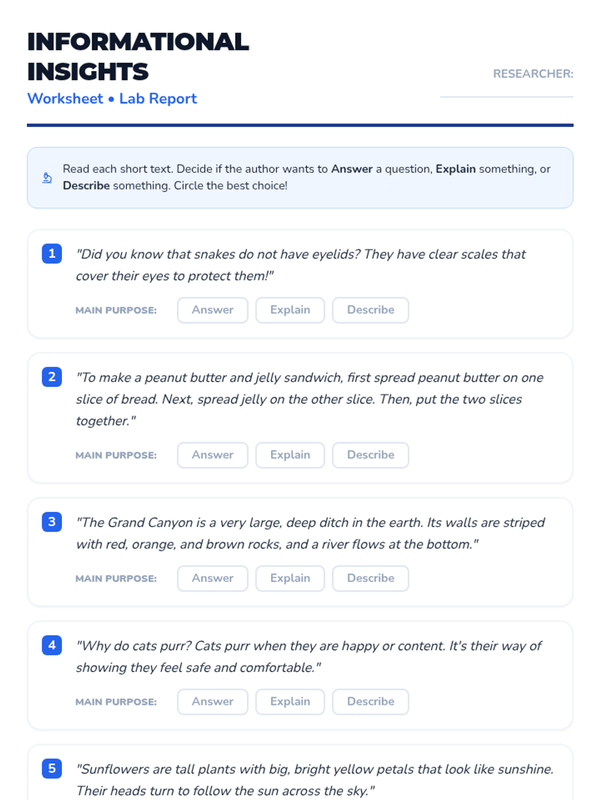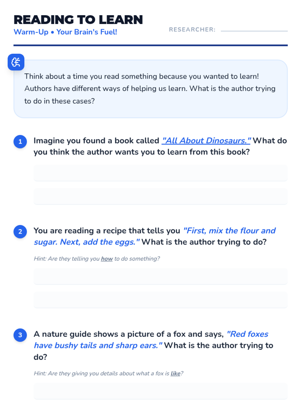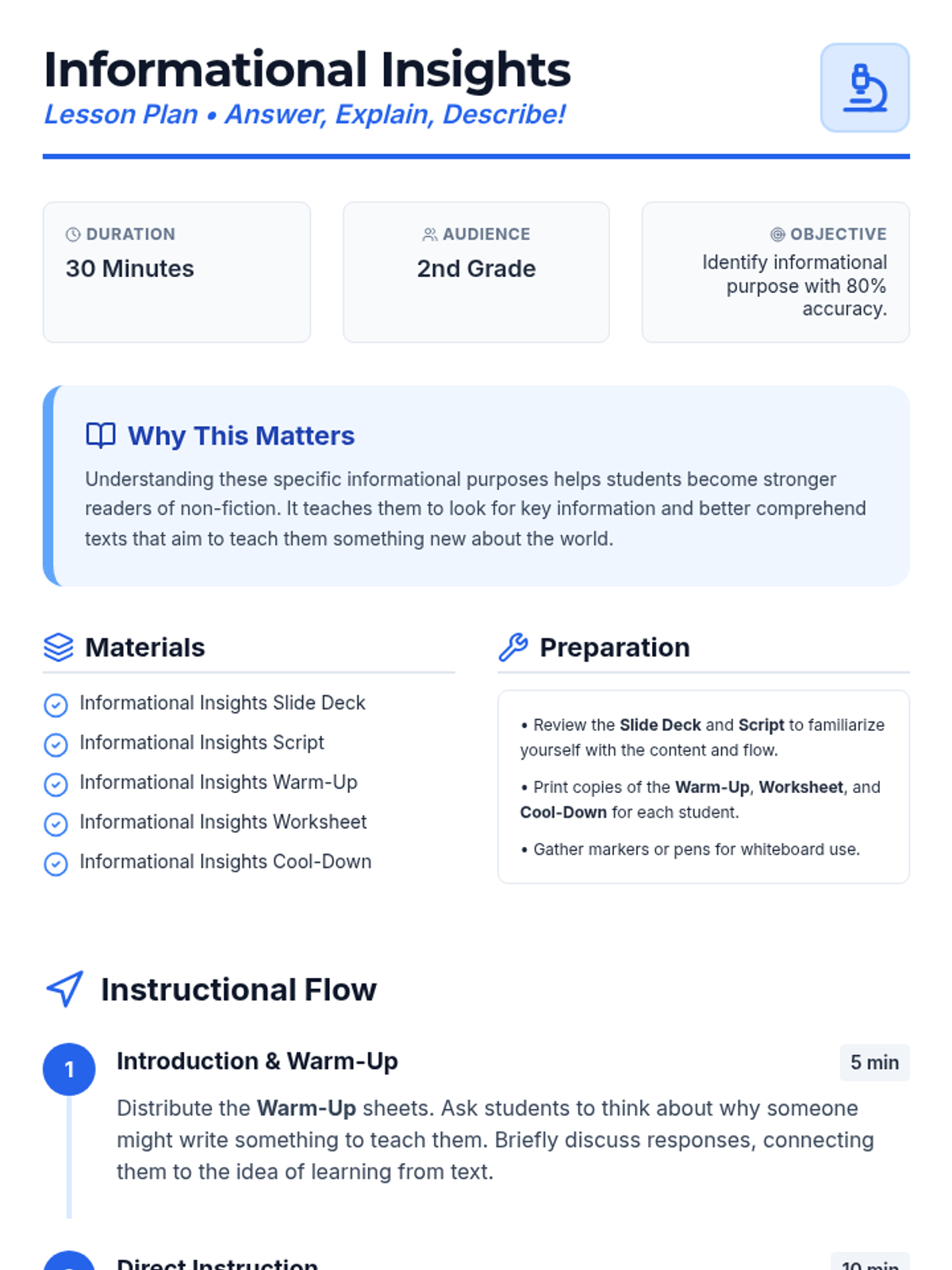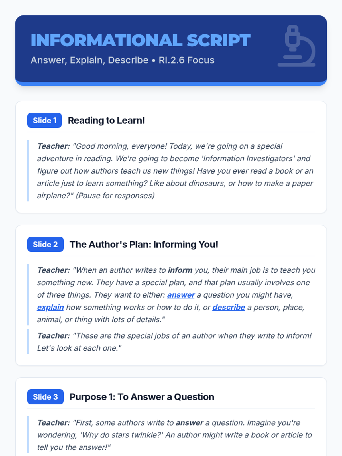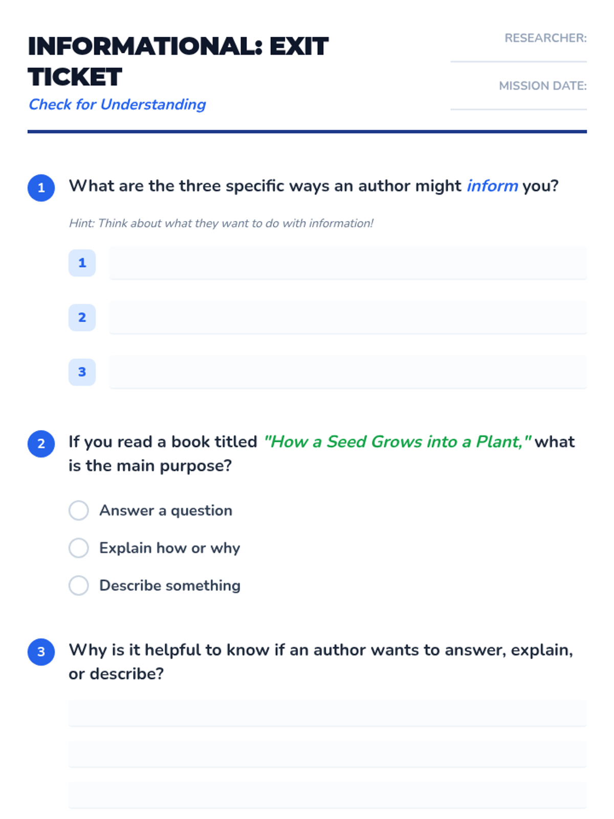 A comprehensive sequence for 2nd grade students to master identifying an author's purpose. Students first learn the PIE framework (Persuade, Inform, Entertain) and then dive deeper into informational texts to determine if an author is answering a question, explaining a process, or describing a topic.