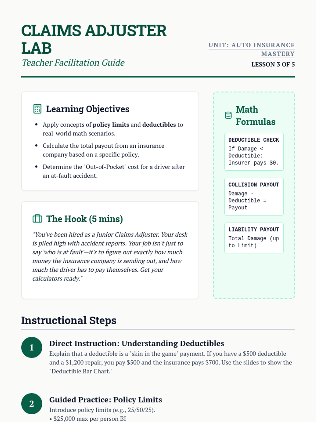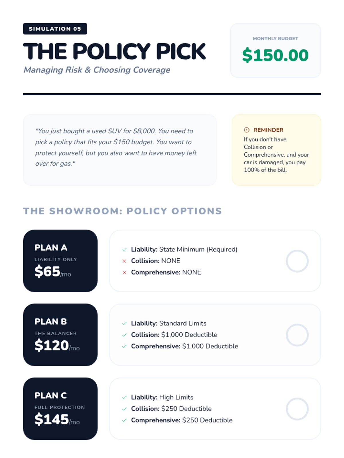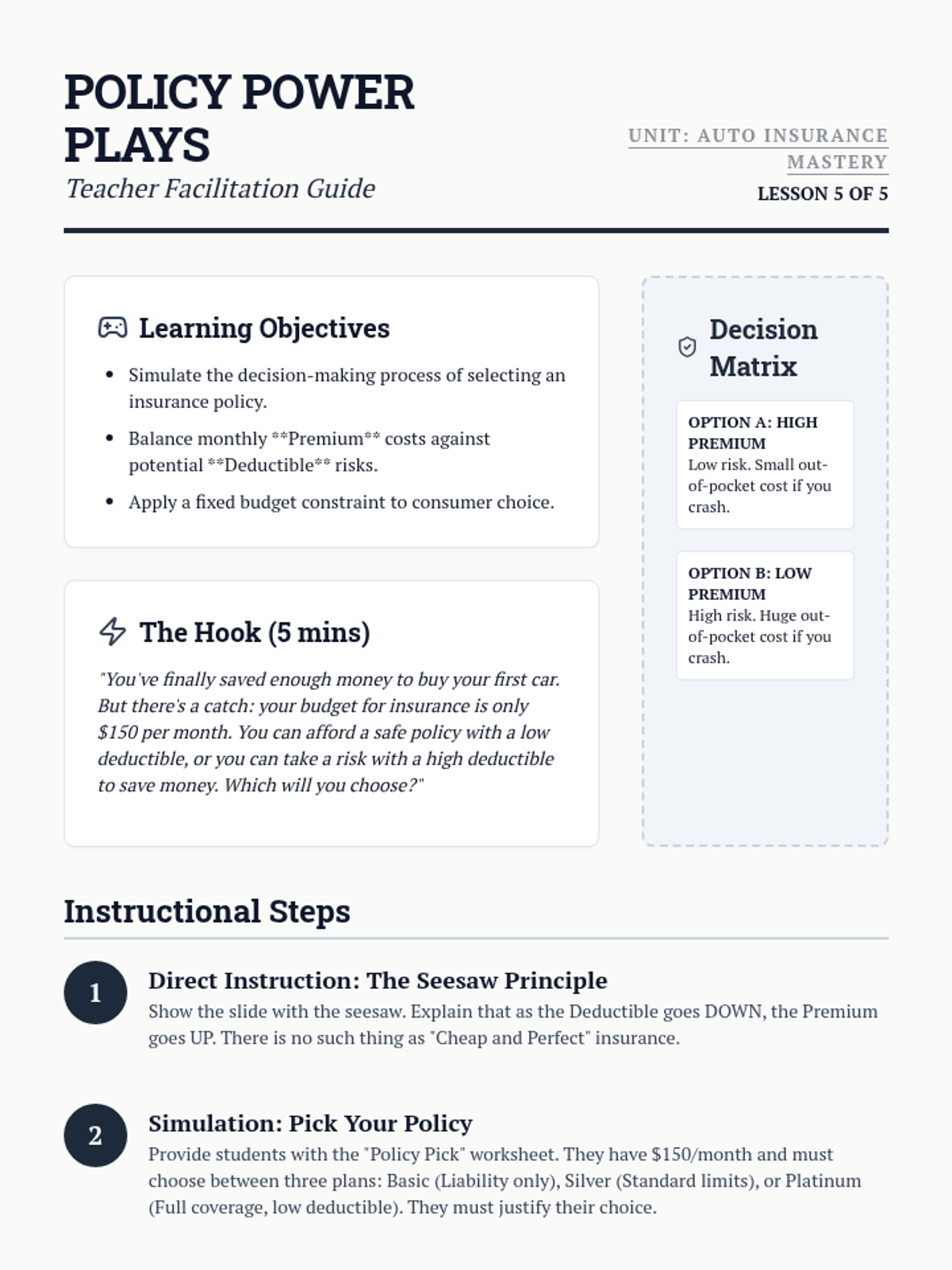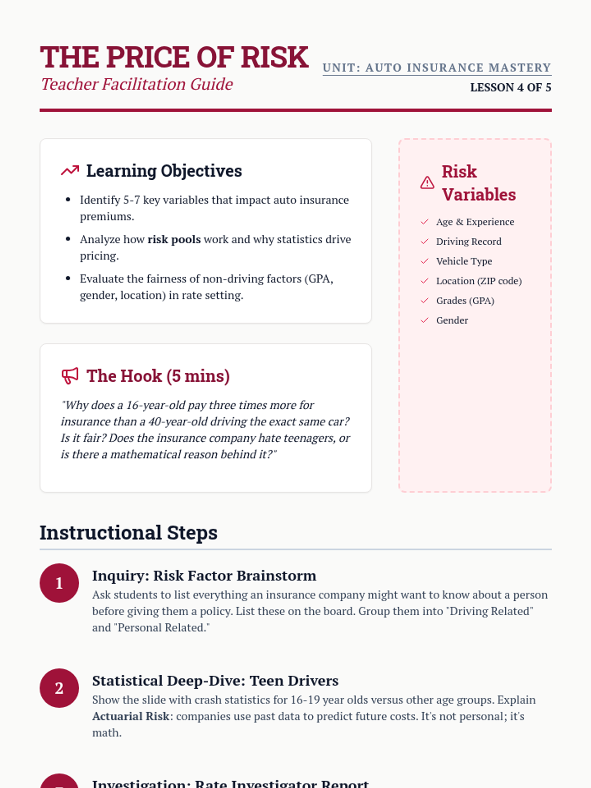A comprehensive 7th-grade financial literacy sequence focused on auto insurance. Students learn about liability, collision, and comprehensive coverage through case studies and simulations, culminating in an investigation of how individual factors influence insurance rates.