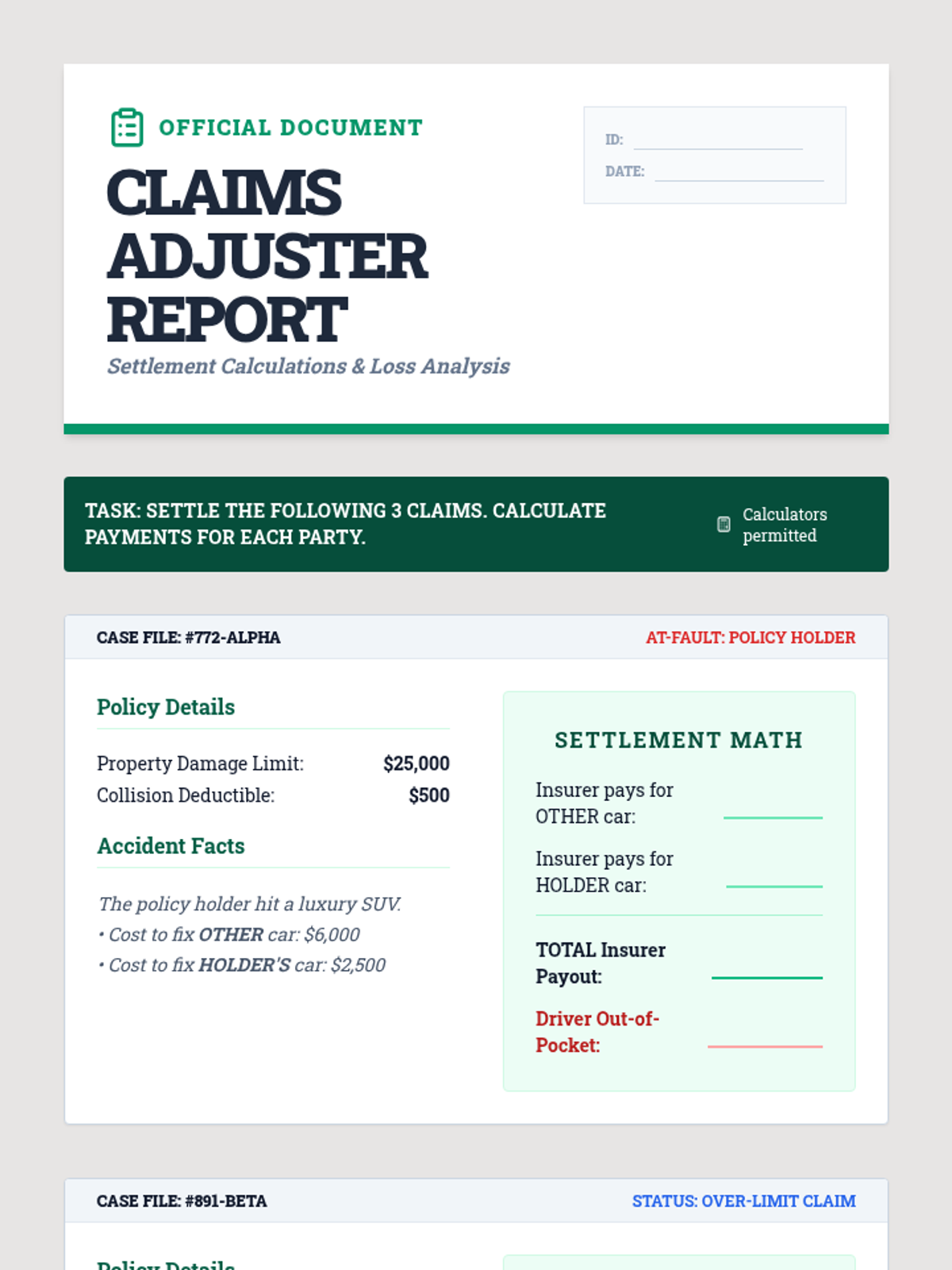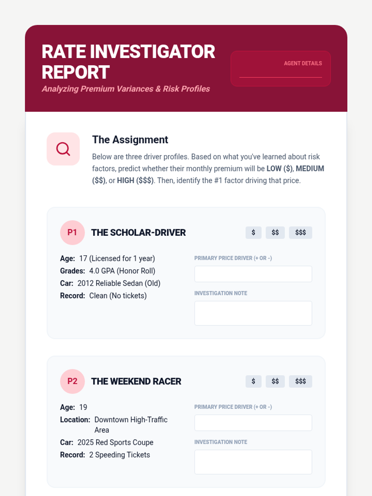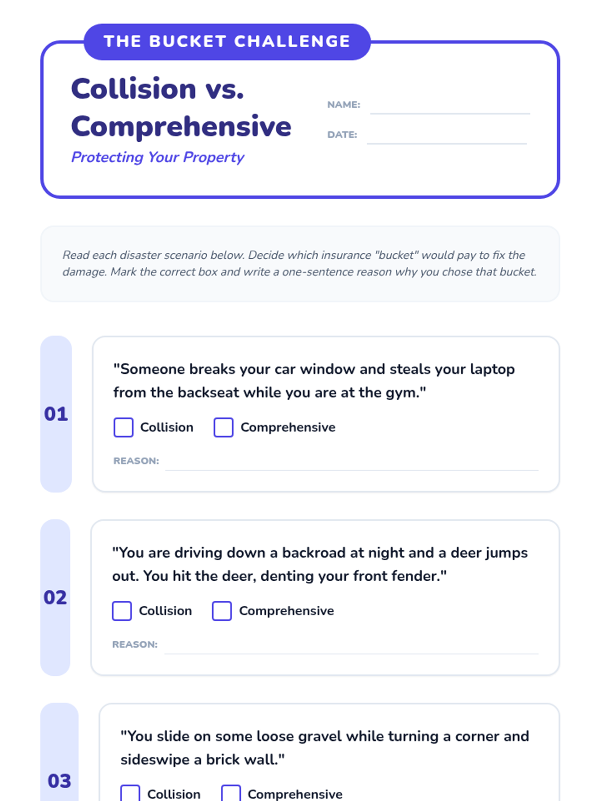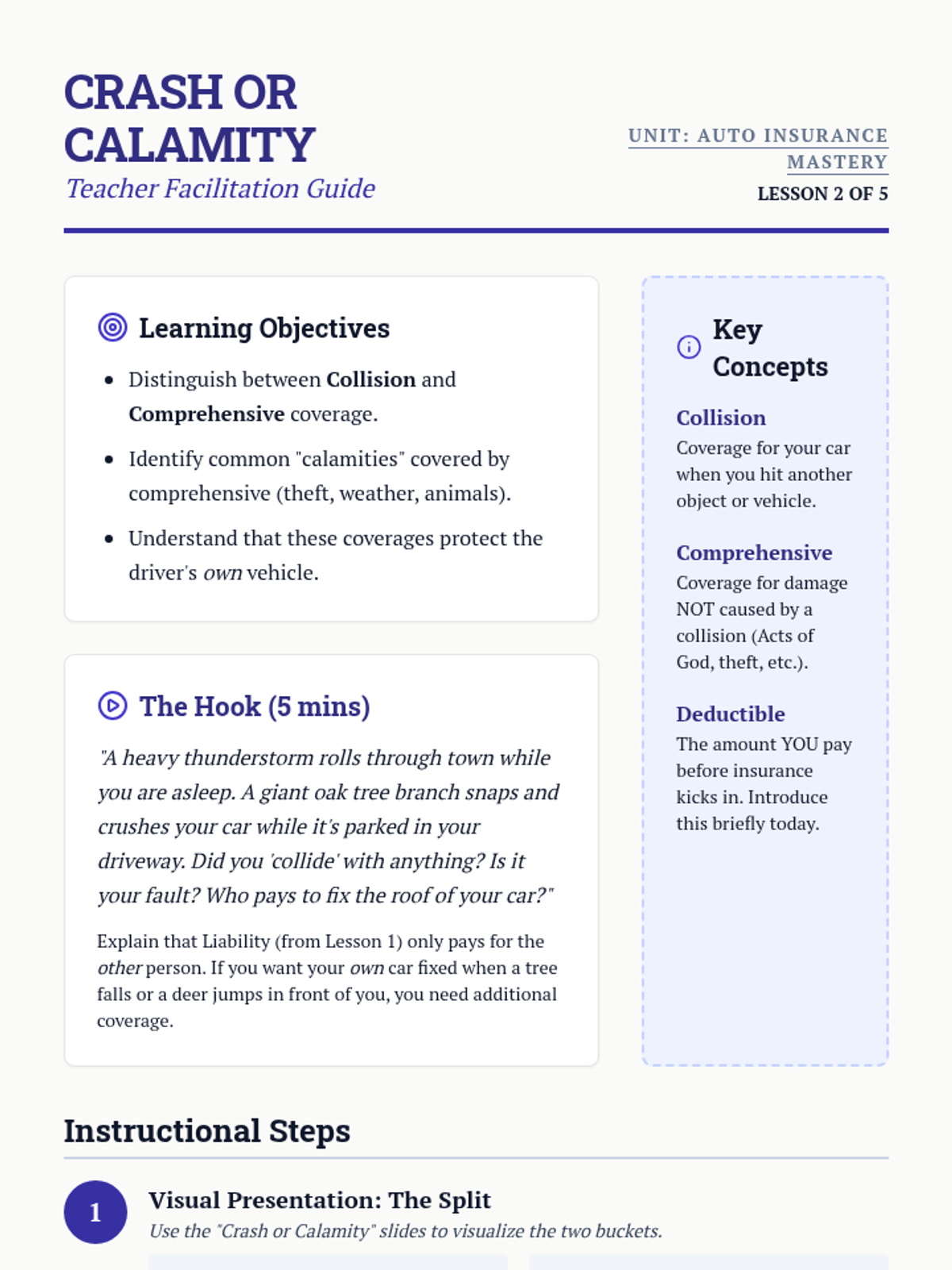 A comprehensive 7th-grade financial literacy sequence focused on auto insurance. Students learn about liability, collision, and comprehensive coverage through case studies and simulations, culminating in an investigation of how individual factors influence insurance rates.