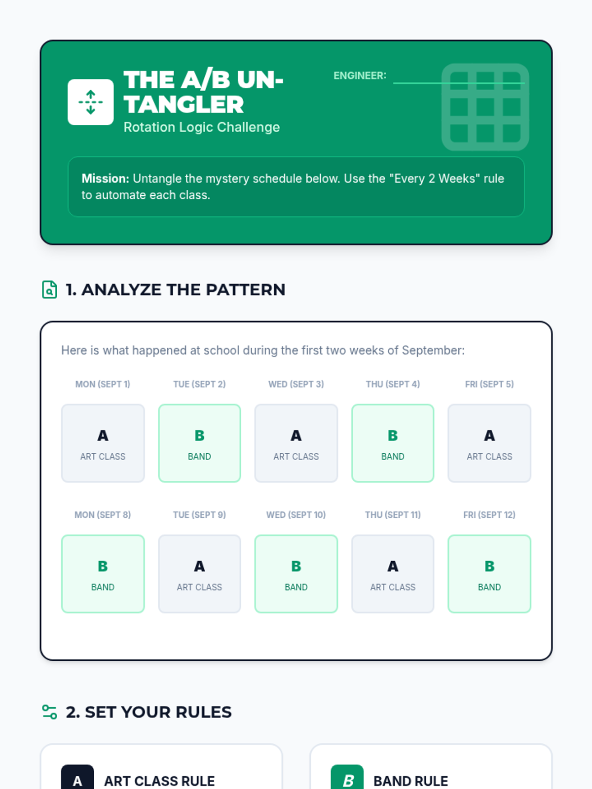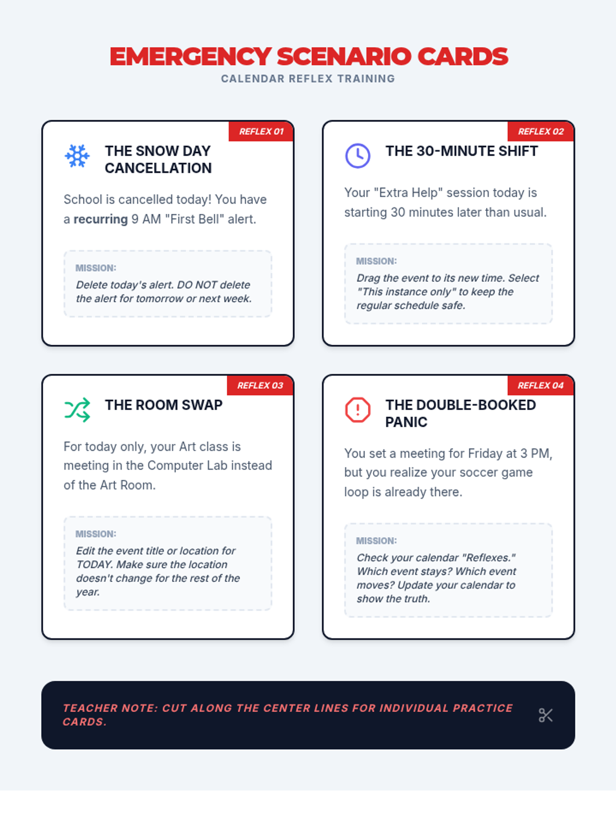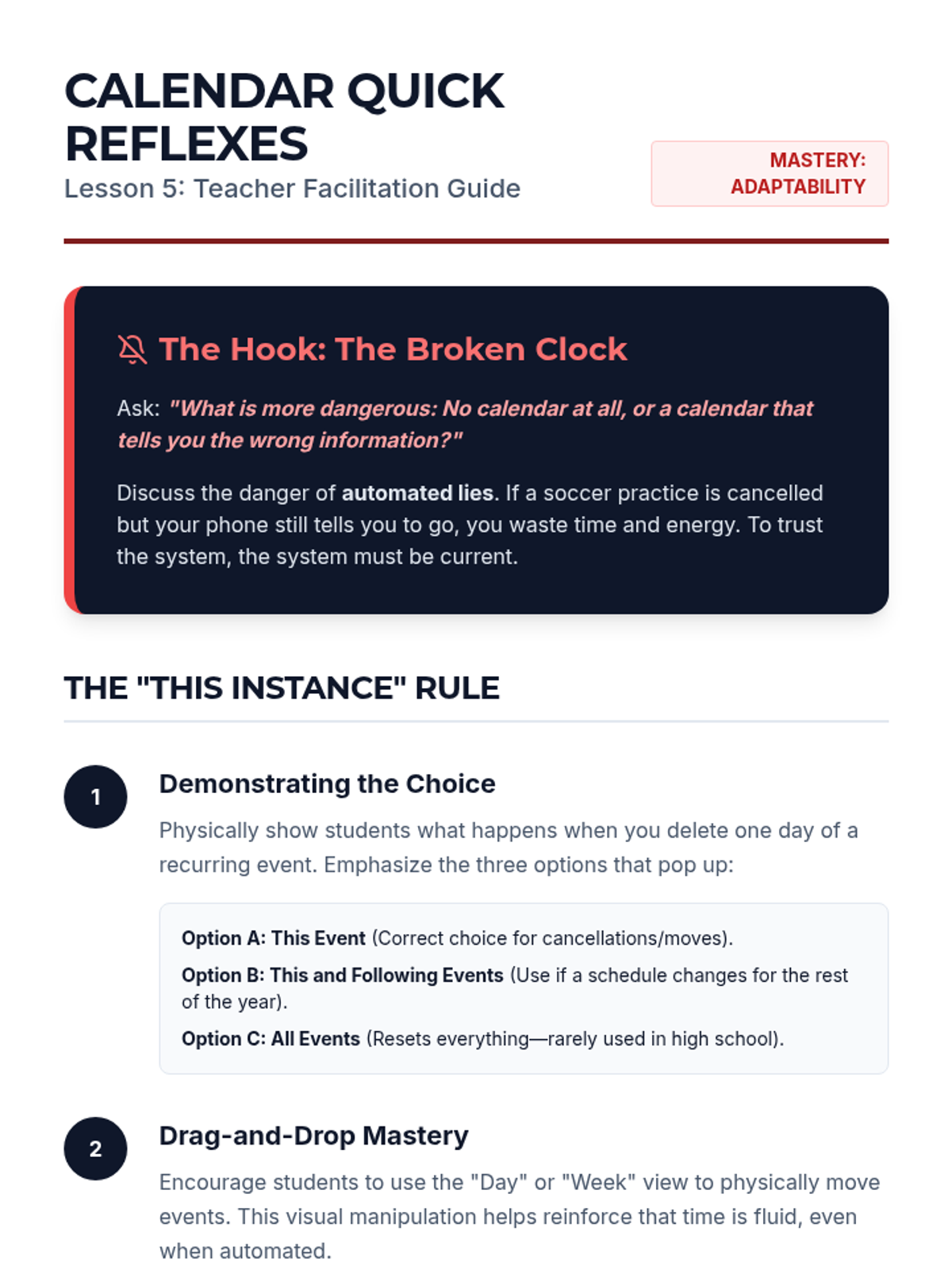 A specialized sequence for 9th-grade students focusing on using digital calendar automation (recurring events and smart alerts) to support executive function and memory. Students move from basic repetition to complex A/B scheduling and multi-layered reminder systems.